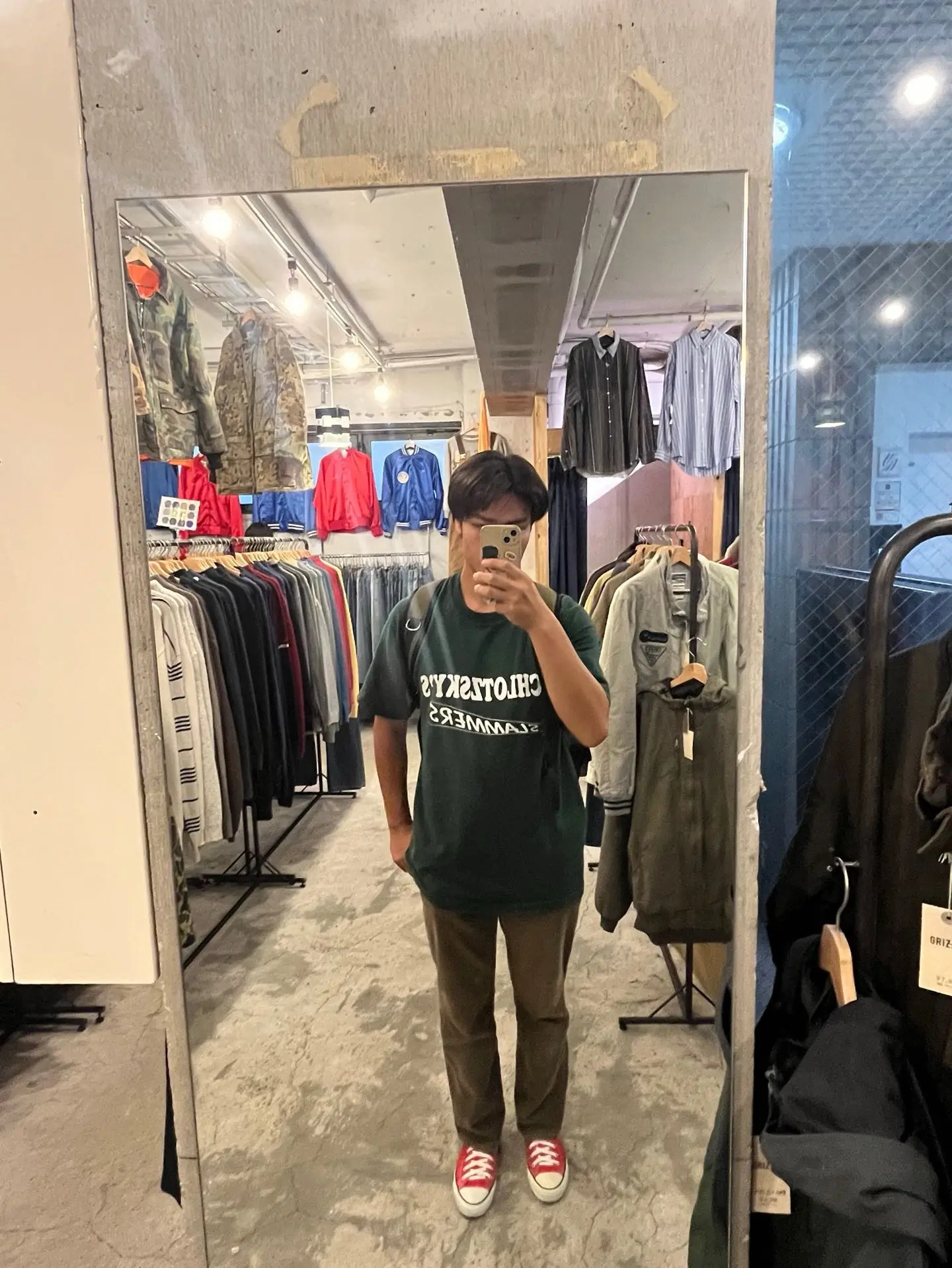 #緑Tシャツ #コーデュロイパンツ #赤CONVERSE