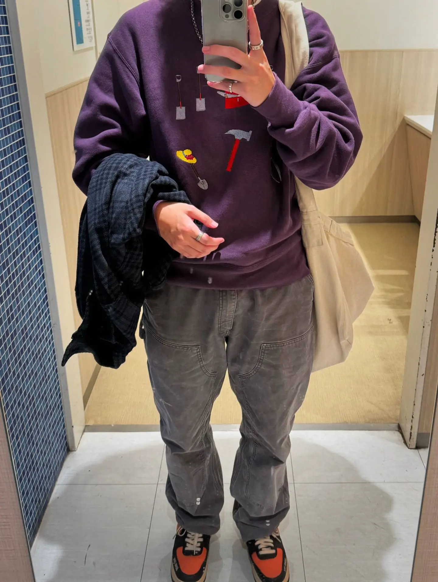 パープルのスウェット、ブラックのネルシャツ、グレーのパンツ、オレンジのスニーカーを合わせた大人カラーコーデ。 めちゃくちゃついでに手抜きで撮った写真なのでなんか微妙な感じですがとりあえず残しておきたいと思ってショッピングモールの鏡をお借りしました。 全体的な色は暗めのトーンですが、スウェットのデザインの可愛さとスニーカーのオレンジが差し色っぽくなっているので重すぎない雰囲気になるようにコーデを組んでみました。 Leeのスウェットは買ってから一度も着れてなかったのでやっと着れてテンション上がりました。 家にもちゃんと写真撮れるような大きめの鏡ほしいな。 トップス:#lee アウター:#orvis パンツ:#carhartt アクセサリー:#chromehearts シューズ:#nike #メンズコーデ #メンズファッション #トレンド #冬コーデ #古着 #服好きな人と繋がりたい #ファッション好きな人と繋がりたい #オシャレさんと繋がりたい #キレイめカジュアル #大人カジュアル #今日のコーデ #古着mix #古着ディグ #スウェット #ネルシャツ #ダブルニー #アメカジ