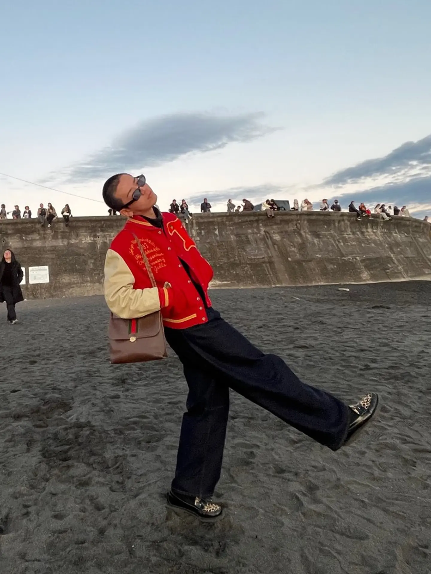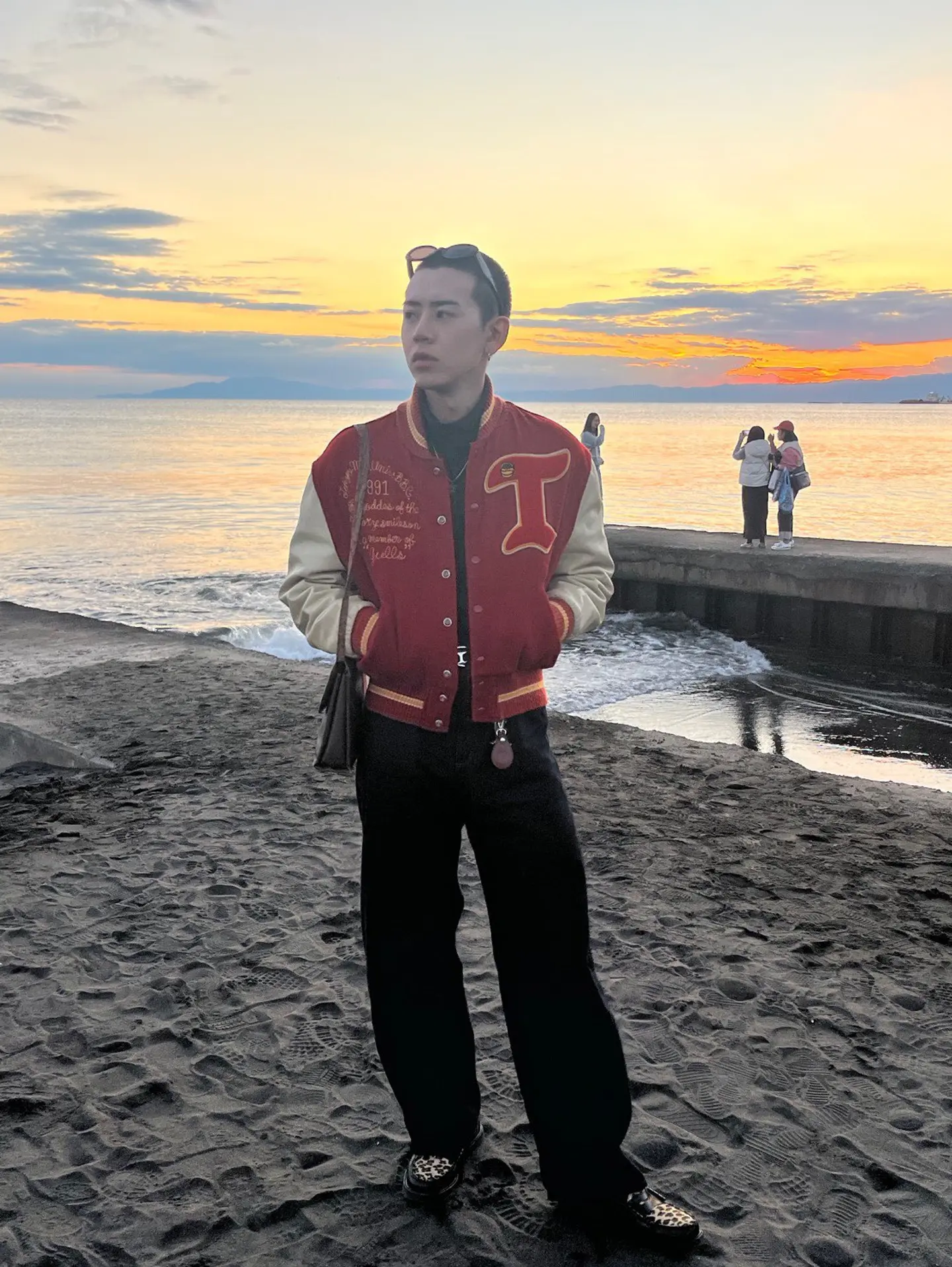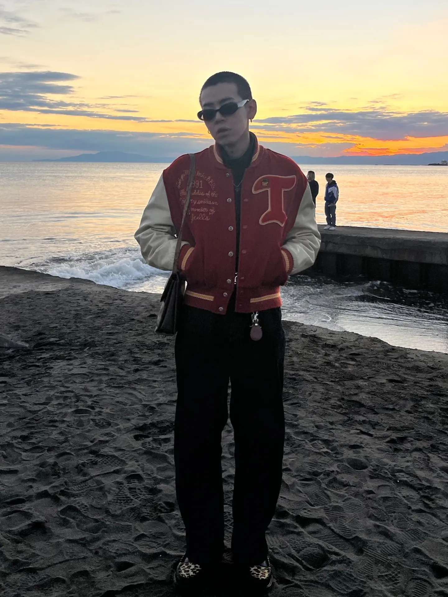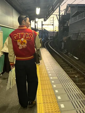 オヤジのスタジャン 足元は弊社のバレルレッグ あんま見えないけどべるとはでーぜる ばっぐはぐってぃ #ootd #used #海外ストリート#みたいな