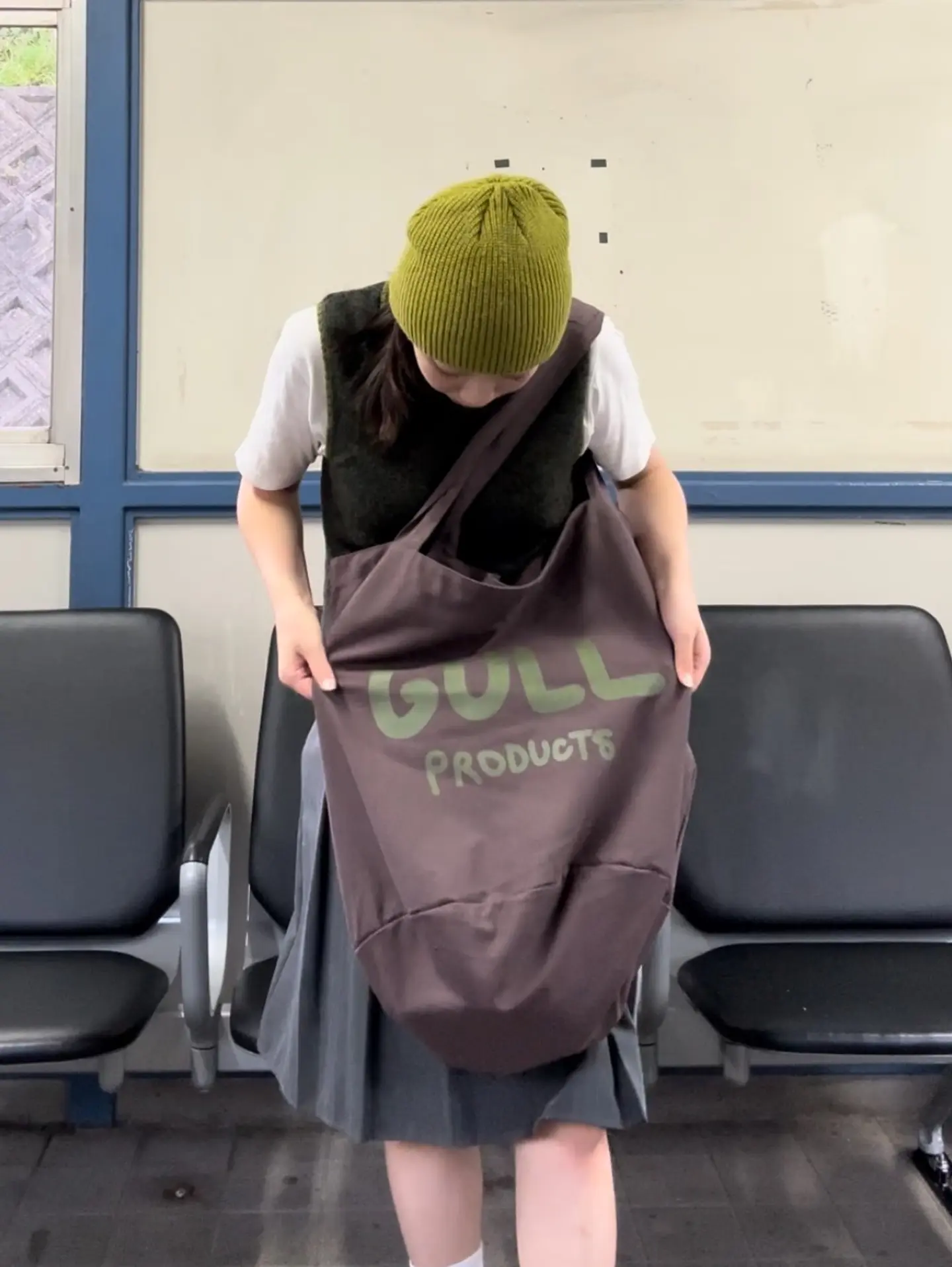 緑で合わせたコーデ🦖🦎🐢🐸🌿 GULLのバッグが大容量でアウターとか入れられるのでおすすめ!!