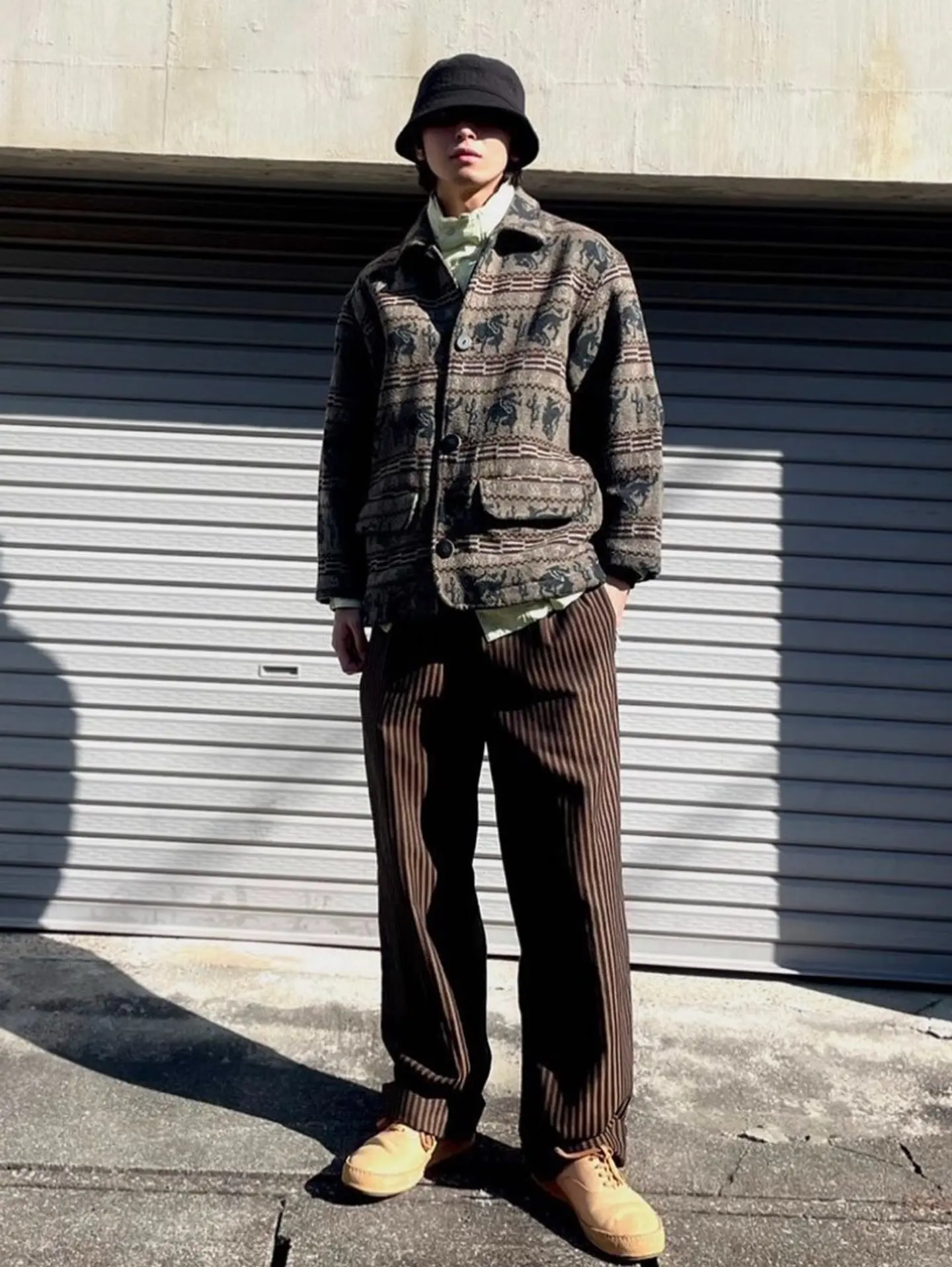 エスニック調のジャケットをメインにアースカラーでストリートの雰囲気に落とし込んだスタイリング。🌲 全体的にトーンが低いので差し色に蛍光色のナイロンジャケットを入れてみました。 #henderscheme#vintage#use#古着