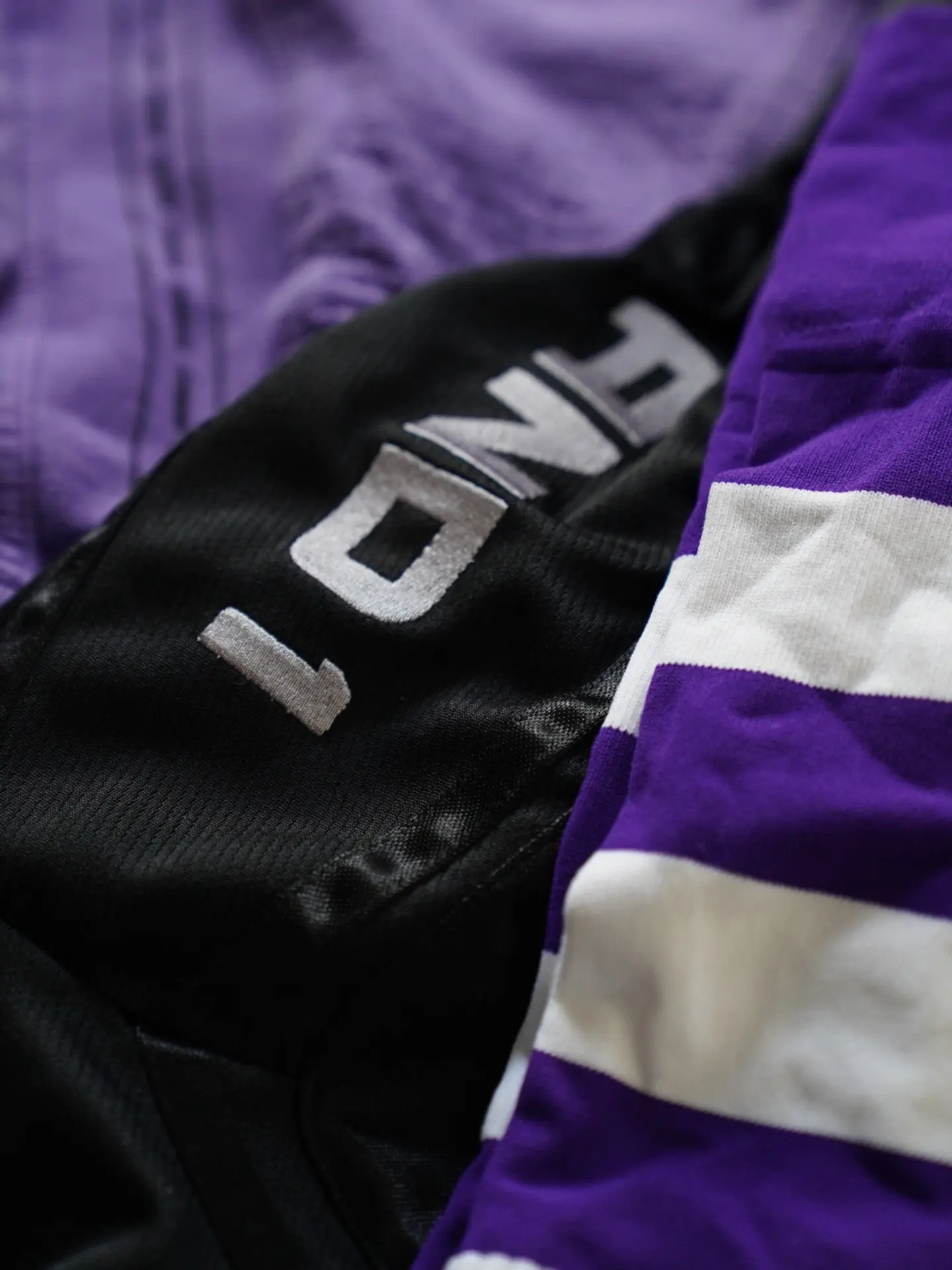謎のユーロ製パープルスウェットに合わせる、謎のフットサルソックスとクソデカバスケショーツ 足元にはオークリーを合わせてツートーンに 🟣🐦⬛の合わせは中毒性あり #スポーツmix #ヨーロピアン