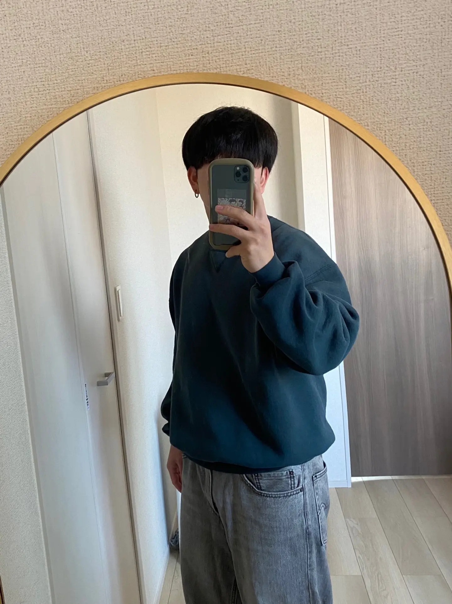 シンプルなコーデ カラーの良い90年代のRUSSELLATHLETICのスウェットに 先染めのLevi'sのワイドパンツを合わせたコーデ #90s #古着