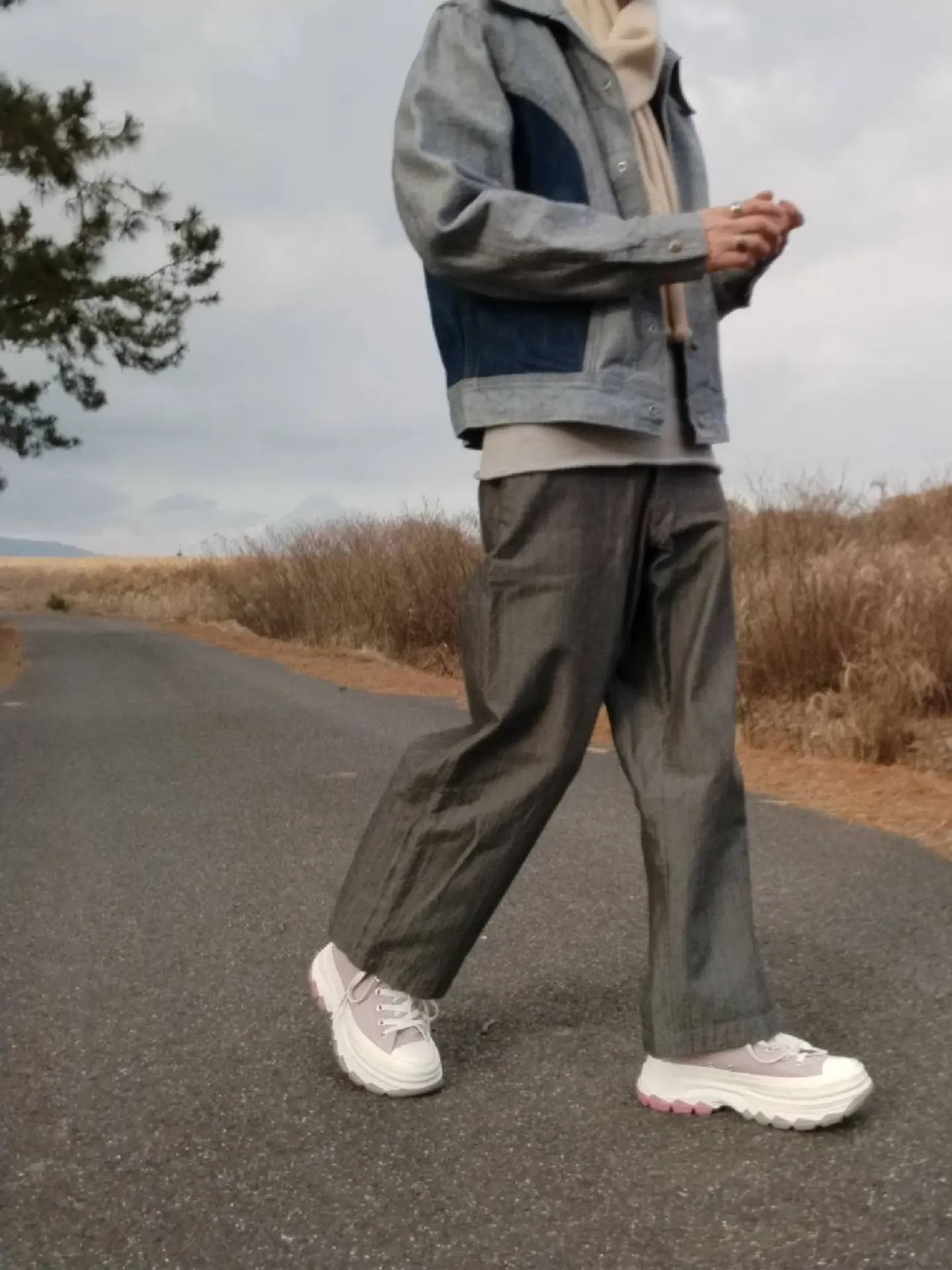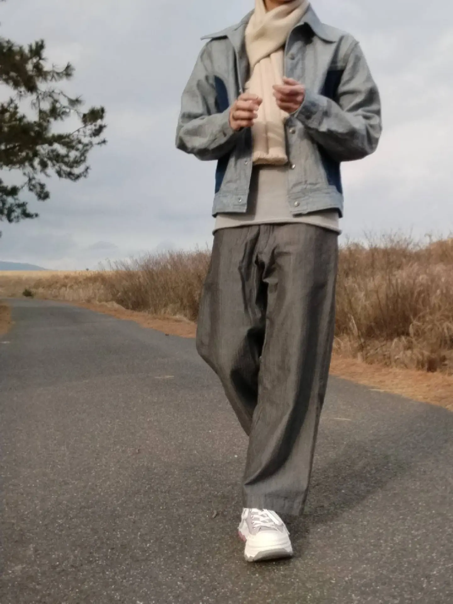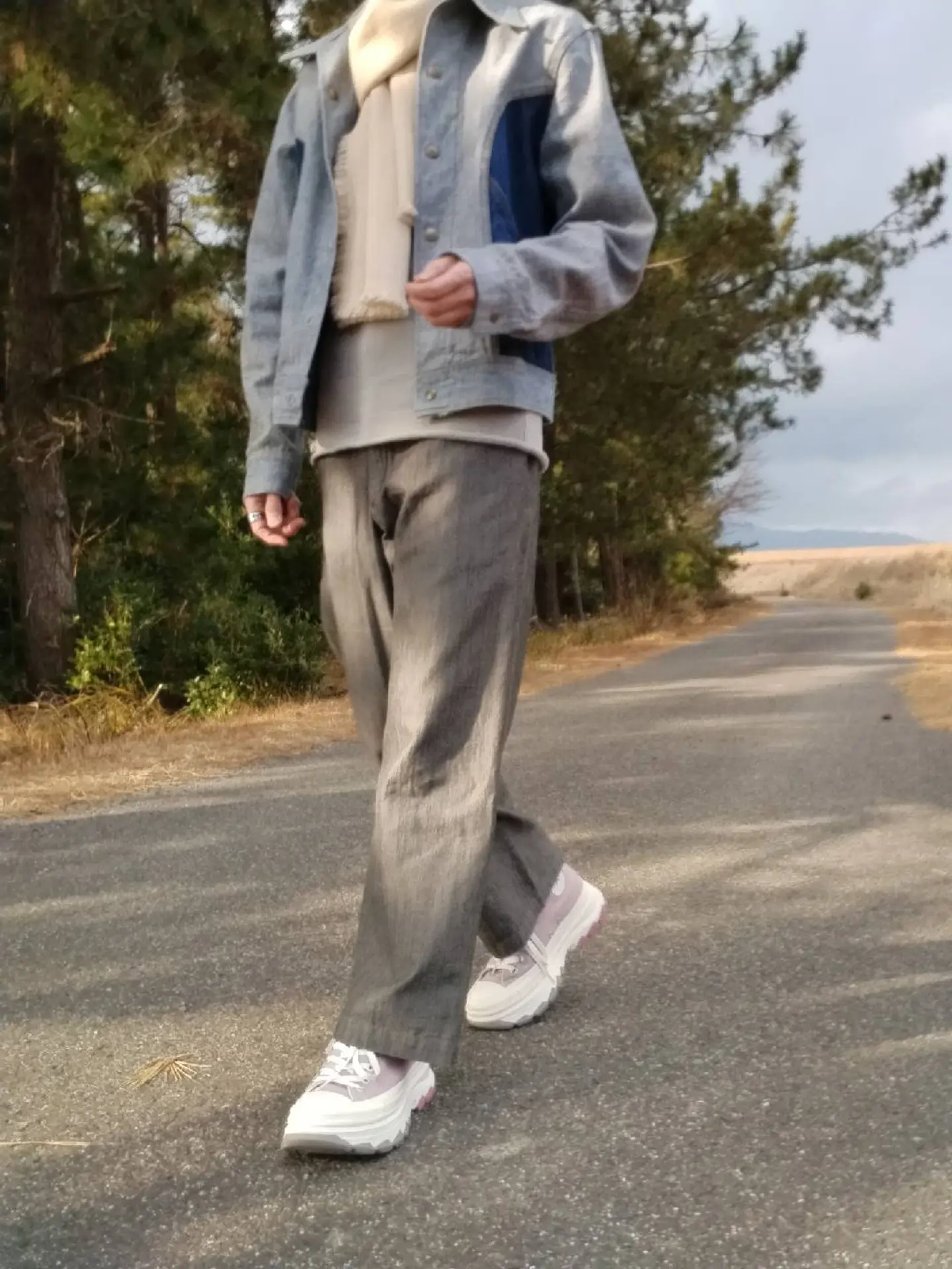 コーデ #deniscolomb #cashmere #stole #lee #reversible #denimjacket #motherhandartisan #knit #frenchwork #HBT #trekwave #converse #トレックウェーブ