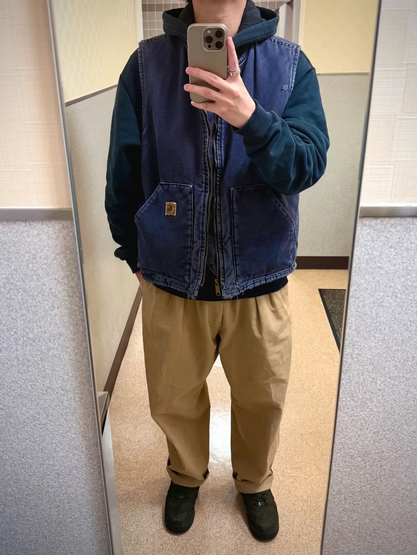 ブラックのパーカー、ネイビーのベスト、ベージュのチノパン、カーキのスニーカーを合わせたストリート風コーデ。 ショッピングモールのトイレの鏡をお借りしての撮影です笑 なんかパーカーだけやったらまだ肌寒いなーって感じの時にカーハートのベストはちょうど良くて重宝してます。 ポロチノもサイズちょっと大きいけど太さはええ感じ。 スニーカーはたまにしか履かんけどビリーアイリッシュコラボのAF1。 トップス:#nike アウター:#carhartt パンツ:#poloralphlauren シューズ:#airforth1 アクセサリー:#chromehearts #メンズコーデ #メンズファッション #アメカジ #冬コーデ #古着 #服好きな人と繋がりたい #ファッション好きな人と繋がりたい #オシャレさんと繋がりたい #キレイめカジュアル #大人カジュアル #今日のコーデ #古着ディグ #パーカー #ベスト #チノパン #スニーカー