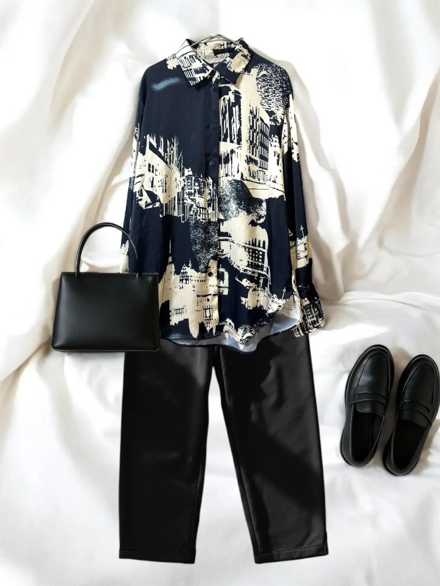 “きちんと感”も、“遊び心”も欲しい日に! モノトーンのアート柄シャツが主役の ちょっぴりモードな大人コーデ。 黒パンツとローファーで引き締めて、 シンプルなのにどこか印象に残る着こなしに。 きちんと感は欲しいけど、固すぎるのはイヤ。 そんな日にぴったりの1セット。 ⸻ ⭐︎item⭐︎ tops:アートプリントオーバーシャツ bottoms:ブラックテーパードパンツ shoes:ブラックローファー bag:ブラックミニバッグ(ハンド) ⸻ #アートシャツ #モノトーンコーデ #モードカジュアル #大人スタイル #フラットレイ #今日のコーデ #HAKYコーデ #きれいめカジュアル #柄シャツ好き storefront古着屋HAKY #古着