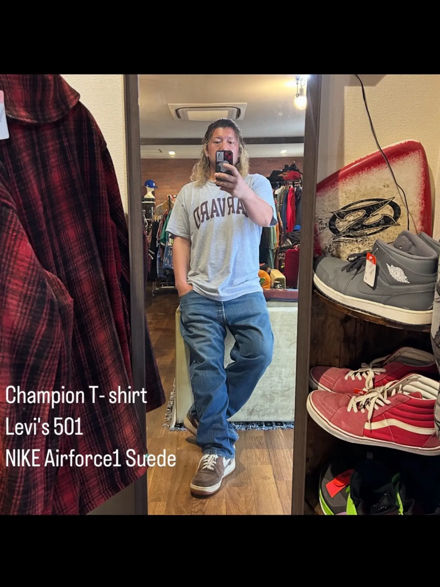 championのcollege T-shirtにLevi's 501を合わせてNIKEのAF1スエードでシンプルにまとめました٩( ᐛ )و #アメカジ #シンプル #デニム #カジュアル #古着
