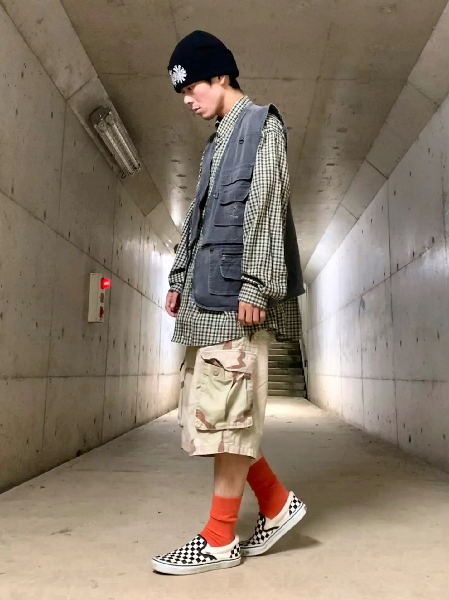 ベストとミリタリーパンツでコーデ組みました! 大きめなハーフパンツでストリートっぽさを出しつつ、ギンガムチェックとベストで古着感を出してます!#vintage #アメカジ #90s #ストリート #ミリタリー #カジュアル #vintage #古着 #ストリート #used #surift2025 storefront古着屋HAMA