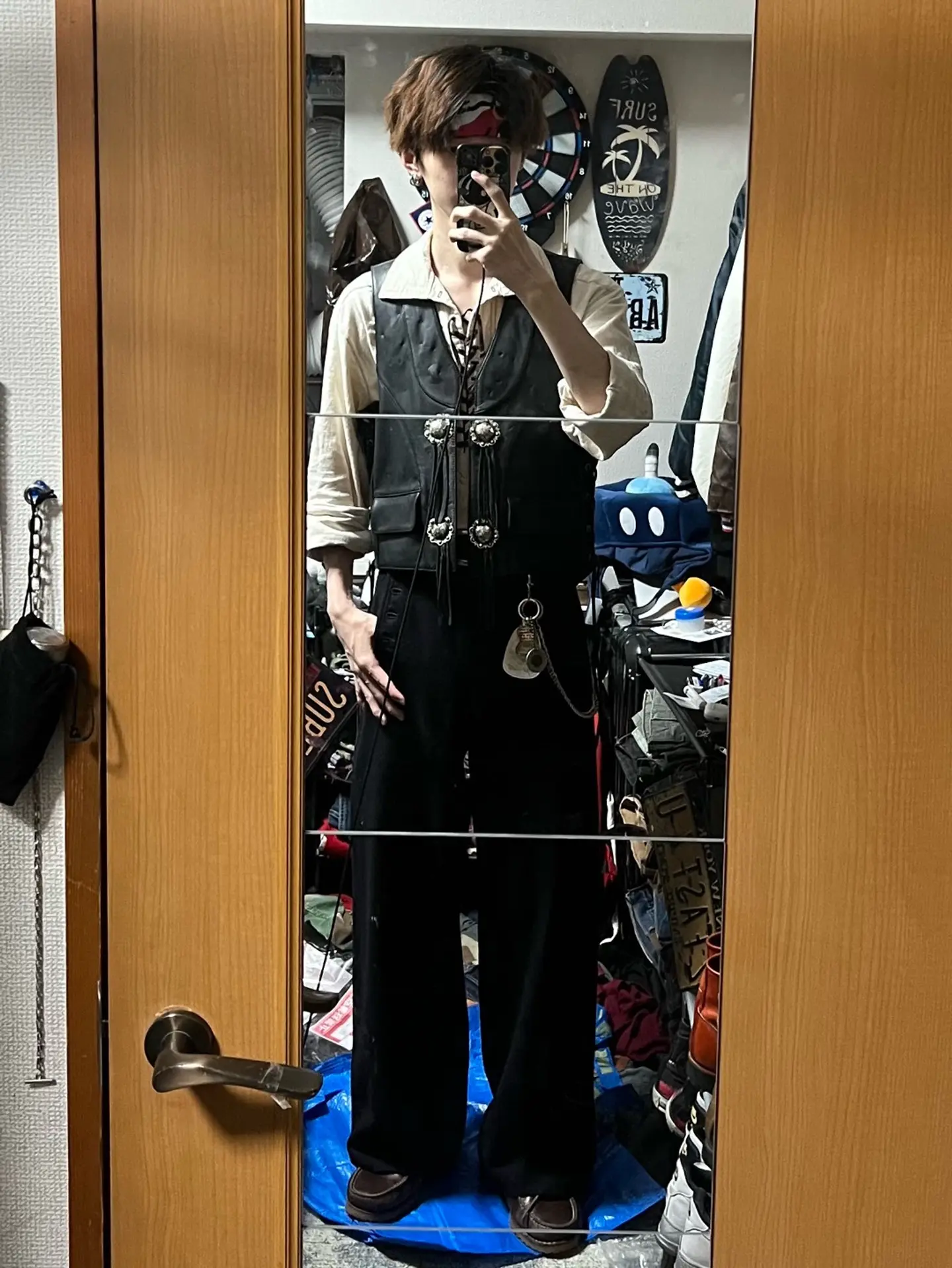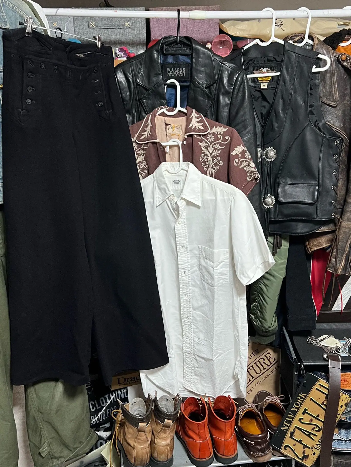 最近爆買いしたヴィンテージでずっとやりたかったユーロスタイル 90s Wilsons leather pelle studio tailored jacket. 手頃な価格のWilsonsの中でも高級ラインのpelle studioのレザーテーラード 40s Arrow dress shirt. 当時ドレスシャツメーカーで一流のArrowのロングポイントのドレスシャツ。マチ付きなのも嬉しすぎる。 90s Harley-Davidson leather best. 装飾えぐかわ 40s US Navy sailor trousers. ちょうど第二次世界大戦期のオリジナル品、ステンシルもギリ残ってるのが最高 あとは4〜50sのflontexのウエスタンシャツ。シルエットが50年代以前特有のもので襟芯も無し。パールボタンが使われてて縫製が進化してない時期だから縫い目がギリ見える刺繍も味が出ててもう #vintage #holic #古着 #used #40s #50s #90s #ヨーロピアン