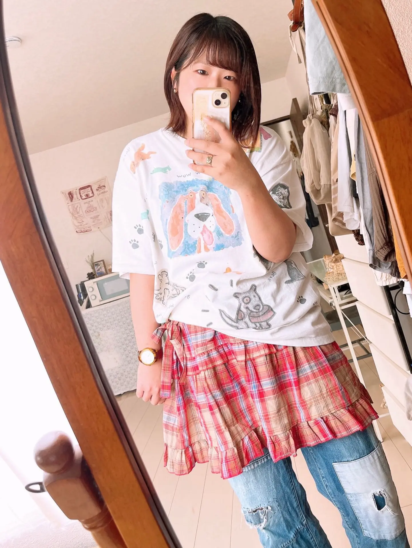 nuguのビスチェをビスチェとして着たら 似合わなすぎて、スカートみたいな レイヤードで着たらしっくりきた日。笑 tシャツ storefrontWinK デニム storefront古着屋 charme (シャルム) ださかわポップな夏の古着コーデ♩ 腕時計はニコアンド!アクセはプチプラ! #vintage #90s #デニム #カジュアル #ガーリー #古着 #used #fashion #古着女子 #宮崎古着屋 #都城古着屋 #レディース古着 #レトロ #ださかわ #夏コーデ #古着コーデ #レイヤード #tシャツ #古着屋wink #宮崎 #都城