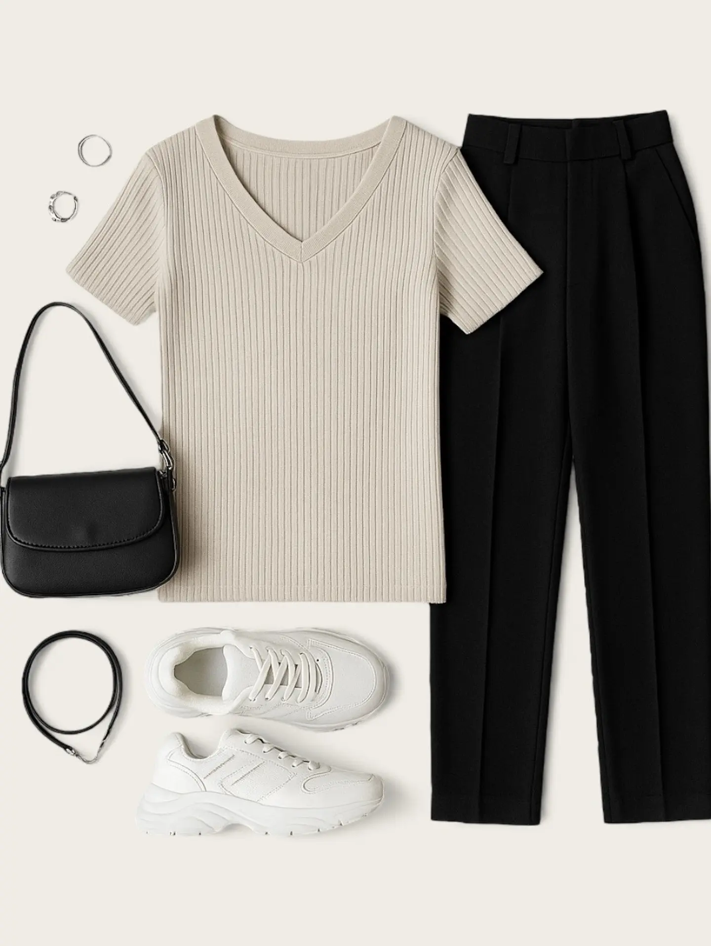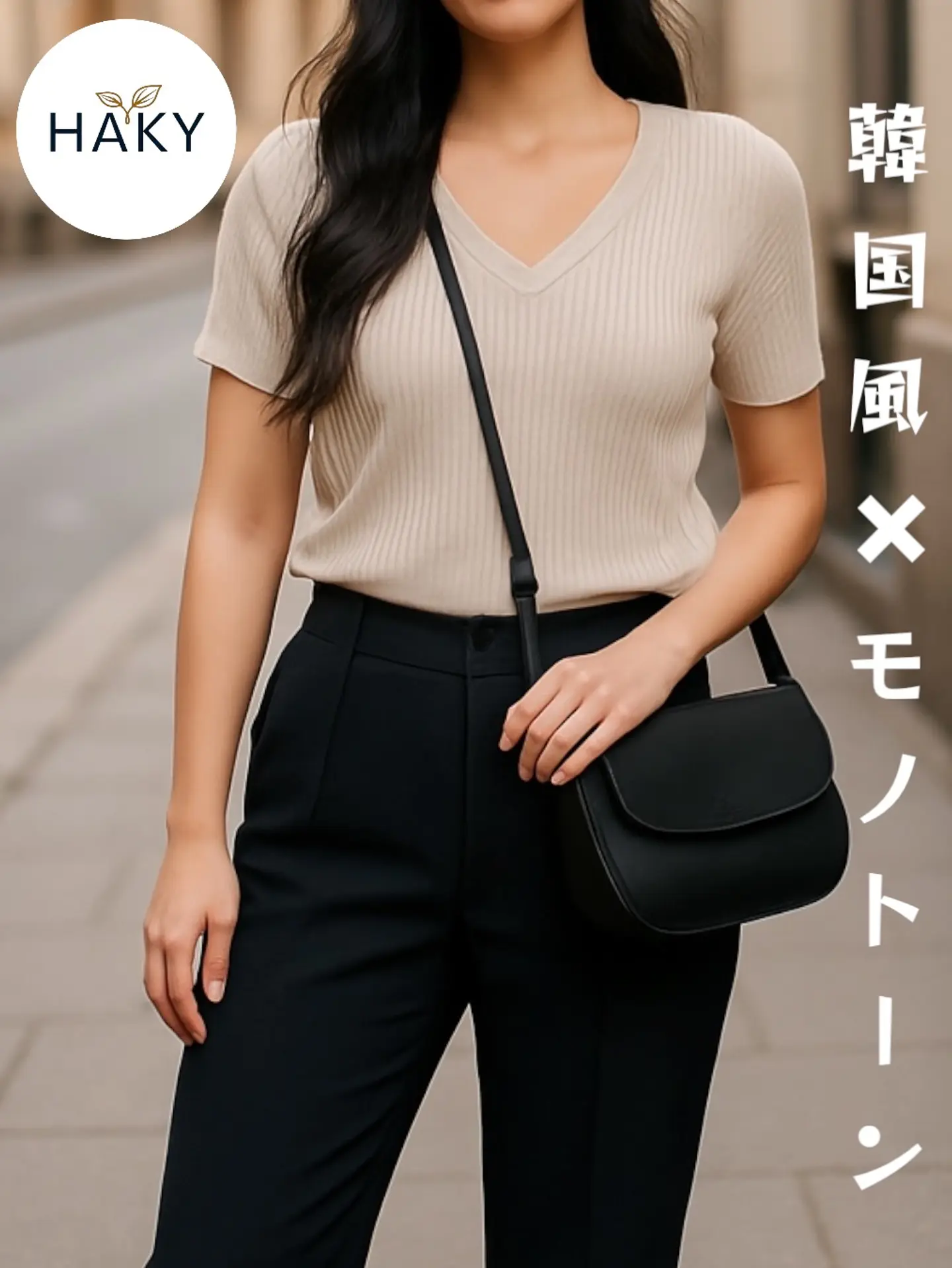 \シンプルこそおしゃれの極み🖤/ ベージュのリブニットに、 センタープレスのブラックパンツを合わせた 大人のきれいめスタイル✨ 足元はあえての白スニーカーで抜け感プラス👟 ブラック小物で引き締めて、 オフィス〜お出かけまでOKな万能コーデに! ⸻ ⭐︎ITEM⭐︎ 🧶 top:Vネックリブニット(ベージュ) 👖 pants:テーパードスラックス(ブラック) 👟 shoes:ホワイトスニーカー 👜 bag:ミニショルダー(ブラック) 💍 accessories:リング&細ベルト ⸻ #きれいめカジュアル #大人コーデ #白スニーカー #ベージュコーデ #シンプルコーデ #モノトーンコーデ #春夏コーデ #垢抜けスタイル #HAKYコーデ #古着 storefront古着屋HAKY
