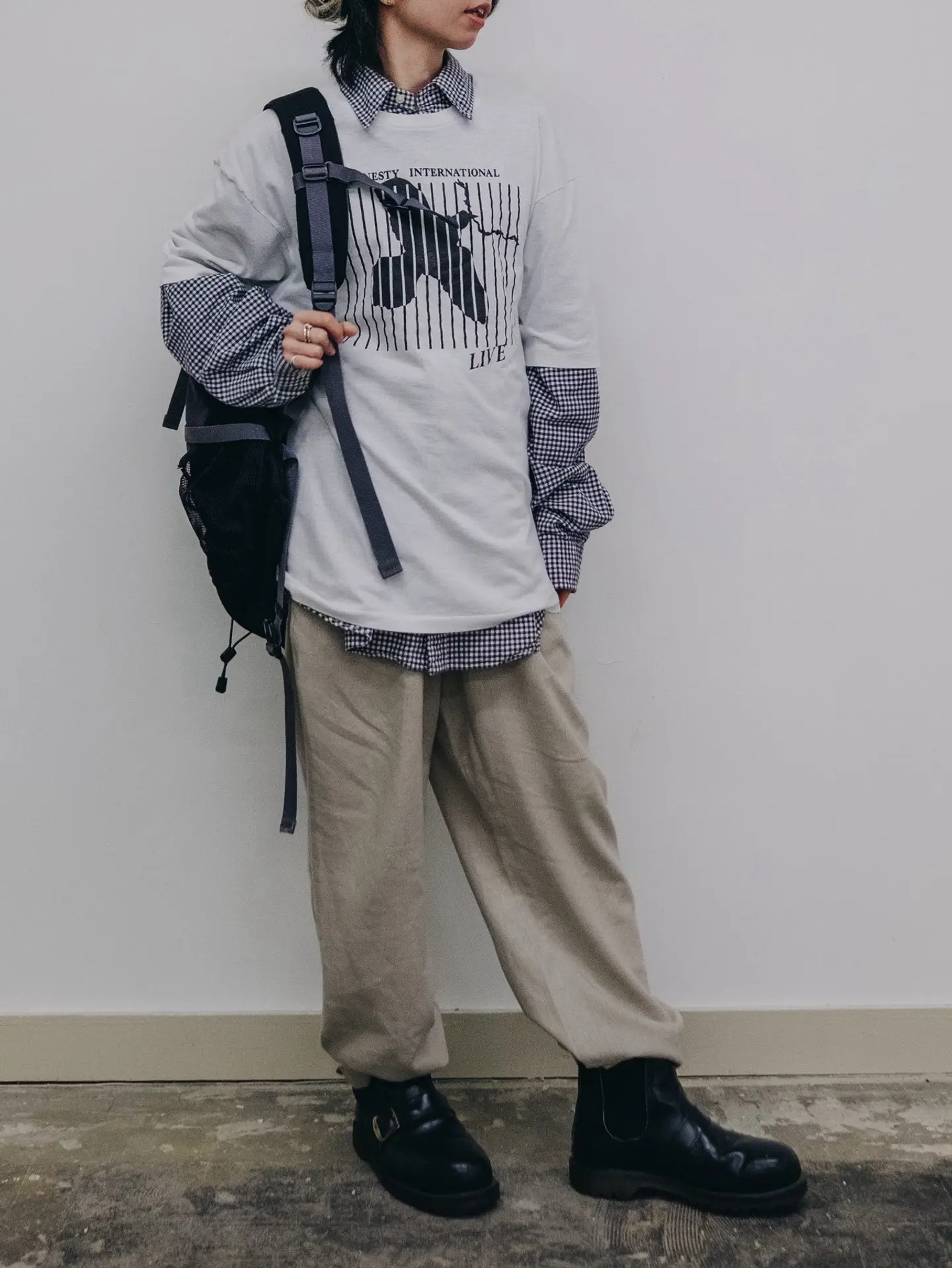 #無無スタ 〈〈Coordinate sample〉〉 Instagram:@mumu_furugiya Model : @mu2.kana 160cm Direction/Photo/Styling : @mumu_yoheee / @yohemaru.photo ------------------------------------------ SOLD商品やスタッフ私物混ざる事ありますが ルックブック感覚で見て頂けると幸いです🙏 -------------------------------------------------- 【 Item 】 ▷ 1988 AMNESTY INTERNATIONAL/CONSPIRACY OF HOPE TOUR T-SHIRT ¥7920-(tax in) ▷ 00s Ralph Lauren L/S BD monotone gingham check shirt ¥6930-(tax in) ▷ 90s Alan Flusser Linen/Rayon 2 tuck design pants ¥6600-(tax in) ▷ adidas 00s Y2K tec design bi-color backpack ¥7920-(tax in) ▷ Dr.Martens steel toe bucklevelt with Chelsea boots Made in England ¥29700-(tax in) -------------------------------------------------- オンラインストア未掲載の商品でも通販可能です! お問い合わせ等はDM又は公式ラインからお願いします🤝 . . . . #無無 #mumu #fashion #streetstyle #streetfashion #vtg #vintage #used #usedclothing #bigsize #oversize #古着 #古着屋 #ファッション #80s #90s #kobe #神戸 #神戸古着 #神戸古着屋 #元町古着屋 #元町 #栄町 #栄町ビルディング #メンズ古着 #古着ファッション &si;無無 #vintage #ストリート