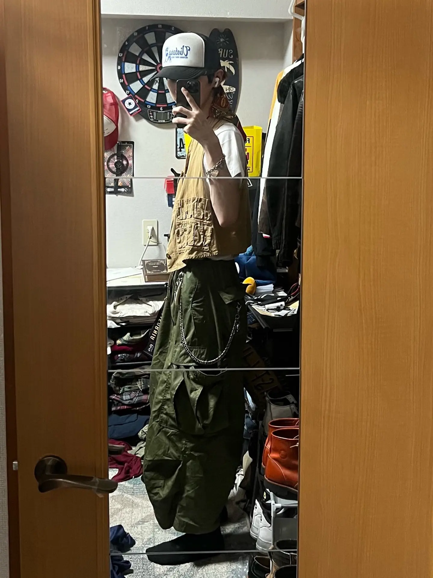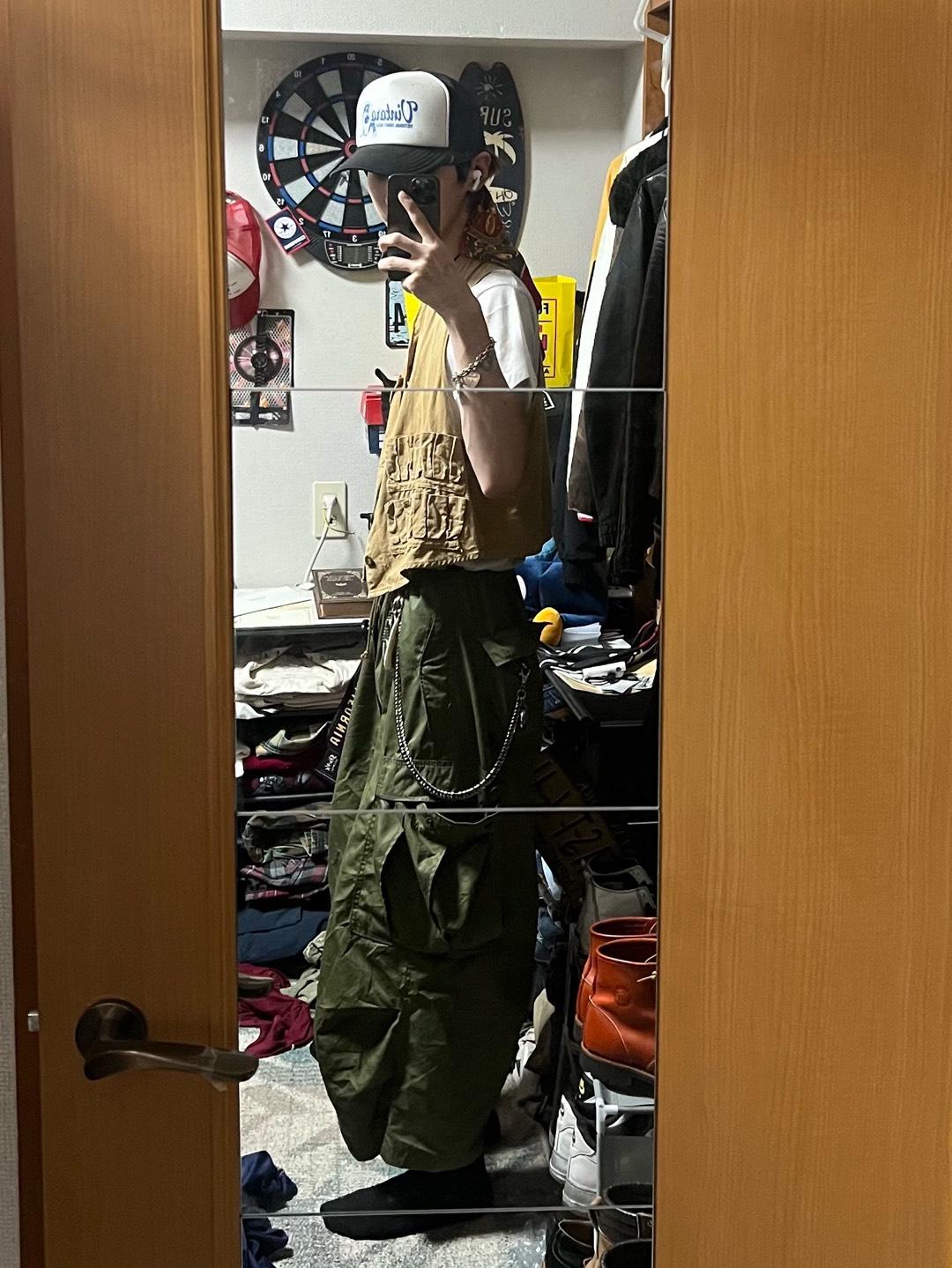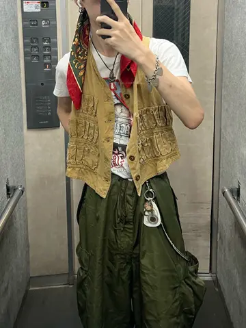 30sのブルービルのハンティングベスト使いたかっただけのコーデ 夏はほぼこれだった 腕が細いとかはもう気にしないことにした スカーフ頭に巻くのも超やりまくった レッドヘッドの中でもブルービルなのが結構強い サイズもピチッの感じでベストだったら最高なサイズ感 30s blue bill hunting best '80 ACDC tour T-shirt 50s M-51 30s EURO work boots #vintage #古着 #used #fashion #30s #50s #80s