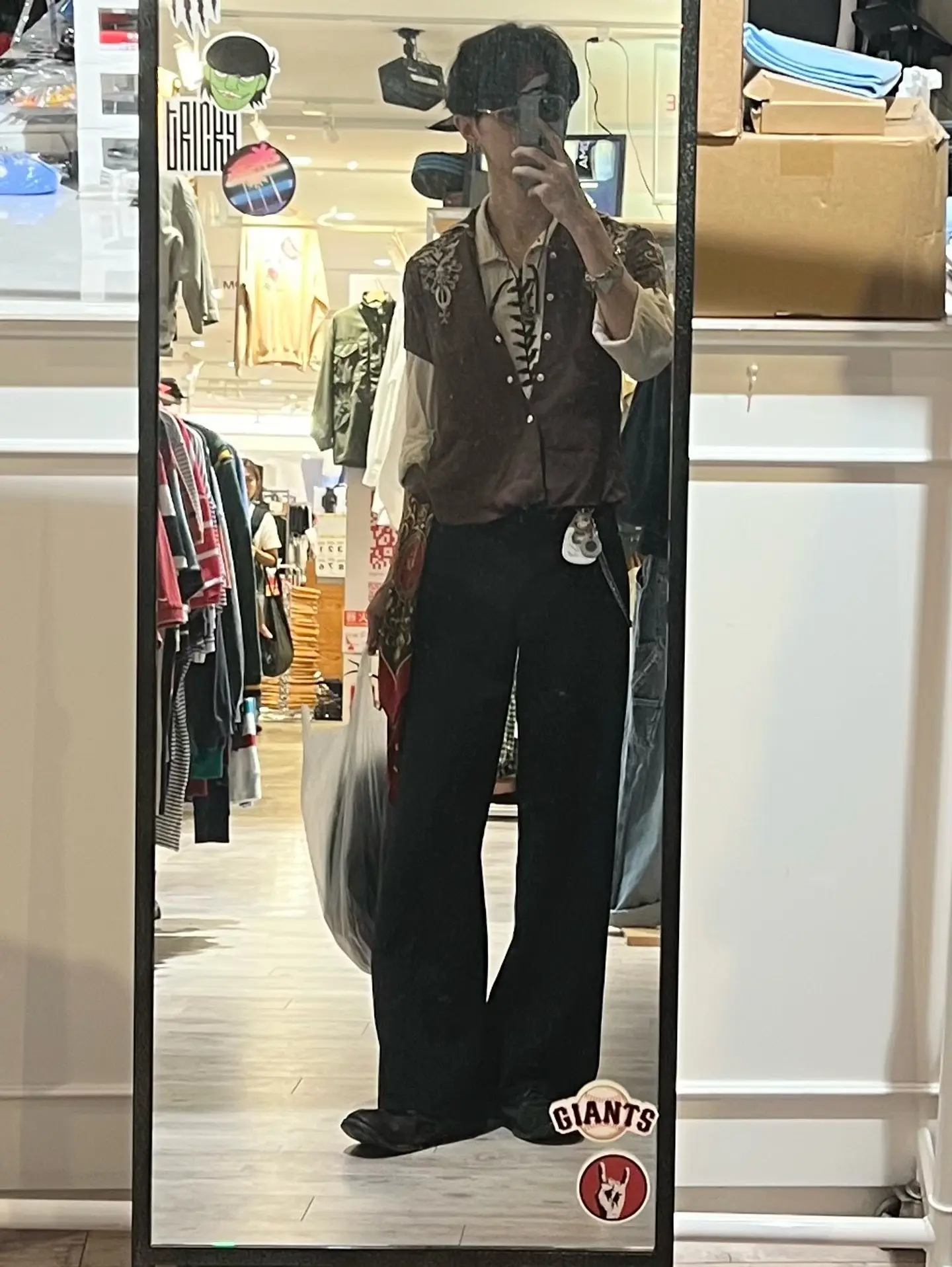 がち気に入ったヴィンテージ使ったモードライクなコーデ テーマは「曖昧」? Tiffany glasses 80s bandanna 40〜50s western shirt 80s lace up shirt 40s US Navy sailor trousers 30s EURO work boots silk 100% scarf コーデの組み立ててきとーに↓↓↓ パッと見小さめサイズなウエスタンシャツとフレアのセーラーパンツでAラインシルエット オーバーサイズのレースアップシャツの上からウエスタンシャツを羽織ってゆるっとしてるのにピシッとした印象も与える 全部ピシッとしてるのにゆるっともしてるからAラインに見えるのに全身のラインが曖昧な感じ 全てのアイテムがどこかに上品な印象を持ってるのに属性はミリタリーやワーク等で全身にまとまりを持たせたまま全身で外してる感覚? 上品な印象を足したくてティファニーのめがねしながらスカーフとかでカジュアル感も同時に強める シャツのボタンの位置で三角ゾーン作って上品さ優先、 レースアップに視線誘導した上で総刺繍で少し曖昧にする。 目立ちすぎない装飾を邪魔しない意味でも下半身の主張の少なさはいい感じ でもそれだけだと全体の色彩的に違和感持ちやすいから腰にスカーフ 視線誘導も全身も腕のとこも三角ゾーンの流れも下から上に矢印が一貫してていい感じ でも計算したからとかじゃなくて実はたまたま可愛いんじゃねってだけで生まれたコーデ #vintage #古着 #used #fashion #30s #40s #50s #80s #モード
