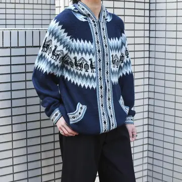 古着 ノルディックニット ニットフーディ デザインニット ジップアップ