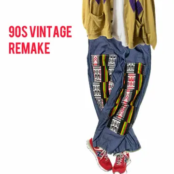 90s vintage リメイク カーブデニム バティック柄 大人シルエット