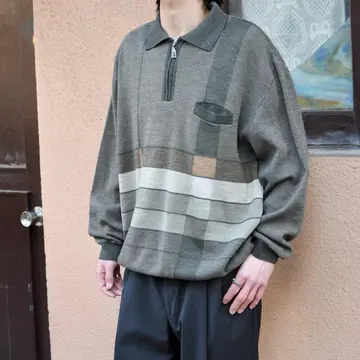 古着 ハーフジップ ニットポロ デザインニット ニット セーター カーキ