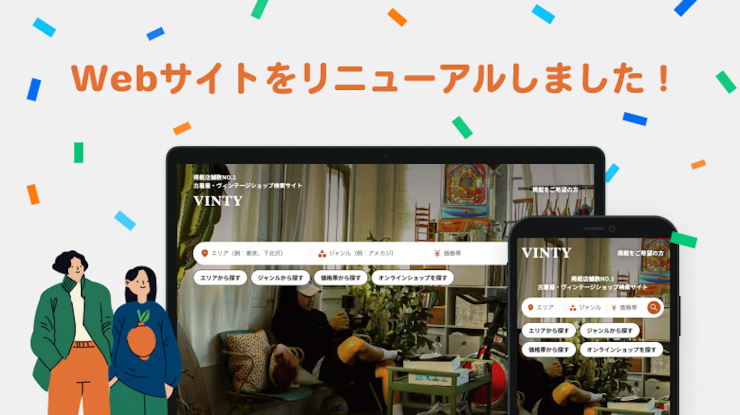 新しいWebサイトではコンテンツの充実と古着屋の検索機能を追加し、VINTYのコンテンツをより便利で快適にご利用いただけるようになりました。