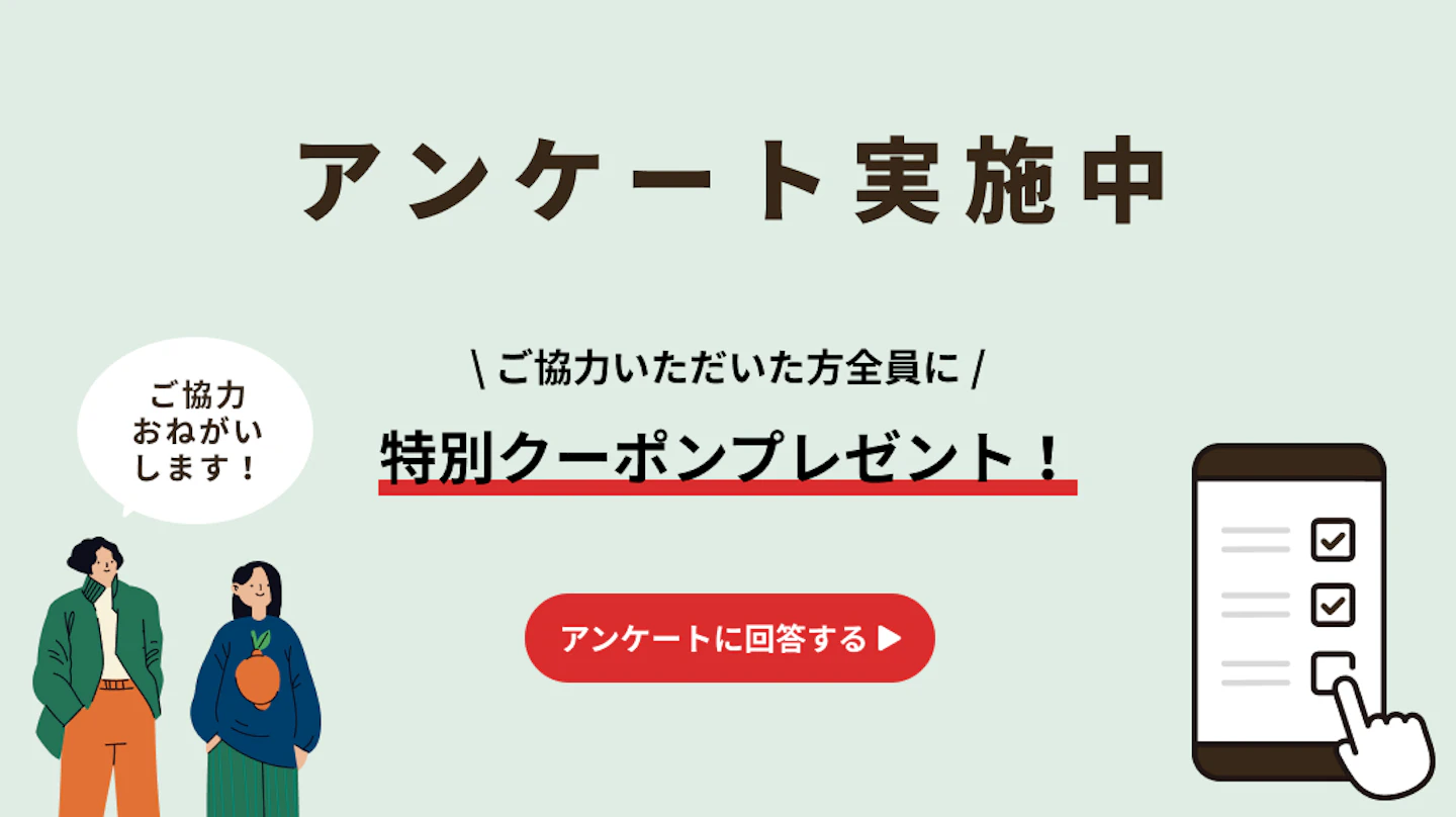 アンケートにご協力いただける方には、商品購入時に使用できる特別5%OFFクーポンコードを謝礼としてお送りします。