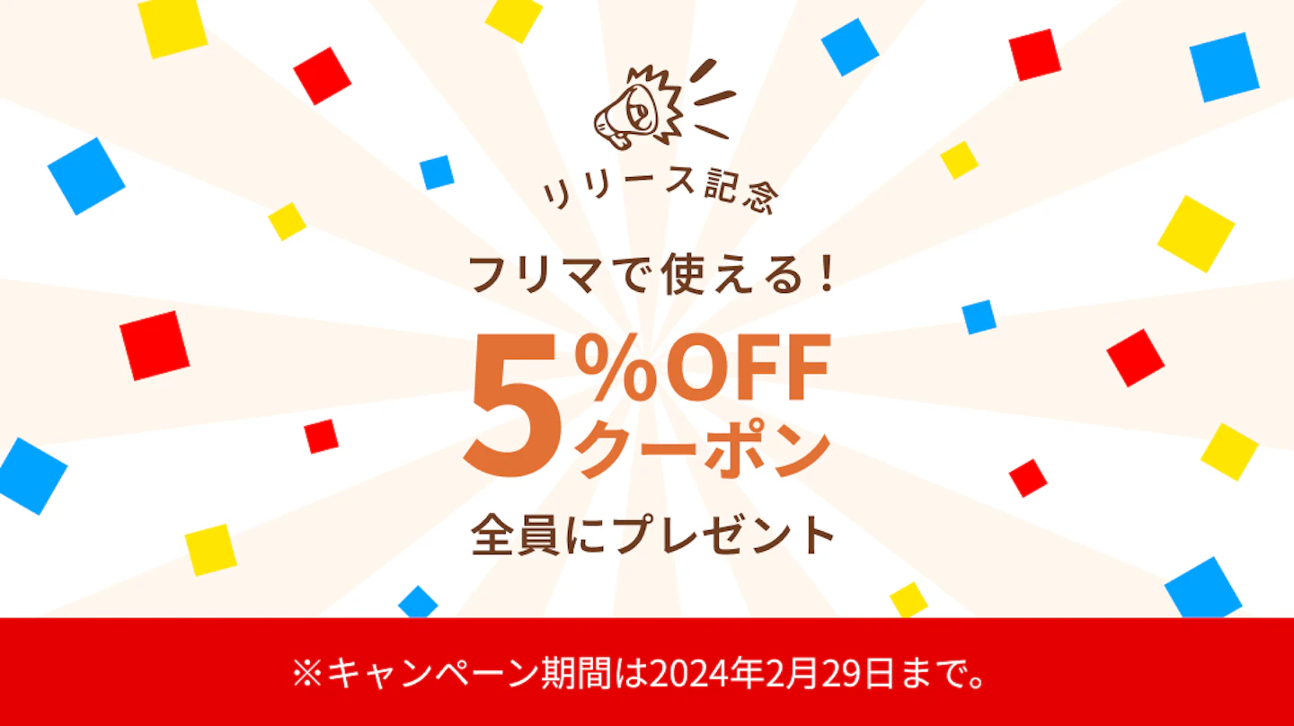 キャンペーン【リリース記念】5%OFFクーポンプレゼント中!2023年11月28日クーポンVINTYのリリースを記念して、フリマで使える5%OFFクーポンを全員にプレゼントいたします!キャンペーン詳細クーポンはVINTYアプリのフリマ機能でご使用いただけます。キャンペーン期間は2024年2月29日までです。クーポンの使用期限はクーポン取得から1ヶ月です。