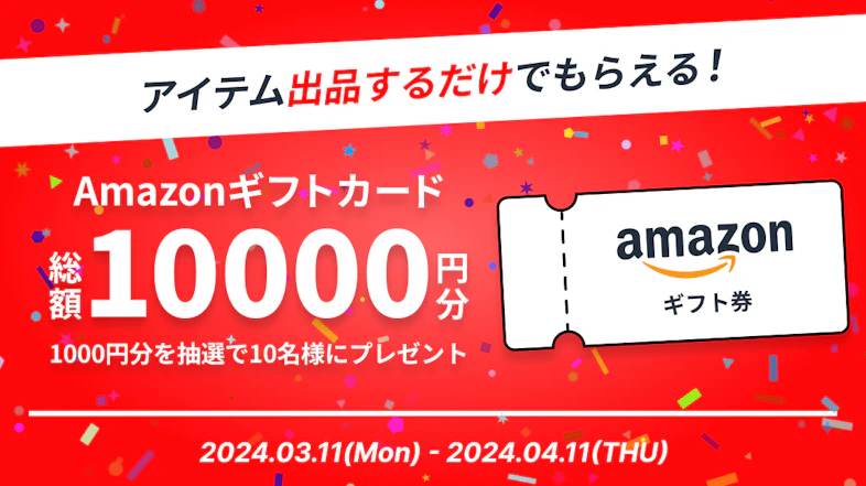 キャンペーン出品するだけで「総額10000円分」Amazonギフト券プレゼント!この度、VINTYにアイテムを出品するだけで「総額10000円分」Amazonギフト券プレゼントキャンペーンを実施いたします。