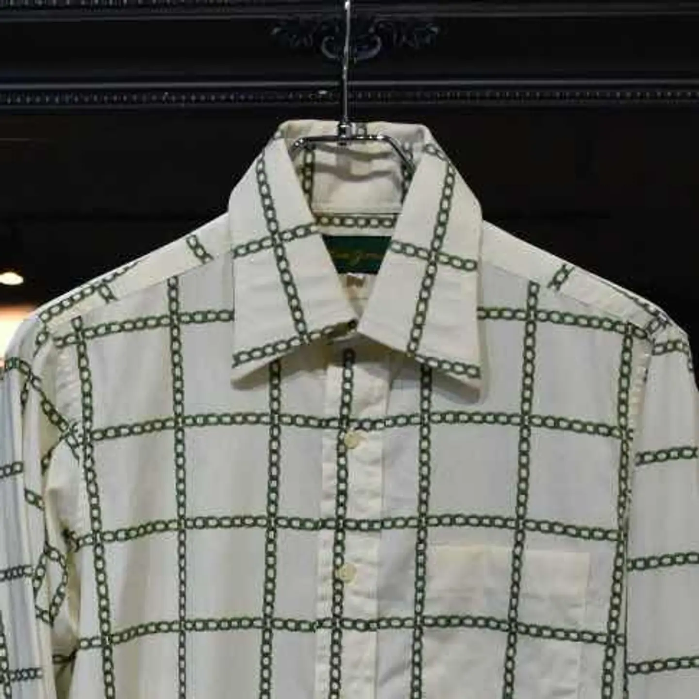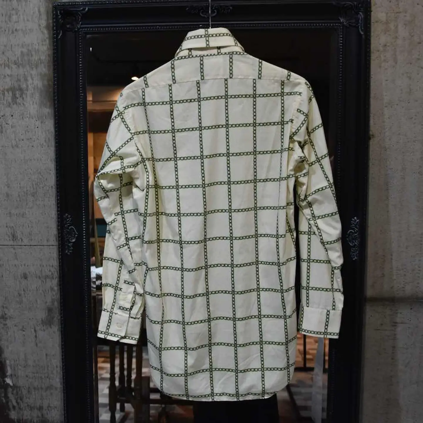 【商品名】 Chain Check Shirt 【アイテムについて】 鎖が十字に組み込まれ、チェックになっているデザイン。 色味はベージュのボディ×緑の鎖 襟は硬め・大きめでイタリアな風貌。 幅がかなりタイトであり、Aライン・Iラインシルエットにぴったり。一度試着して、サイズ感を確かめてからのご購入をおすすめします。 【サイズ】 肩幅 : 38cm 着丈 : 84.5cm 袖丈 : 58cm 身幅 : 46cm 【素材】 【コンディション】 汚れ・傷ございません。 #デザインシャツ #デザイン古着 #シャツ #ヨーロッパ古着