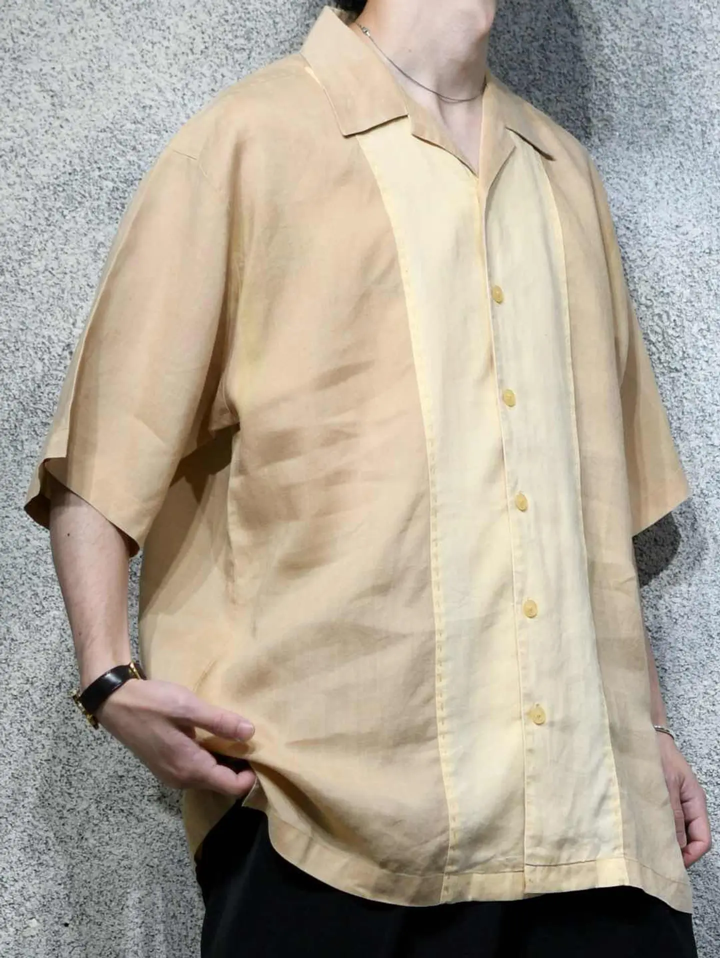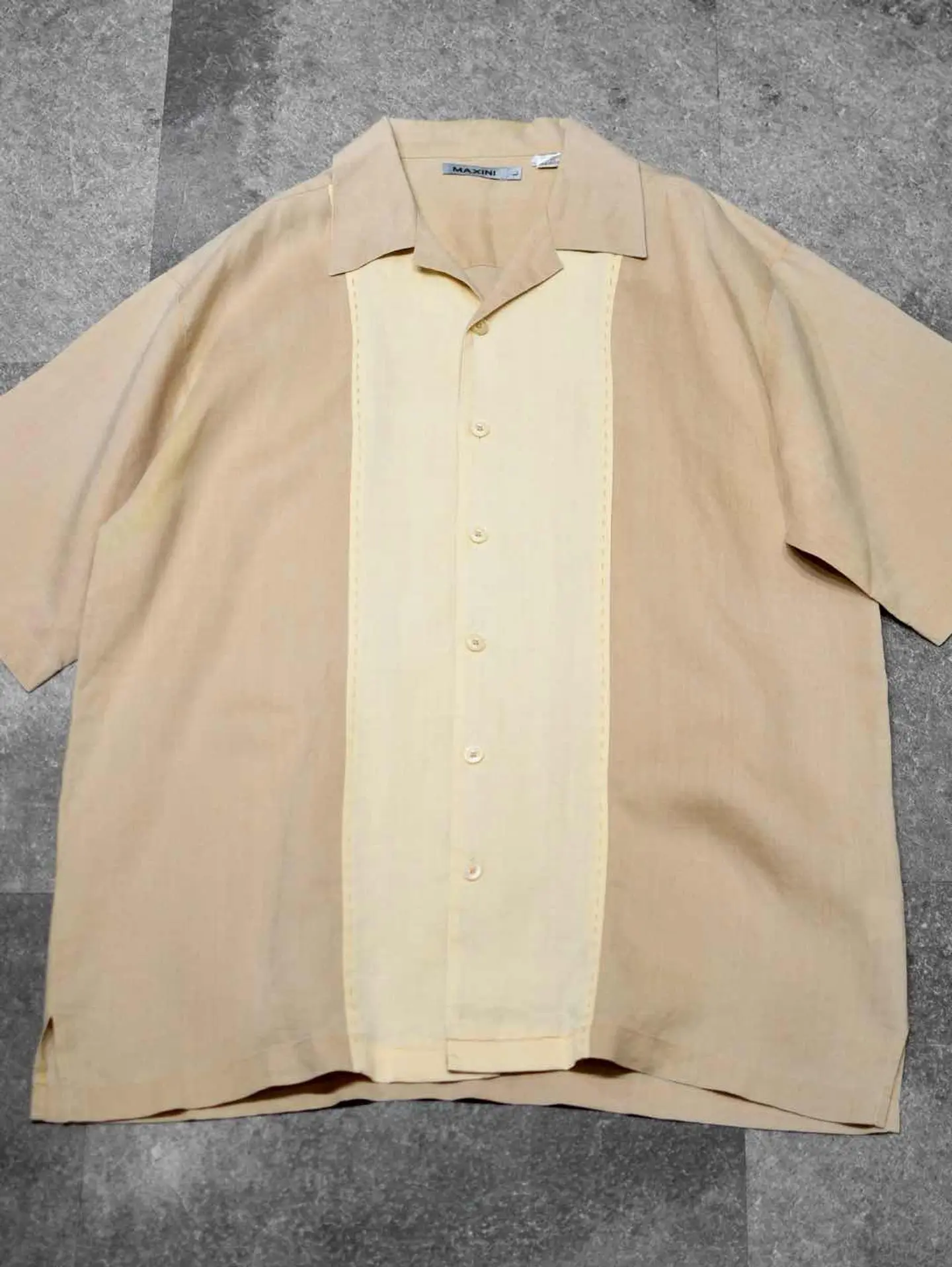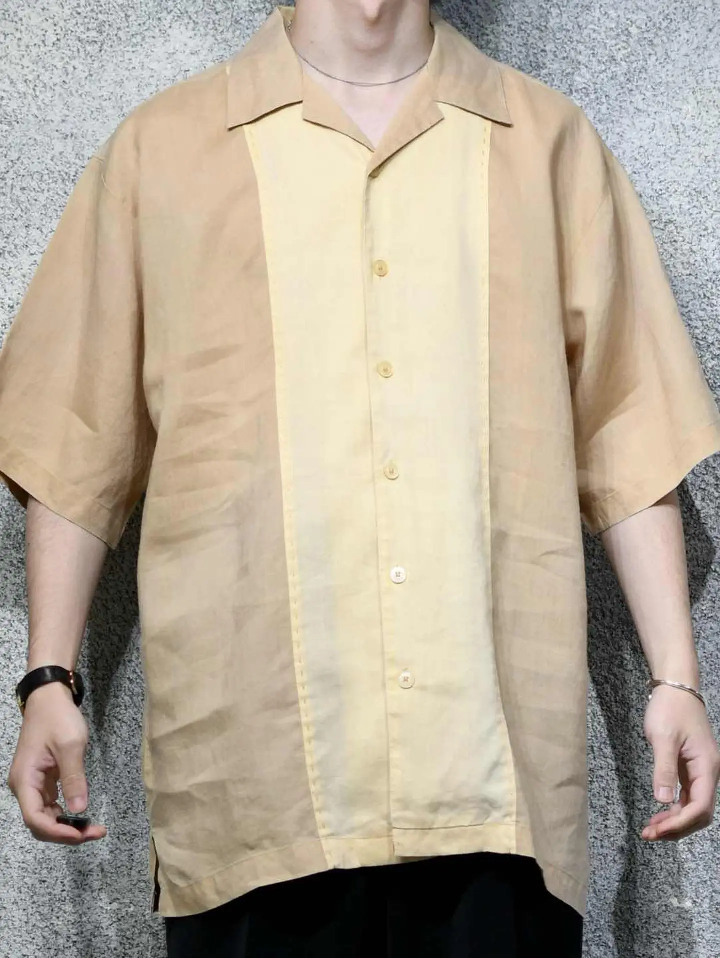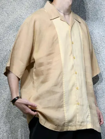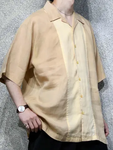 着丈81cm 肩幅54cm 身幅63cm 袖丈30cm fabric/Linen 着用画像 177cm/64kg リネンシャツといえば、アイボリー色のイメージが ありますが、こちらはそれよりも濃いベージュ色と アイボリー色との切り替え。 色がついたリネンシャツ、黒やグレーなんかも 時折見かけますが、あえてこの色でとデザインした 作り手の拘りが感じた1着。 考えてみれば無いよなと。 ぷるっとしたリネン生地に落ち着きのあるカラー。 大人びた雰囲気を纏いたい方へ、おすすめです。 ※内側に汚れあり。 ※撮影状況により、実物と多少色が異なる場合が ございます。 ※古着を取り扱っているため、気づかない汚れや ほつれ等がある場合がございます。 予めご了承ください。 ※サイズは着用感で選んでおり、表記サイズではございません。 古着 オーバーサイズ old vintage ヴィンテージ used 80's 90's アメリカ古着 ユーロ古着 メンズ レディース POLO RALPH LAUREN Eddie Bauer OLD GAP Eddie Bauer LANDS' END ランズエンド LLBean エルエルビーン オールドギャップ エディーバウアー ラルフローレン ブルックスブラザーズ Brooks Brothers ベージュ 生成り オープンカラーシャツ 開襟シャツ などがお好きな方 #vintage #オーバーサイズ #old #used #90s #80s #古着 #ヴィンテージ #アメリカ古着 #ユーロ古着 #古着男子 #古着女子 #LLBean #エルエルビーン #EddieBauer #エディーバウアー #oldgap #オールドギャップ #LANDSEND #ランズエンド #NAUTICA #ノーティカ #ラルフローレン #POLORALPHLAUREN #ブルックスブラザーズ #BrooksBrothers #オープンカラーシャツ #開襟シャツ #デザインシャツ #半袖シャツ #リネンシャツ #切り替えシャツ