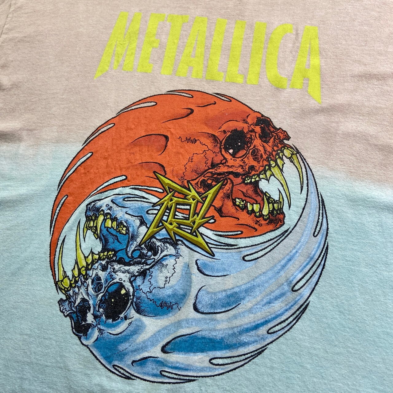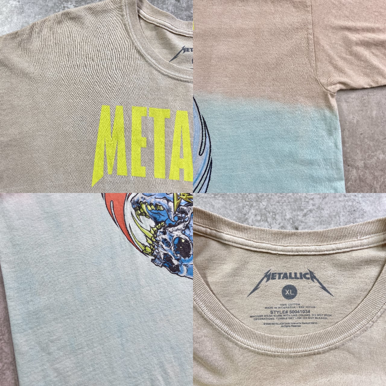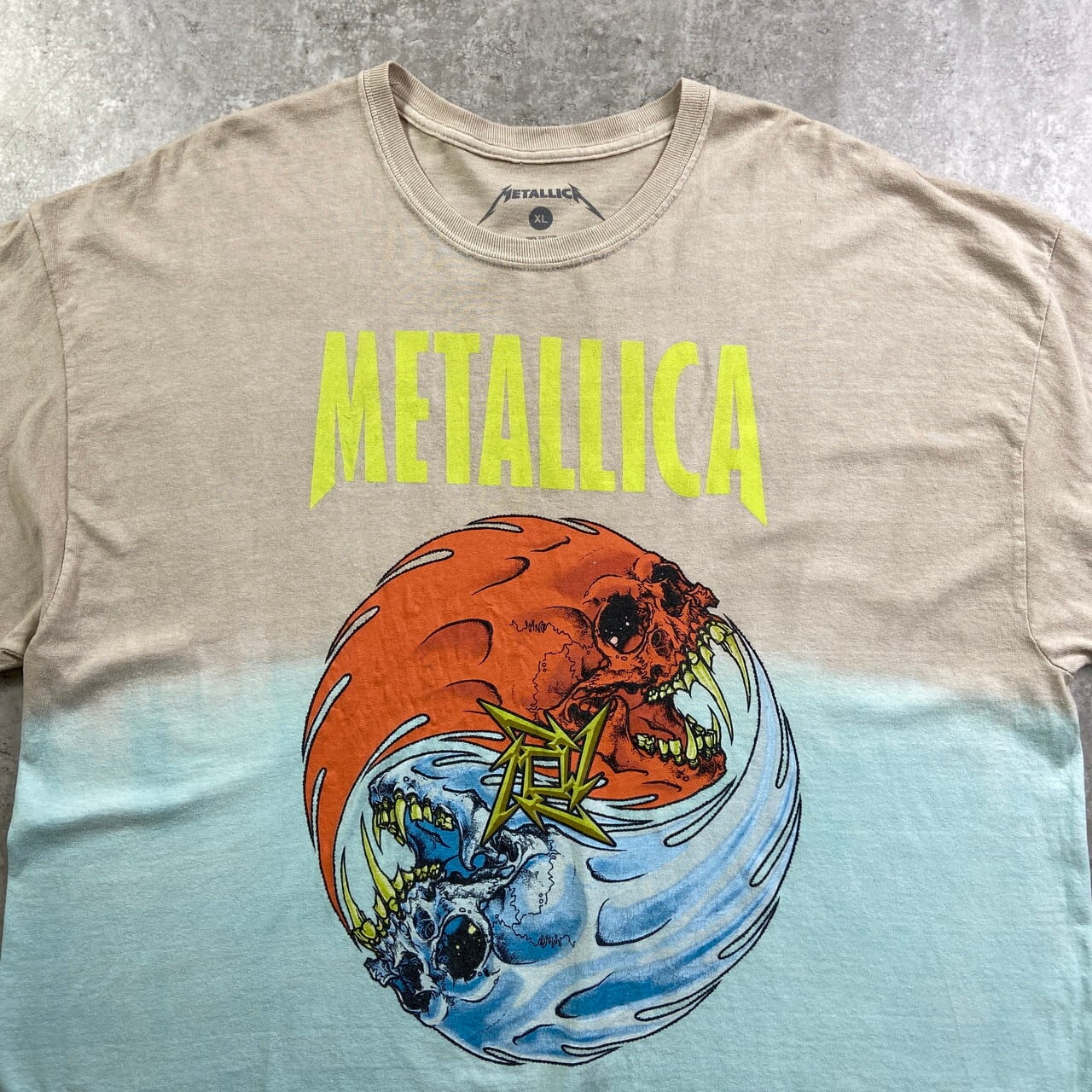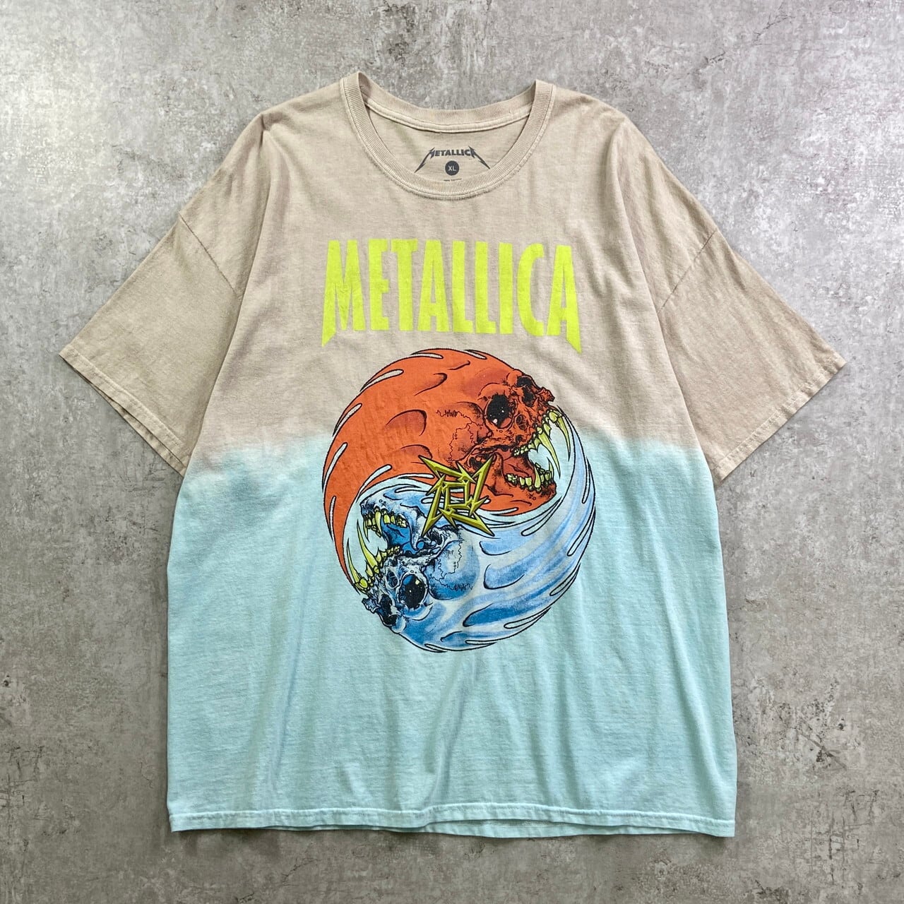 ■METALLICA メタリカ PUSHEAD パスヘッド バンドTシャツ バンT グラデーション メンズ2XL相当 古着 ベージュ ライトブルー 水色 【Tシャツ】/マルチカラー 【サイズ】表記 XL(着用感メンズ2XL相当) ※計測値をご確認ください。 着丈…75 身幅…65 肩幅…64 袖丈…20 【生産国】ニカラグア製 【素材】コットン100% 【状態】 数か所薄汚れ、バック左肩付近に小穴等の使用感がございます。 画像にてご確認ください。 【c250523014】 ※古着は洗濯、検品などのケアを行っております。(新品・デッドストックは洗濯していません。) ※モニターの発色により実物と異なる場合がございます。予めご了承ください。 ※ 海外直輸入USED品になります。