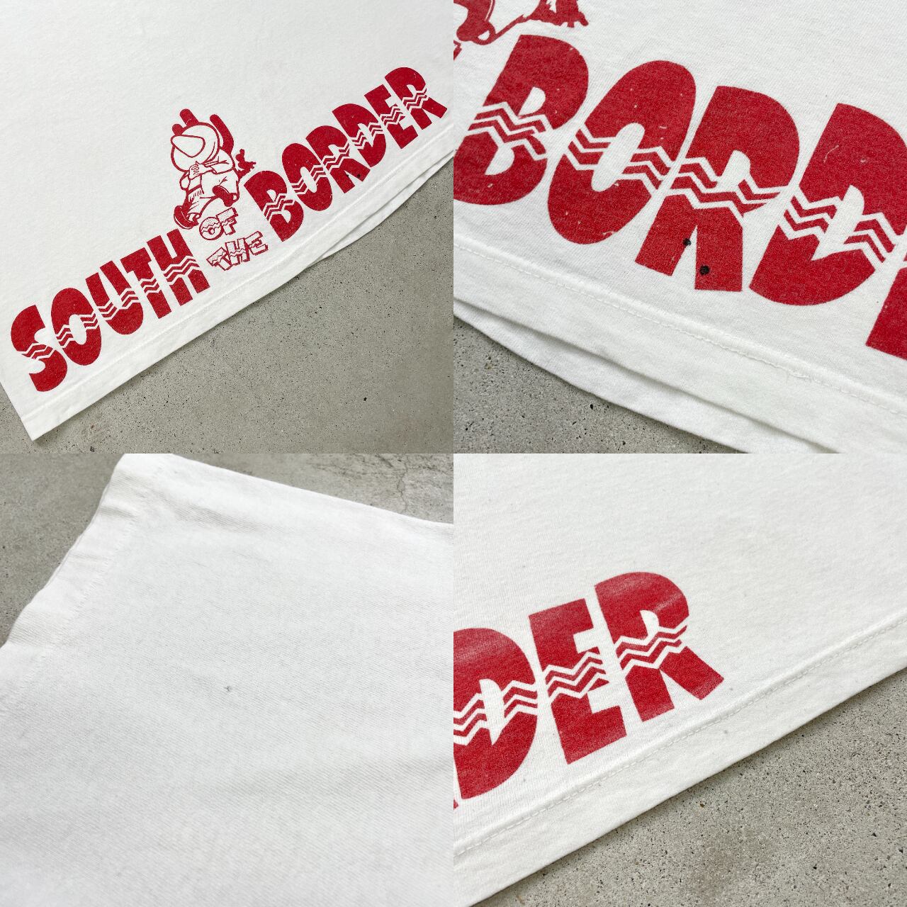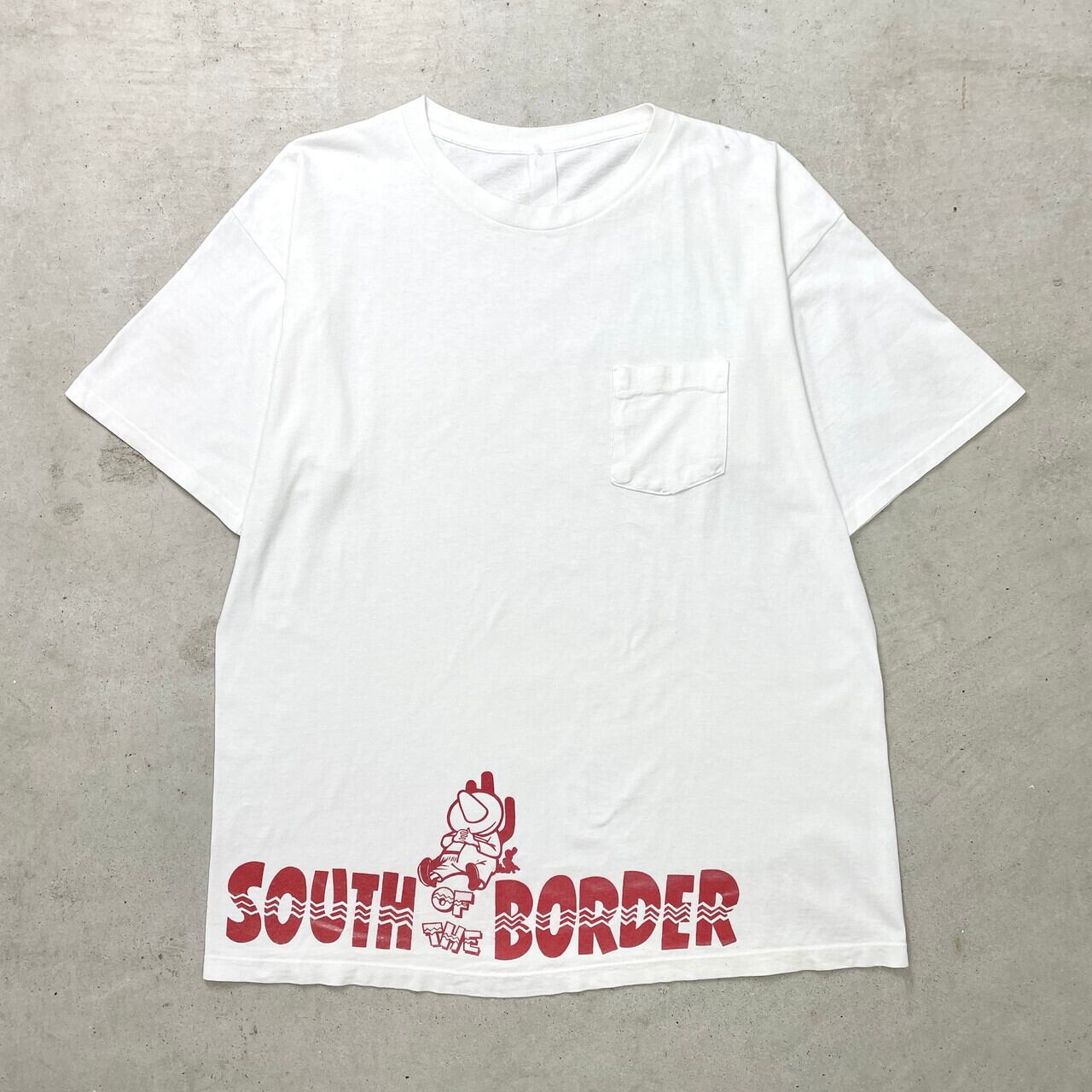 ■90年代 SOUTH BORDER スーベニア プリントTシャツ 企業ロゴ メンズ2XL相当 古着 90s ヴィンテージ VINTAGE 白 袖シングルステッチ ビッグサイズ 大きいサイズ【Tシャツ】/ホワイト ◎サウスカロライナの高速道路にある観光施設SOUTH BORDERのTシャツです。 【サイズ】表記 不明(着用感メンズ2XL相当) ※計測値をご確認ください。 着丈…76.5 身幅…63.5 肩幅…60 袖丈...22.5 【生産国】不明 【素材】不明(おそらくコットンかと思われます。) 【状態】全体的に数か所細かい汚れや小穴、ポケット部分にステッチ取れ等の使用感がございます。 画像にてご確認ください。 【c250519013】 ※古着は洗濯、検品などのケアを行っております。(新品・デッドストックは洗濯していません。) ※モニターの発色により実物と異なる場合がございます。予めご了承ください。 ※ 海外直輸入USED品になります。