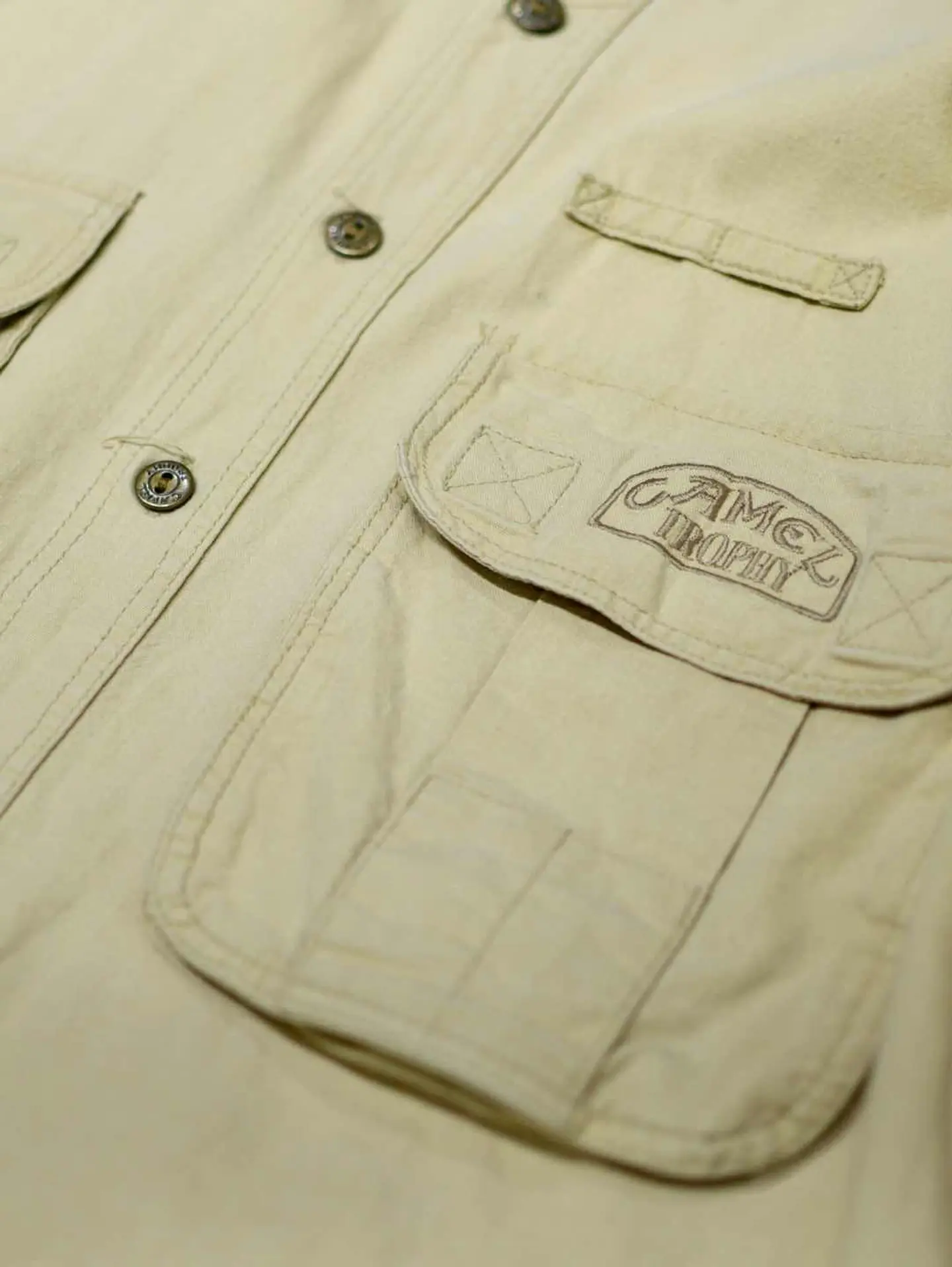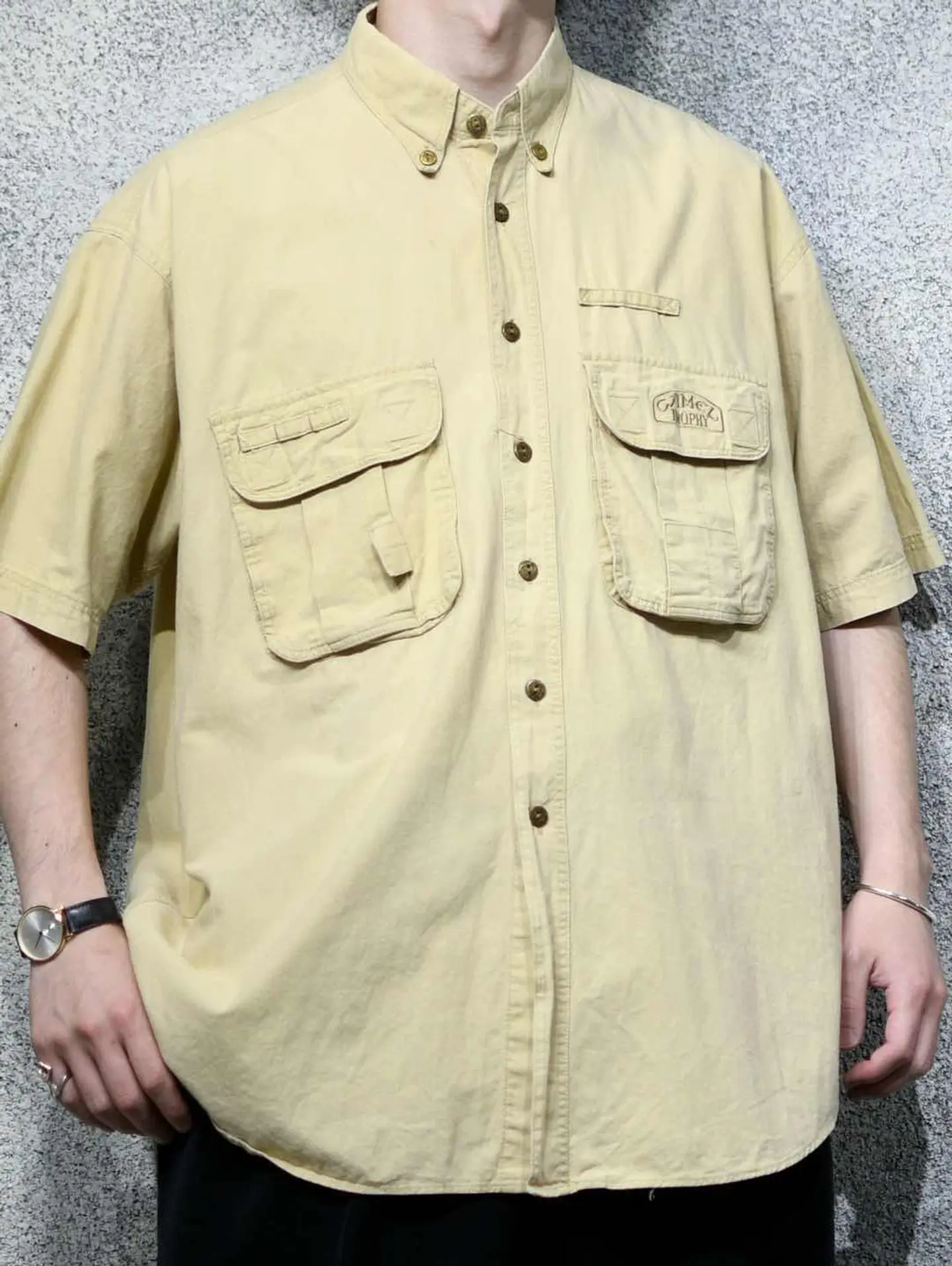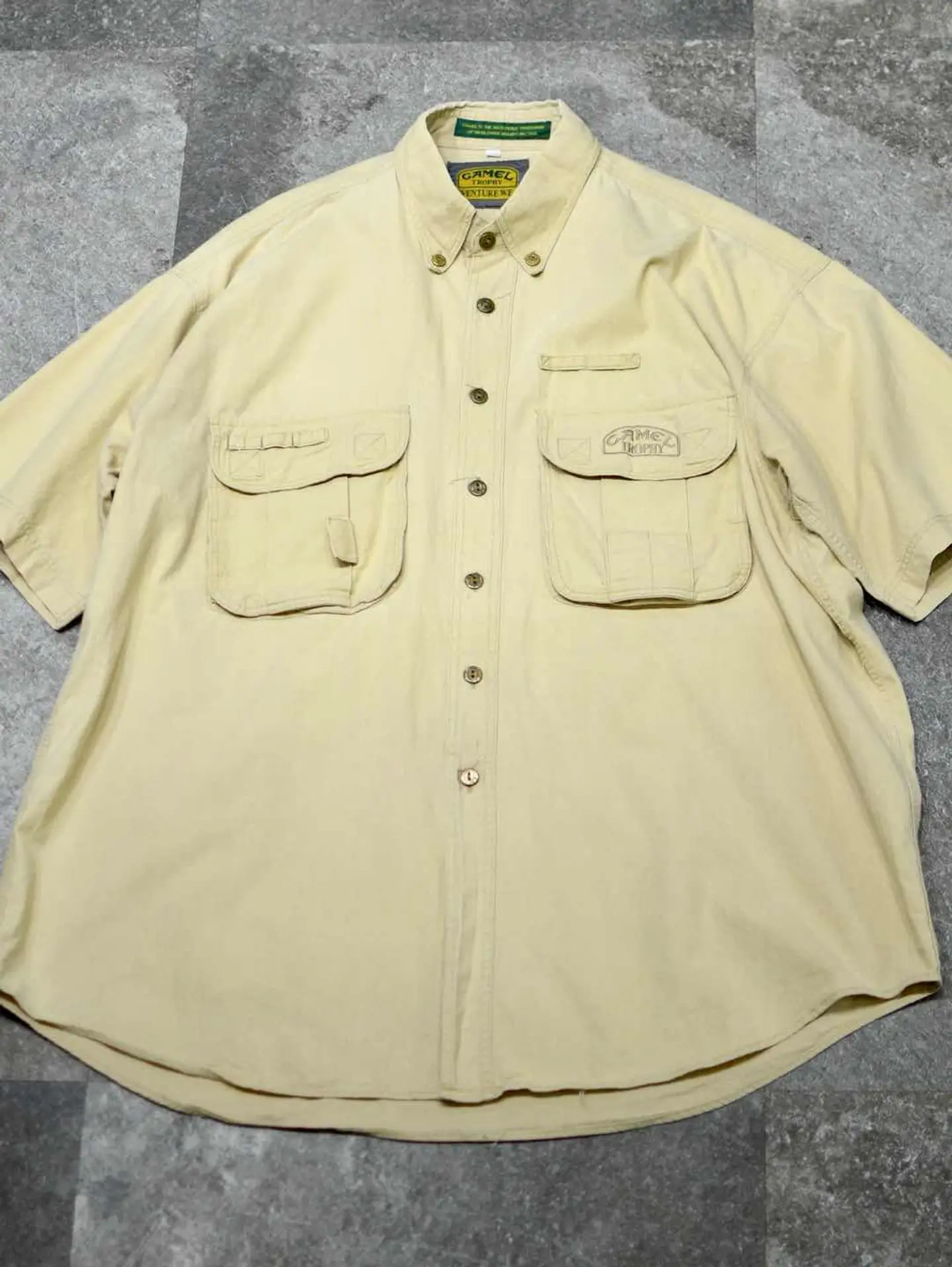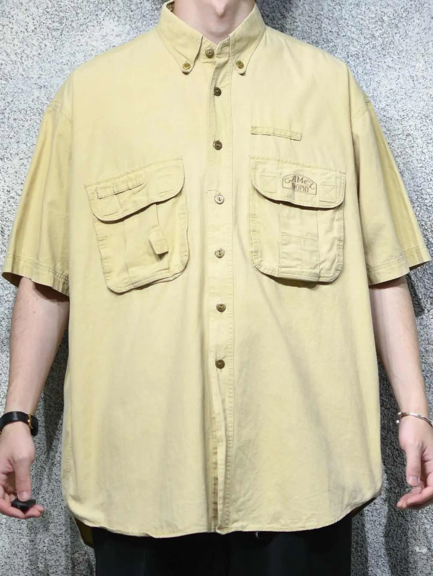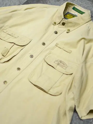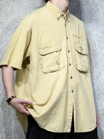 着丈85cm 肩幅57cm 身幅67cm 袖丈28cm fabric/cotton 着用画像 177cm/64kg 古着でも人気のあるタバコブランド。 こちらはCAMELから、アドベンチャーシャツを ご紹介。 実際これを着て、冒険に行く方はいないかと 思いますが、デザインとして見ると 最高のギミックではないでしょうか。 マチ付きのポケットや、ブランドの刻印が入る ボタンなど、細部にまで拘りを感じる逸品で デニムやチノ、軍パンで野暮ったく振っても、 スラックスなどキレイめなアイテムで バランスと取っても上手く纏まるシャツです。 ※撮影状況により、実物と多少色が異なる場合が ございます。 ※古着を取り扱っているため、気づかない汚れや ほつれ等がある場合がございます。 予めご了承ください。 ※サイズは着用感で選んでおり、表記サイズではございません。 古着 オーバーサイズ old vintage ヴィンテージ used 80's 90's アメリカ古着 ユーロ古着 メンズ レディース POLO RALPH LAUREN Eddie Bauer OLD GAP Eddie Bauer LANDS' END ランズエンド LLBean エルエルビーン オールドギャップ エディーバウアー ラルフローレン ブルックスブラザーズ Brooks Brothers ワークシャツ ボタンダウンシャツ キャメル などがお好きな方 #vintage #オーバーサイズ #old #used #90s #80s #古着 #ヴィンテージ #アメリカ古着 #ユーロ古着 #古着男子 #古着女子 #LLBean #エルエルビーン #EddieBauer #エディーバウアー #oldgap #オールドギャップ #LANDSEND #ランズエンド #NAUTICA #ノーティカ #ラルフローレン #POLORALPHLAUREN #ブルックスブラザーズ #BrooksBrothers #ボタンダウンシャツ #CAMEL #デザインシャツ #ギミック #半袖シャツ