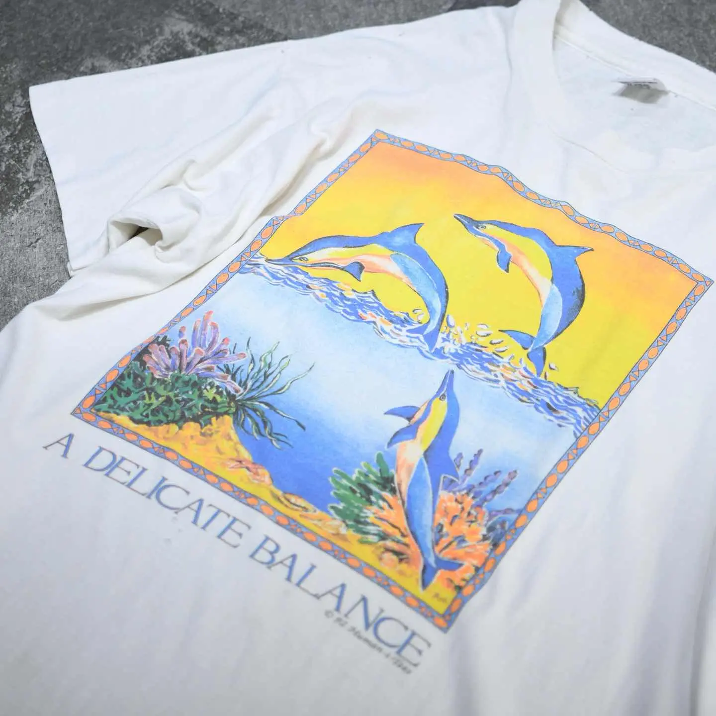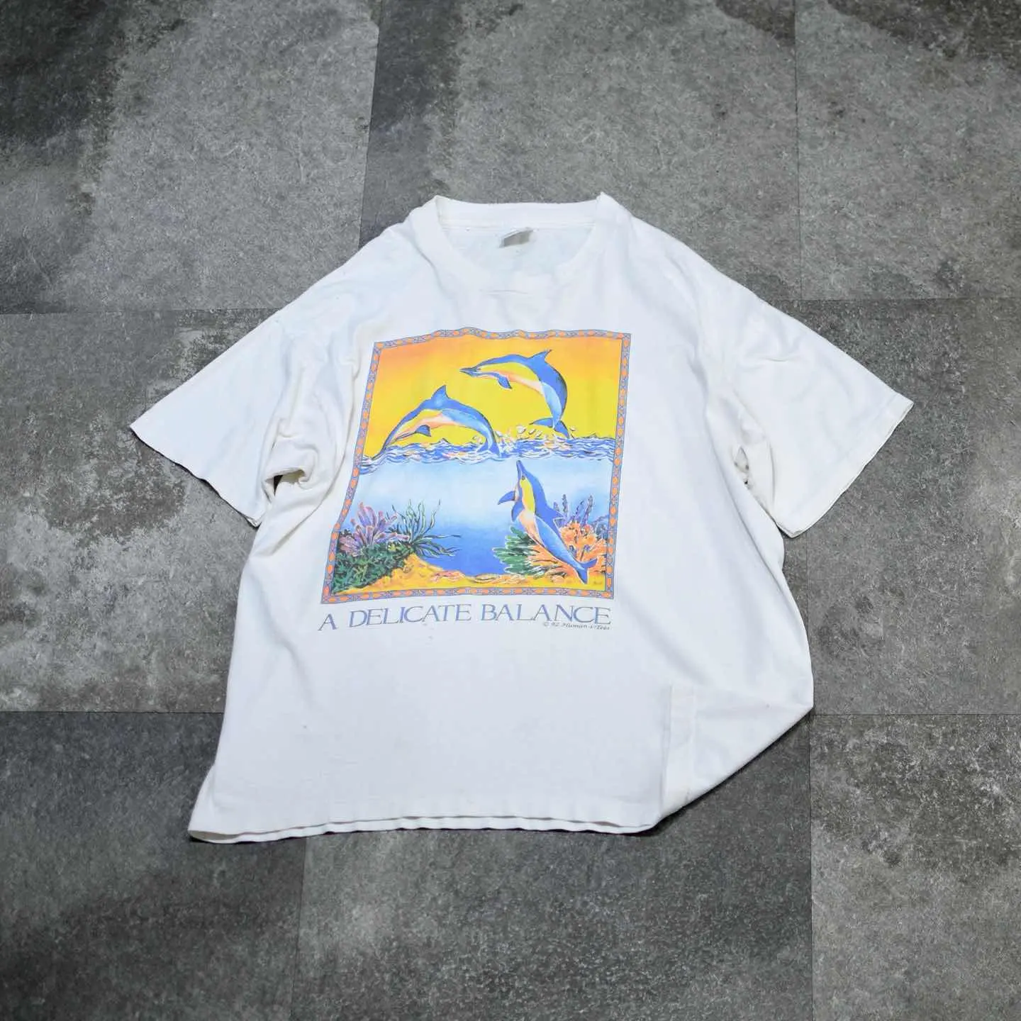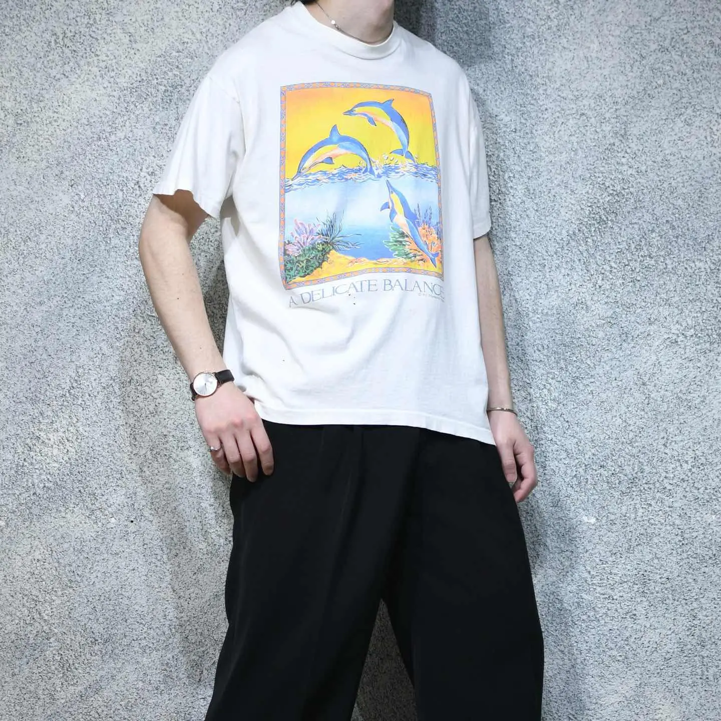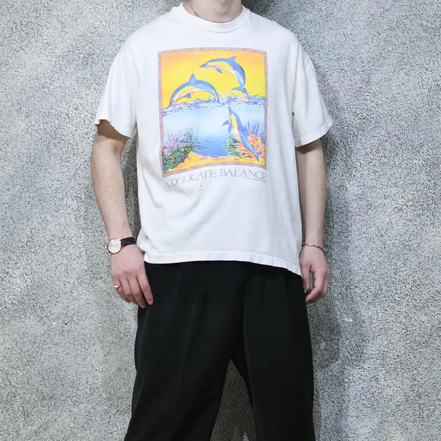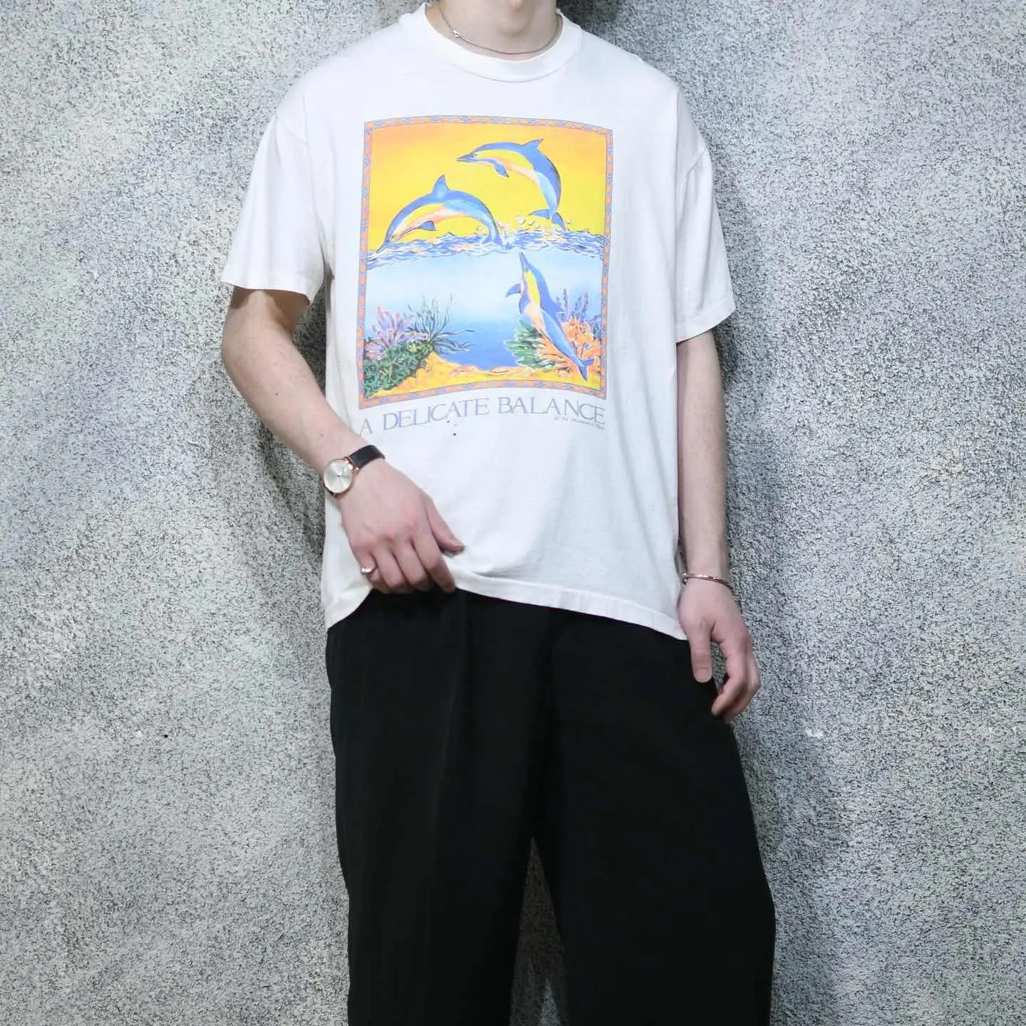 着丈68cm 肩幅58cm 身幅60cm 袖丈21cm(シングルステッチ) fabric/cotton made in USA 着用画像 177cm/64kg イルカが3匹。可愛いプリントと使い込まれた ボディ。 単に可愛いTシャツじゃなくボロからこそ、 惹かれた逸品。 Tシャツの中心からズレたプリントや、 プリントの縁の魚たちが推し。 ※撮影状況により、実物と多少色が異なる場合が ございます。 ※古着を取り扱っているため、気づかない汚れや ほつれ等がある場合がございます。 予めご了承ください。 ※サイズは着用感で選んでおり、表記サイズではございません。 古着 オーバーサイズ old vintage ヴィンテージ used 80's 90's アメリカ古着 ユーロ古着 メンズ レディース POLO RALPH LAUREN Eddie Bauer OLD GAP Eddie Bauer LANDS' END ランズエンド LLBean エルエルビーン オールドギャップ エディーバウアー ラルフローレン ブルックスブラザーズ Brooks Brothers 白Tシャツ 白 ホワイト ダメージ アニマルTシャツ アニマルプリント 半袖Tシャツ Tシャツ などがお好きな方 #vintage #オーバーサイズ #old #used #90s #80s #古着 #ヴィンテージ #アメリカ古着 #ユーロ古着 #古着男子 #古着女子 #LLBean #エルエルビーン #EddieBauer #エディーバウアー #oldgap #オールドギャップ #LANDSEND #ランズエンド #NAUTICA #ノーティカ #ラルフローレン #POLORALPHLAUREN #ブルックスブラザーズ #BrooksBrothers #Tシャツ #プリントTシャツ #白Tシャツ #シングルステッチ #半袖Tシャツ #アニマルTシャツ #アニマルプリント