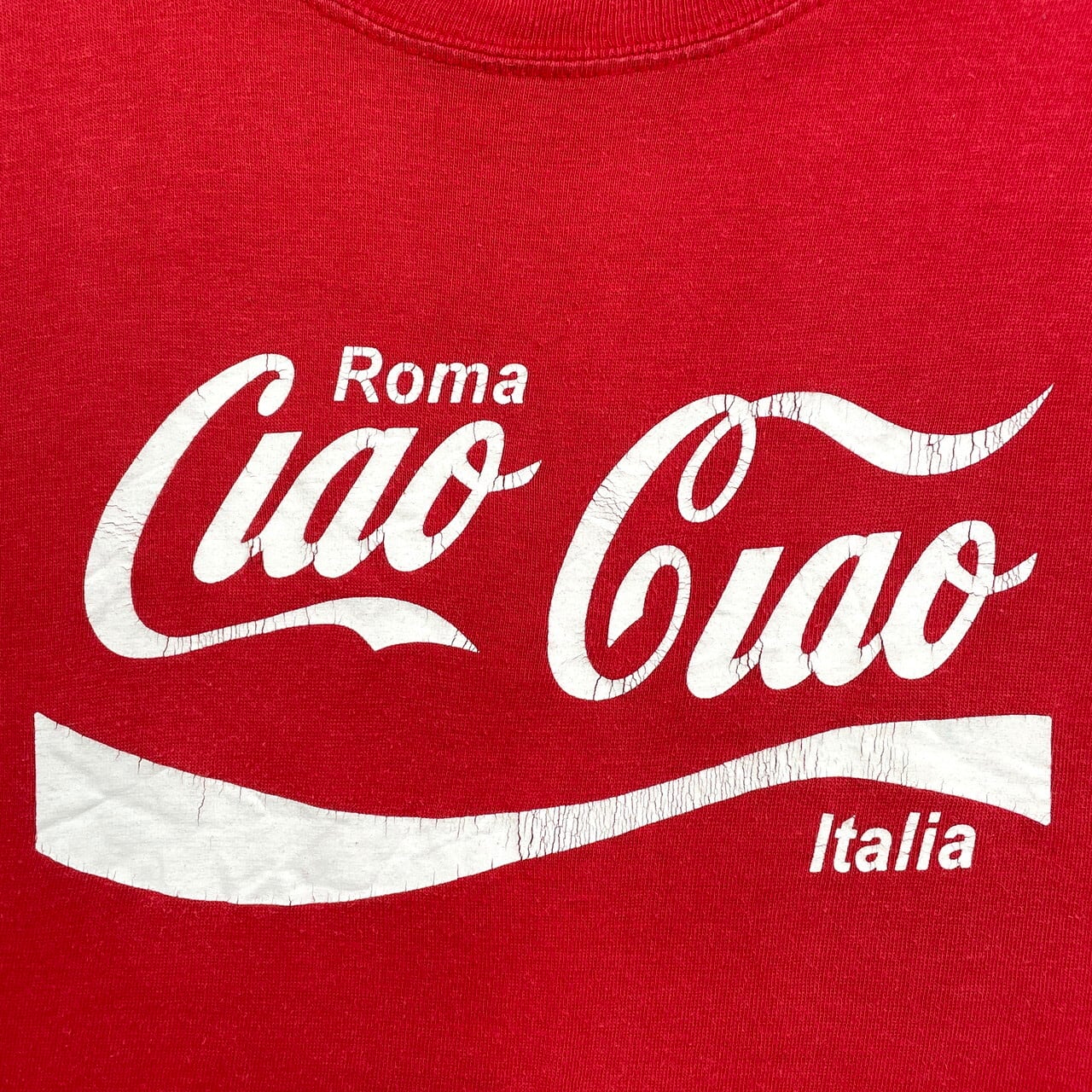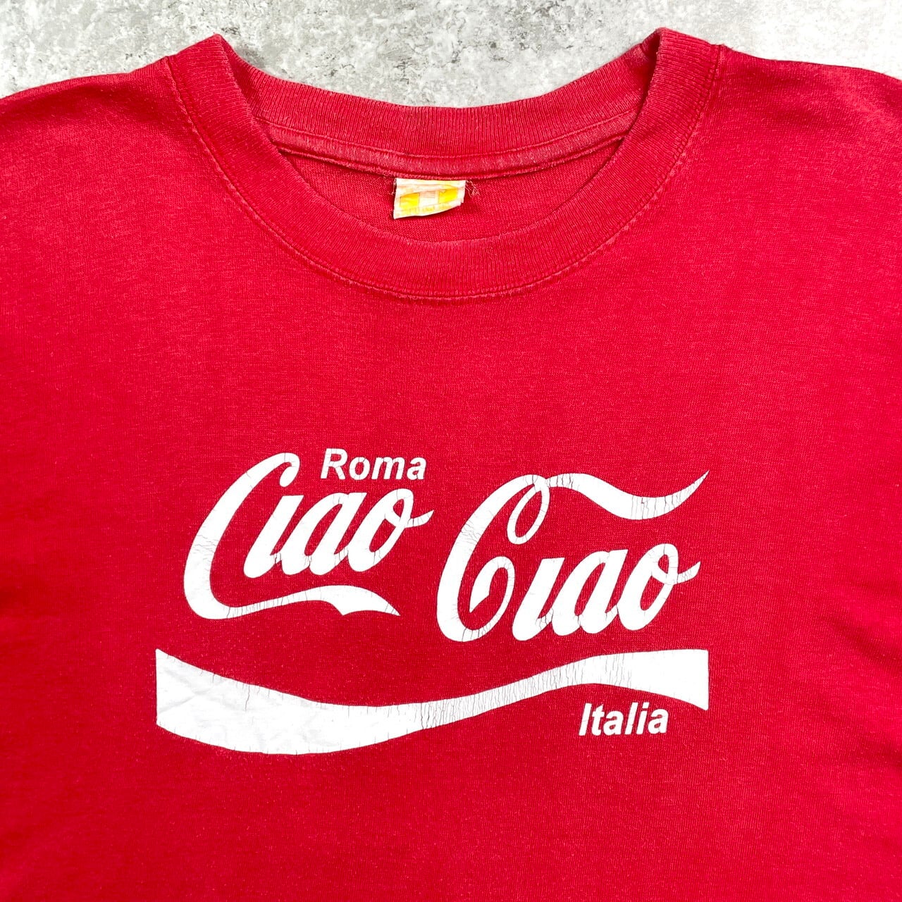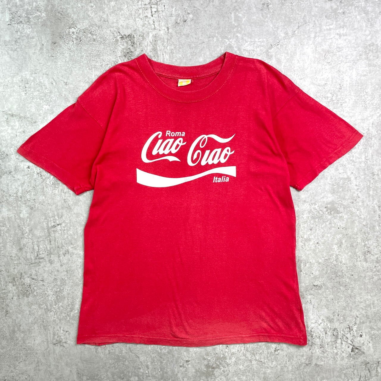 ■Ciao Ciao パロディプリントTシャツ イタリア ローマ スーベニア メンズS-M相当 古着 コカ・コーラ アドバタイジング 赤色【Tシャツ】/レッド 【サイズ】表記 不明 ※計測値をご確認ください。 着丈…63 身幅…53.5 肩幅…52 袖丈…19.5 【生産国】表記不明 【素材】コットン100% 【状態】裾に小さな色抜けが御座います。 また色あせや生地の歪み、毛玉が御座います。 画像にてご確認ください。 【c250612065】 ※古着は洗濯、検品などのケアを行っております。(新品・デッドストックは洗濯していません。) ※モニターの発色により実物と異なる場合がございます。予めご了承ください。 ※ 海外直輸入USED品になります。