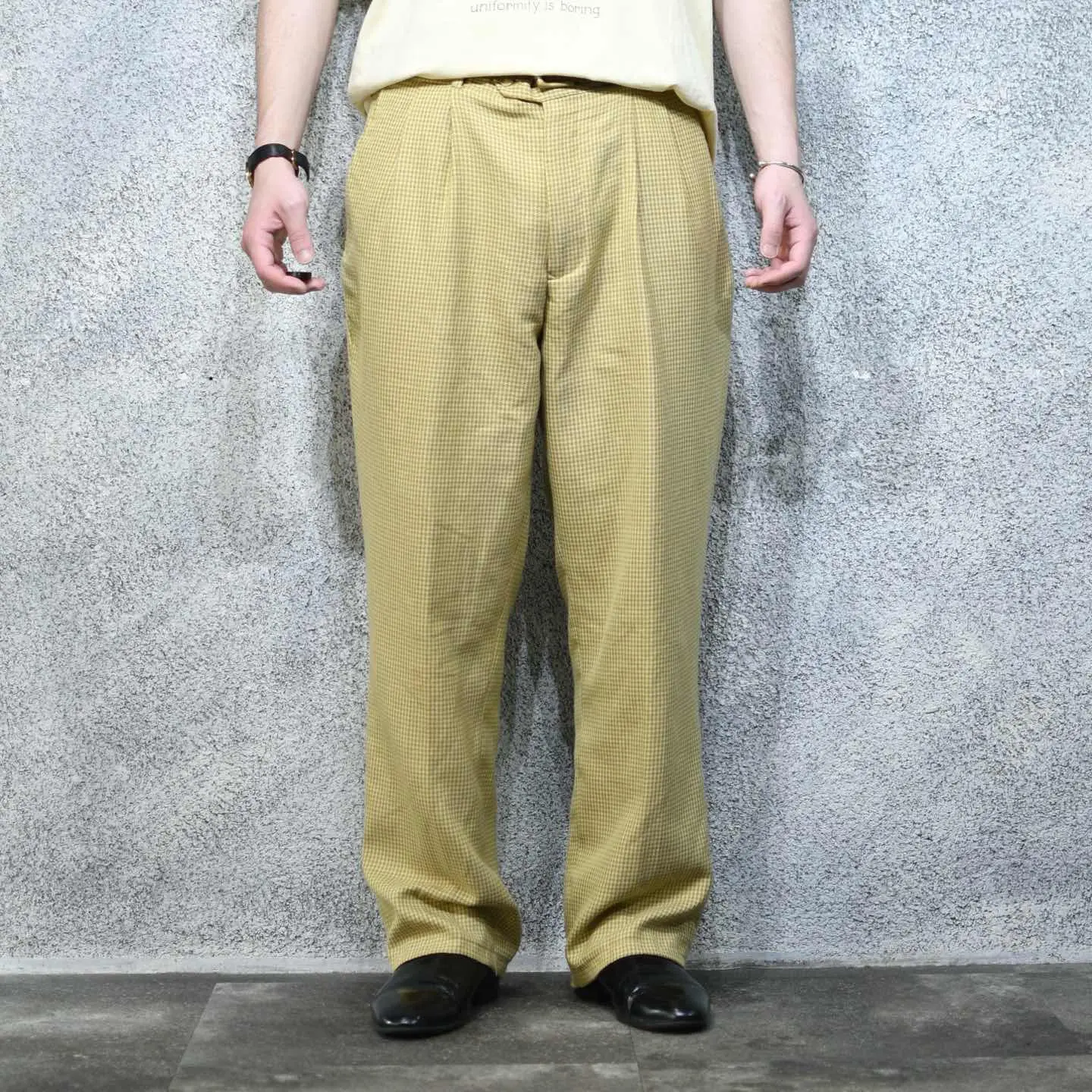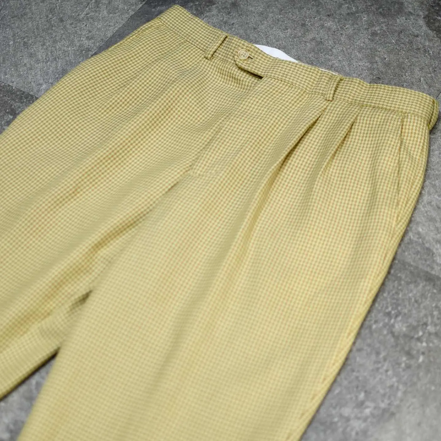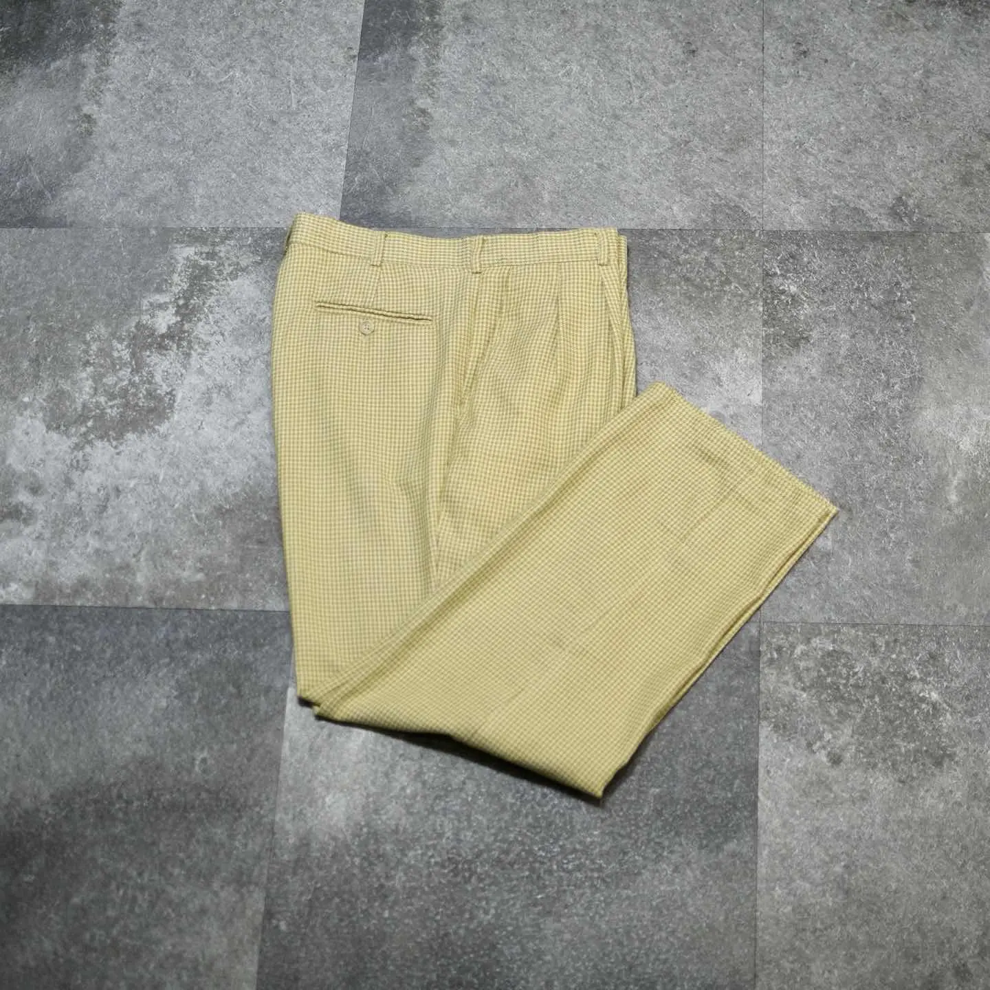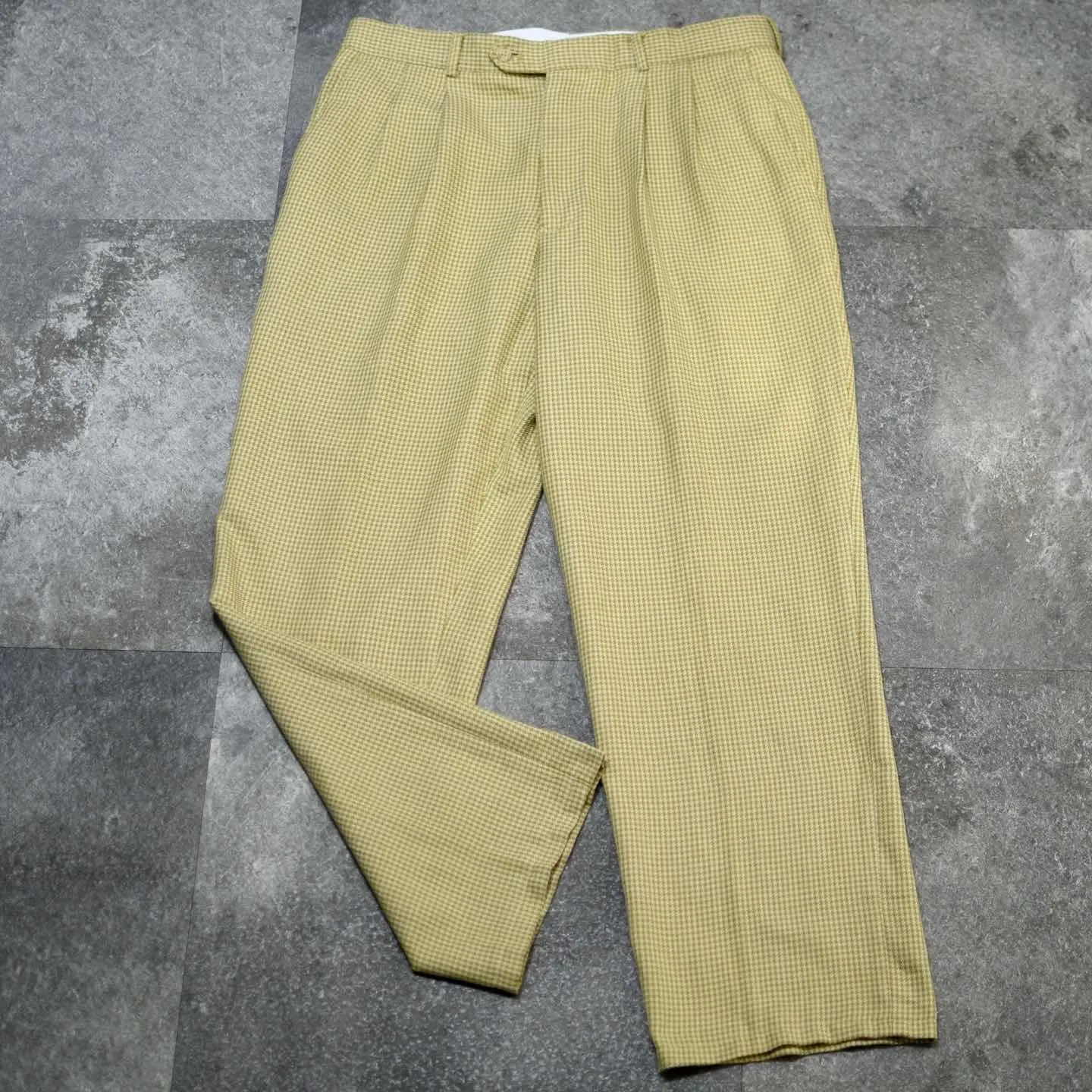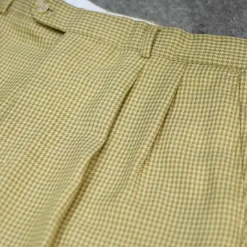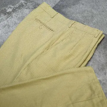 ウエスト86cm 総丈103cm 股下74cm わたり37cm 裾幅24cm fabric/rayon・poly 着用画像 177cm/64kg 最近この辺りのベージュ寄りの色味をした スラックスを履いている方って、 意外に少ないなぁと思いました。 レーヨンを含んだ柔らかい生地感と、 程よい太さを保ちながら裾へと落ちる、 ワイドめなシルエット。 こんな大人びた色味で、千鳥格子という品のある、チェック柄のスラックスだからこそ、 規格外の太さではなく、使い勝手の良い 程よい太さのあるシルエットなのが 嬉しいポイント。 ※裾上げ等のレングス直しにつきましては、 購入前に、必ずご連絡お願い致します。 また、購入後の直しには対応出来かねます。 ※撮影状況により、実物と多少色が異なる 場合がございます。 ※古着を取り扱っているため、気づかない汚れや ほつれがある場合がございます。 予めご了承ください。 ※サイズは着用感で選んでおり、表記サイズではございません。 古着 オーバーサイズ old vintage ヴィンテージ used 80's 90's アメリカ古着 ユーロ古着 メンズ レディース POLO RALPH LAUREN Eddie Bauer OLD GAP Eddie Bauer LANDS' END ランズエンド LLBean エルエルビーン オールドギャップ エディーバウアー ラルフローレン ブルックスブラザーズ Brooks Brothers ベージュ ワイドパンツ チェックパンツ などがお好きな方 #vintage #オーバーサイズ #old #used #90s #80s #古着 #ヴィンテージ #アメリカ古着 #ユーロ古着 #古着男子 #古着女子 #LLBean #エルエルビーン #EddieBauer #エディーバウアー #oldgap #オールドギャップ #LANDSEND #ランズエンド #NAUTICA #ノーティカ #ラルフローレン #POLORALPHLAUREN #ブルックスブラザーズ #BrooksBrothers #ワイドパンツ #スラックス #タックパンツ #チェックパンツ #千鳥格子