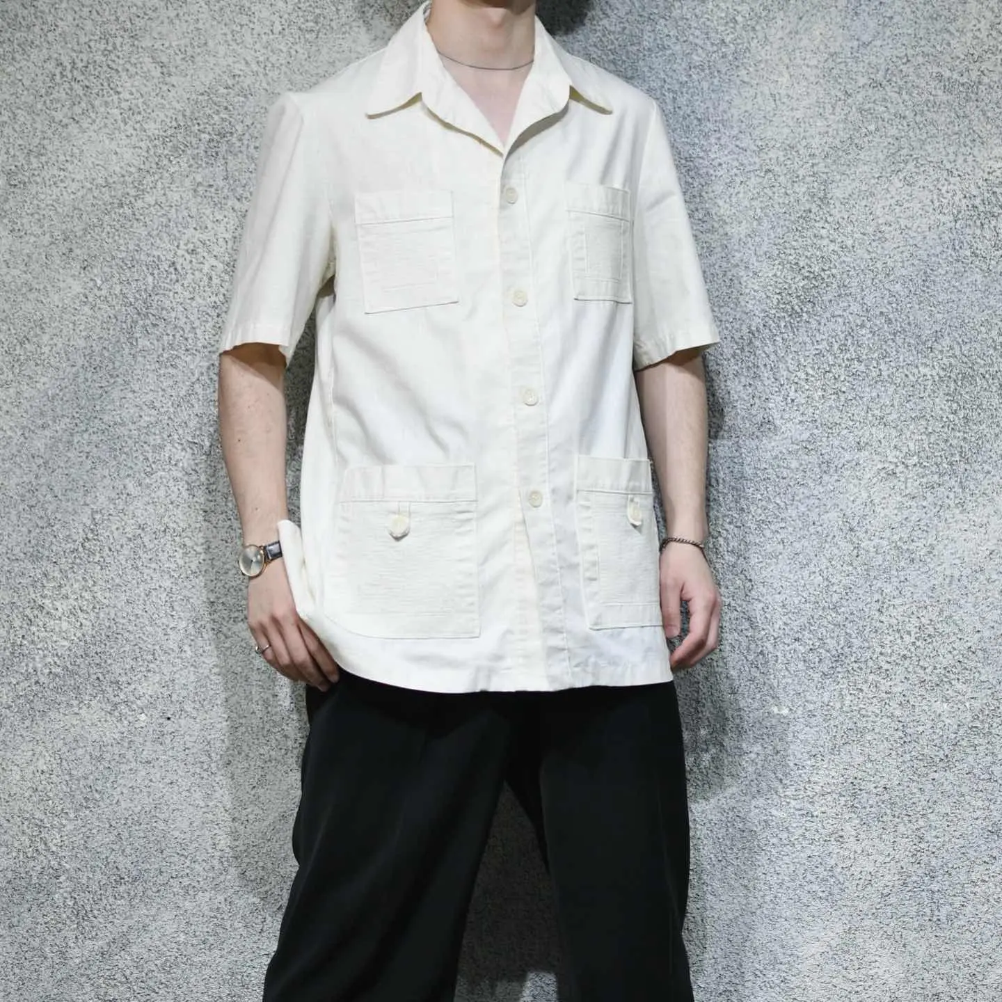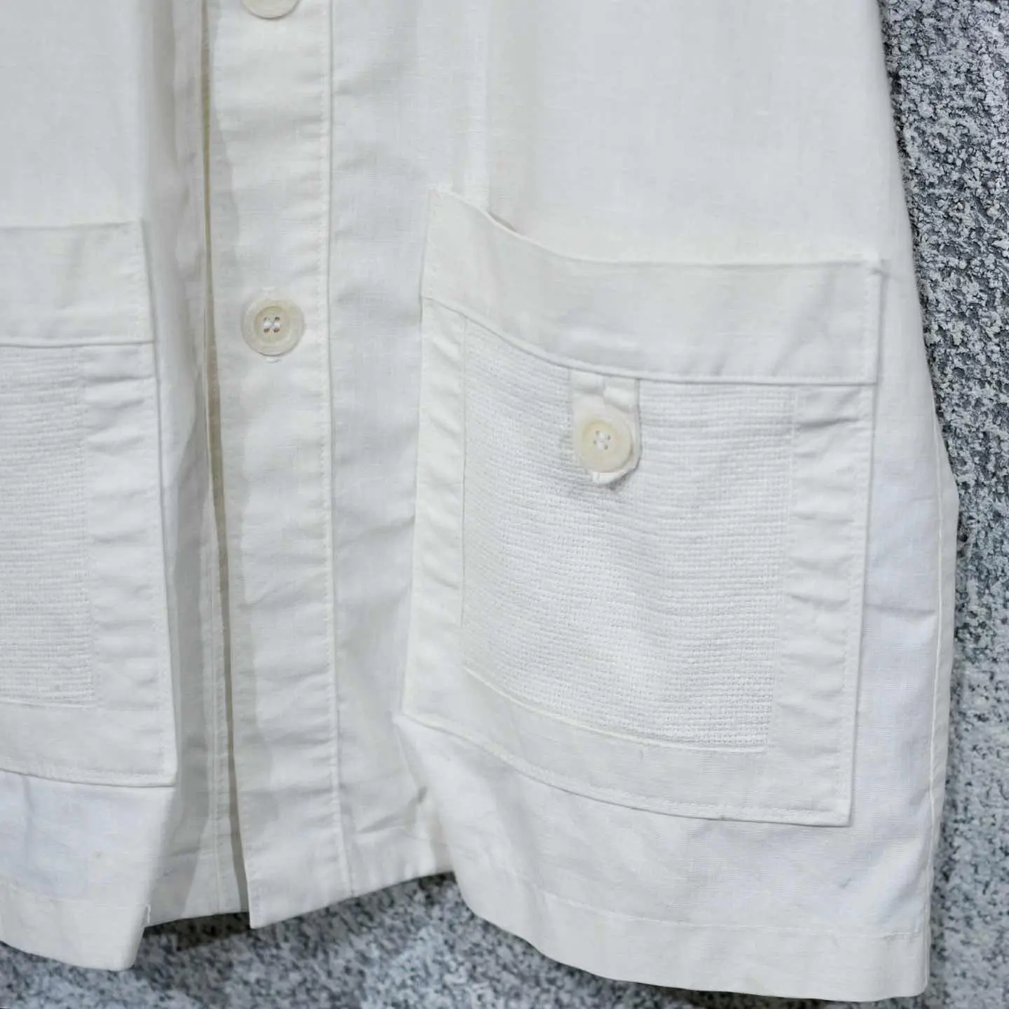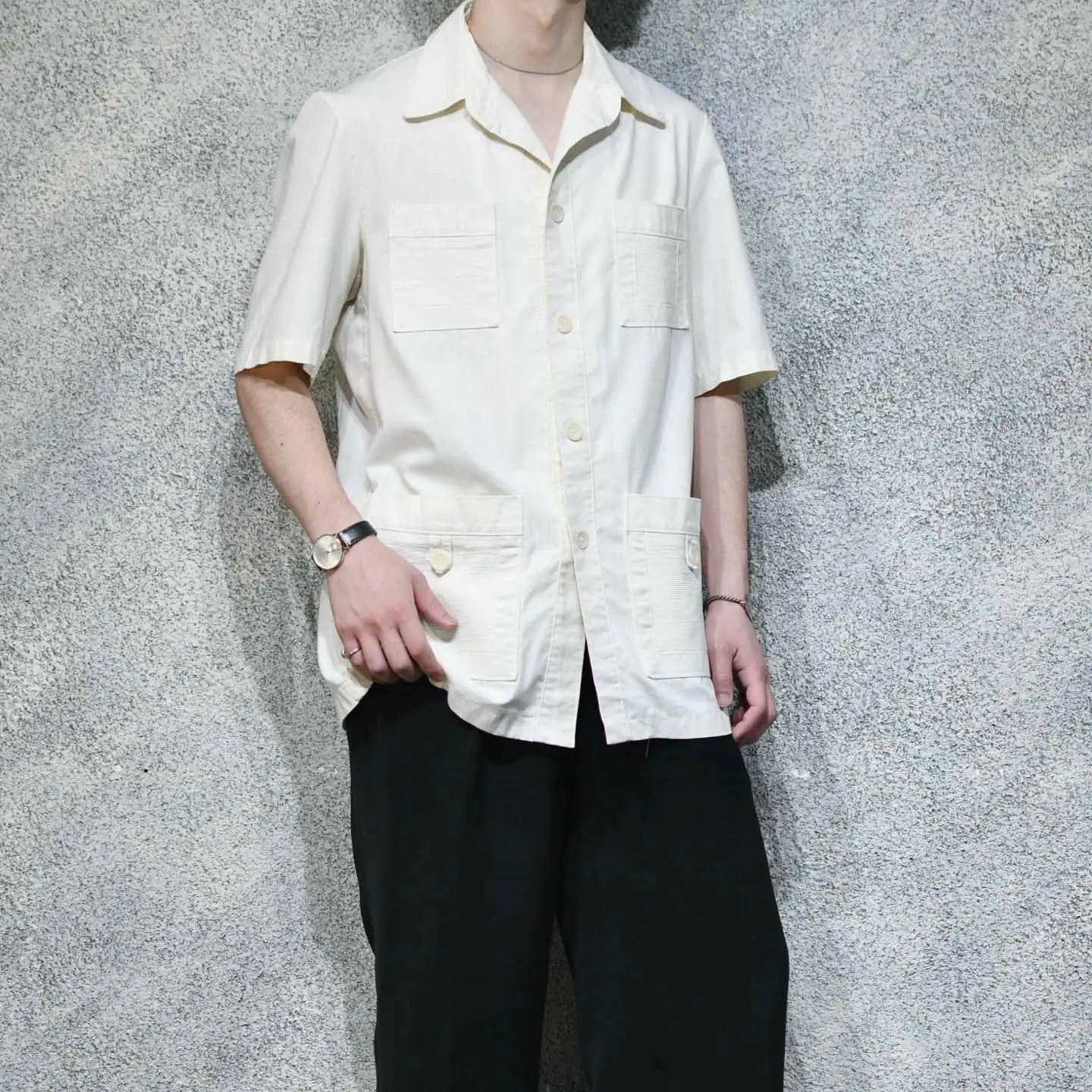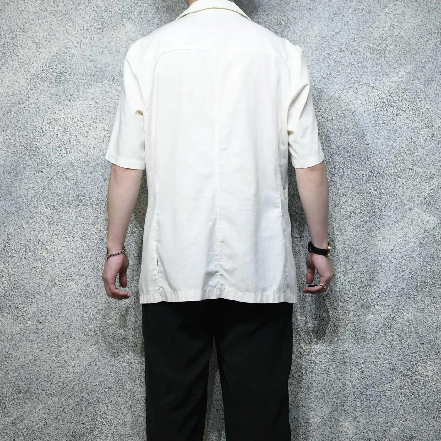 着丈79cm 肩幅48cm 身幅60cm 袖丈31cm fabric/質感よりlinen 着用画像 177cm/64kg 通常シャツというカテゴリーは、 シャツスリーブという袖の付き方をしていることが ほとんどですが、こちらはセットインスリーブで 袖が付いた1着。 テーラードジャケットやコートなどで用いられ、 立体的で筒状の袖が印象的で、フォーマルな印象を 纏うパターン。 恐らくこのシャツも、正装として着用されていたの ではないでしょうか。 半袖でありながらカジュアルにならず、 キレイめな印象で着れる、数少ない逸品です。 スラックスなど品のあるパンツで、雰囲気を まとめたスタイリングでどうぞ。 ※左袖に汚れあり。 ※撮影状況により、実物と多少色が異なる場合が ございます。 ※古着を取り扱っているため、気づかない汚れや ほつれ等がある場合がございます。 予めご了承ください。 ※サイズは着用感で選んでおり、表記サイズではございません。 古着 オーバーサイズ old vintage ヴィンテージ used 80's 90's アメリカ古着 ユーロ古着 メンズ レディース POLO RALPH LAUREN Eddie Bauer OLD GAP Eddie Bauer LANDS' END ランズエンド LLBean エルエルビーン オールドギャップ エディーバウアー ラルフローレン ブルックスブラザーズ Brooks Brothers ホワイト 白 オープンカラーシャツ 開襟シャツ などがお好きな方 #vintage #オーバーサイズ #old #used #90s #80s #古着 #ヴィンテージ #アメリカ古着 #ユーロ古着 #古着男子 #古着女子 #LLBean #エルエルビーン #EddieBauer #エディーバウアー #oldgap #オールドギャップ #LANDSEND #ランズエンド #NAUTICA #ノーティカ #ラルフローレン #POLORALPHLAUREN #ブルックスブラザーズ #BrooksBrothers #開襟シャツ #オープンカラーシャツ #半袖シャツ #デザインシャツ #リネンシャツ #キューバシャツ