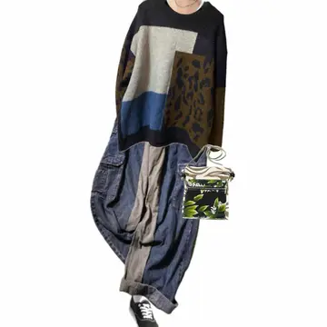 90年代 イタリア製 La squadra モヘア混 レザーパッチワーク ニットセーター メンズL相当 古着 90s VINTAGE ヴィンテージ ロールネック パープル ターコイズブルー ブラック グリーン 紫色 黒色 緑色