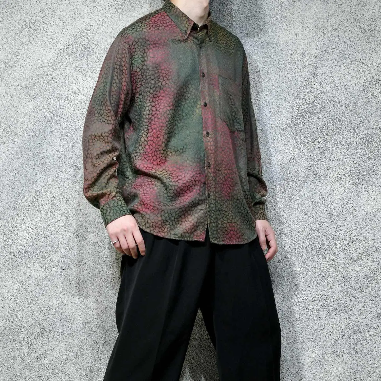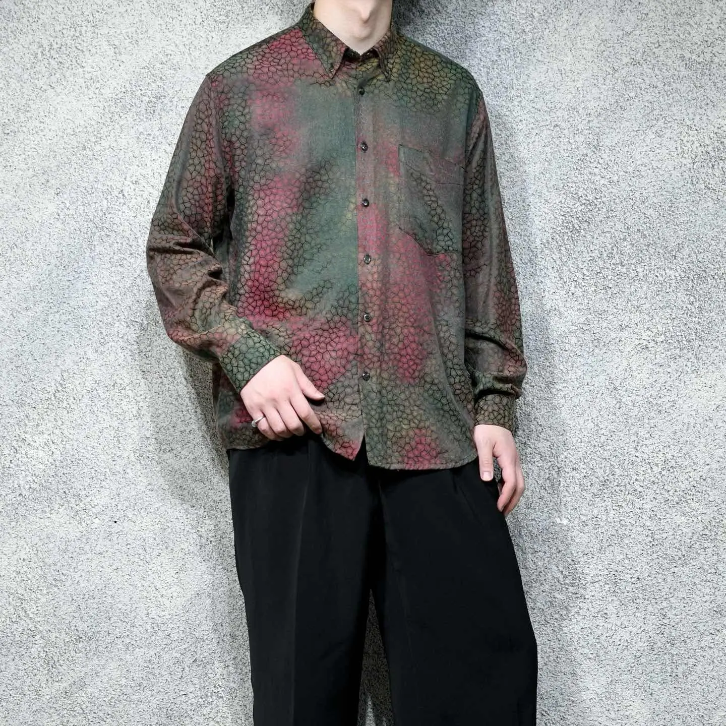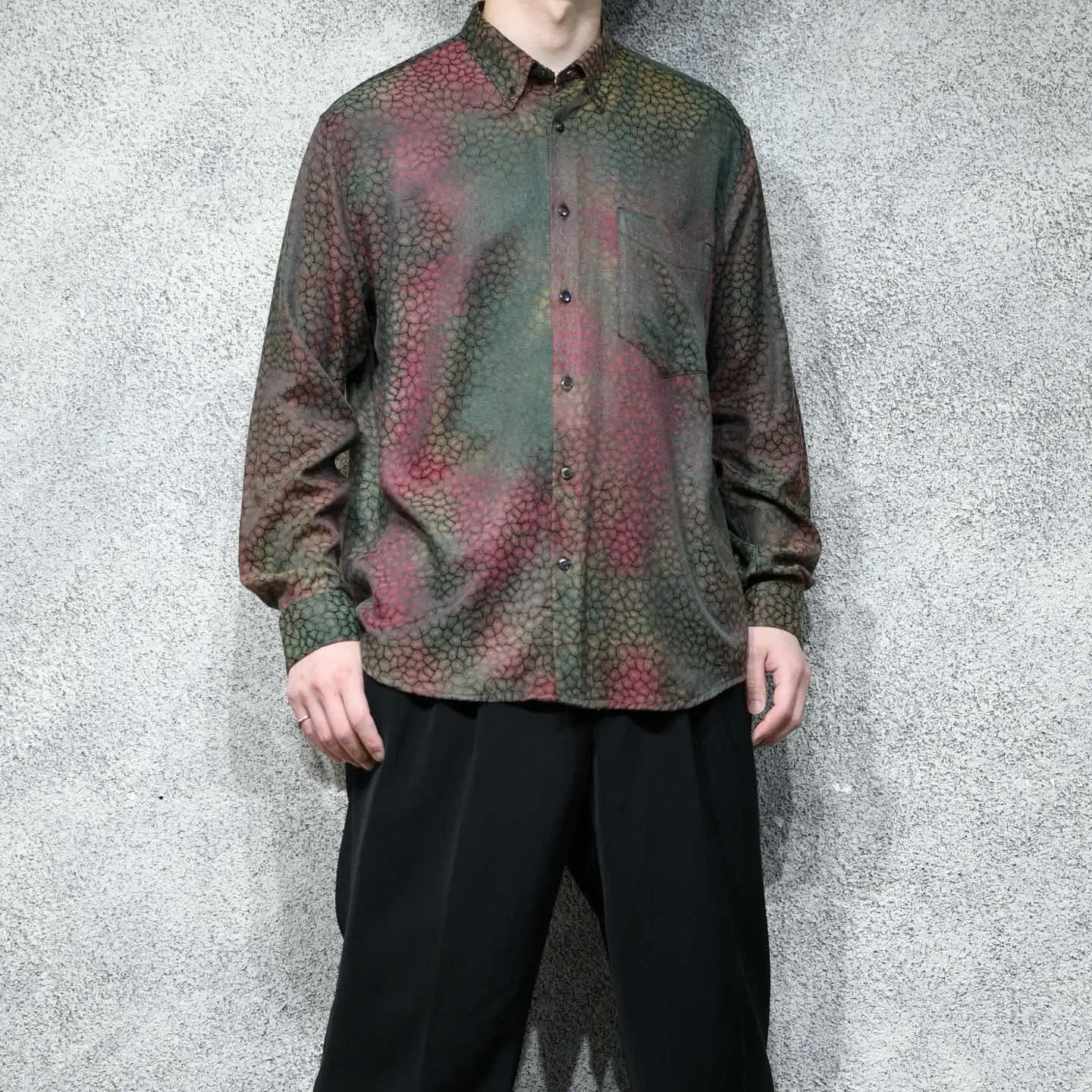 着丈76cm 肩幅52cm 身幅62cm 袖丈61cm fabric/cotton・poly made in SPAIN 着用画像 177cm/64kg 鱗のような、細胞のような、独特で雰囲気のある 色合いとデザインが施された柄シャツ。 柄シャツの中でも一際異彩を放つ1着で、 スペイン製というところにも、 どこか惹かれました。 存在感のある柄でありながら、深みのある色合いで スタイリングにも落とし込みやすく、 さらっと羽織りとしても活躍するのでは ないでしょうか。 個性の輝る柄シャツというカテゴリー、 中でも頭1つ秀でた逸品です。 ※撮影状況により、実物と多少色が異なる場合が ございます。 ※古着を取り扱っているため、気づかない汚れや ほつれ等がある場合がございます。 予めご了承ください。 ※サイズは着用感で選んでおり、表記サイズではございません。 古着 オーバーサイズ old vintage ヴィンテージ used 80's 90's アメリカ古着 ユーロ古着 メンズ レディース POLO RALPH LAUREN Eddie Bauer OLD GAP Eddie Bauer LANDS' END ランズエンド LLBean エルエルビーン オールドギャップ エディーバウアー ラルフローレン ブルックスブラザーズ Brooks Brothers カーキ ワインレッド バーガンディ 玉虫色 シャツ などがお好きな方 #vintage #オーバーサイズ #old #used #90s #80s #古着 #ヴィンテージ #アメリカ古着 #ユーロ古着 #古着男子 #古着女子 #LLBean #エルエルビーン #EddieBauer #エディーバウアー #oldgap #オールドギャップ #LANDSEND #ランズエンド #NAUTICA #ノーティカ #ラルフローレン #POLORALPHLAUREN #ブルックスブラザーズ #BrooksBrothers #デザインシャツ #長袖シャツ #シャツ #柄シャツ #総柄シャツ