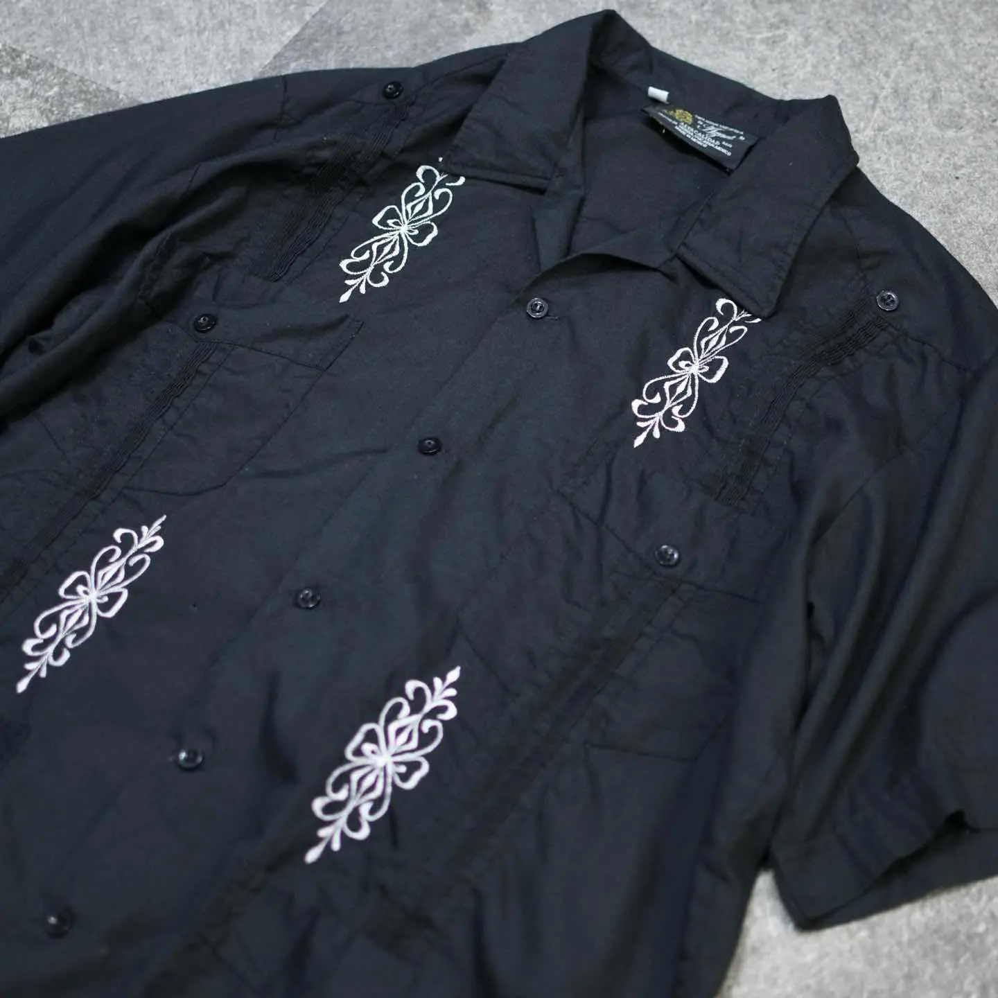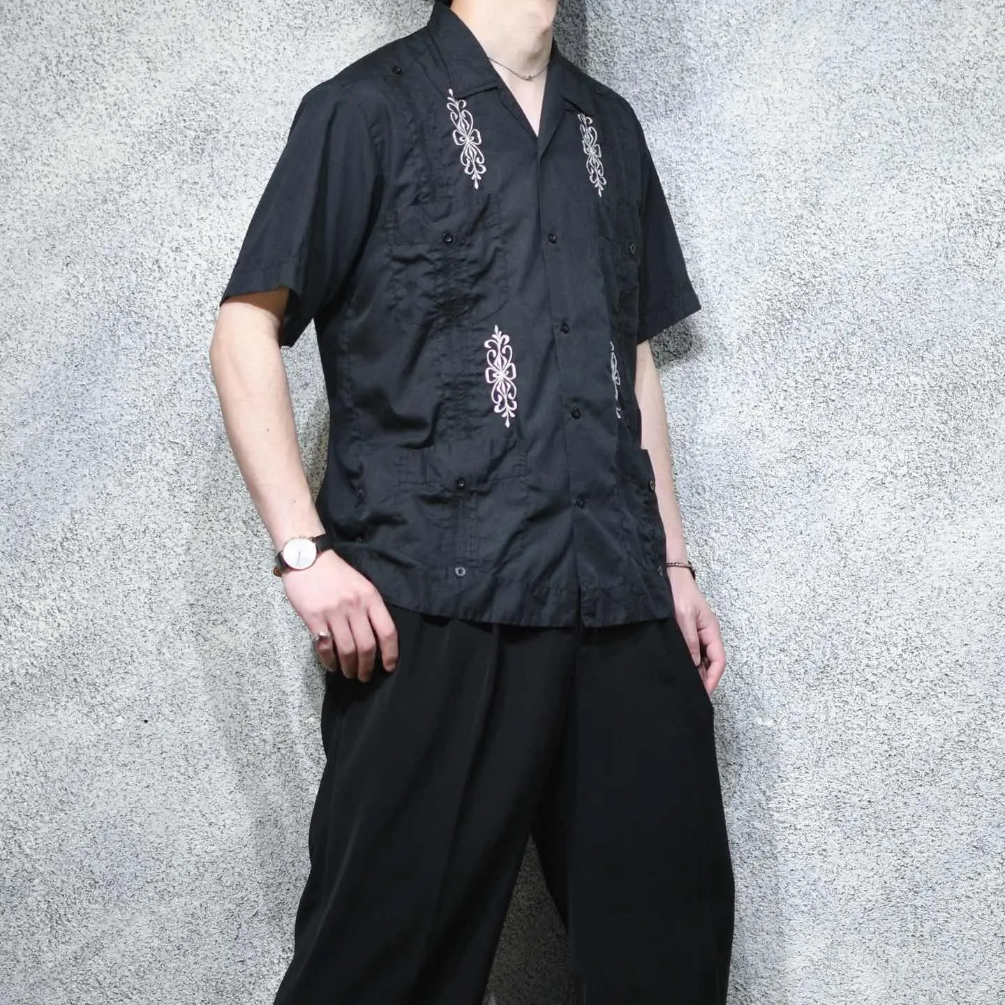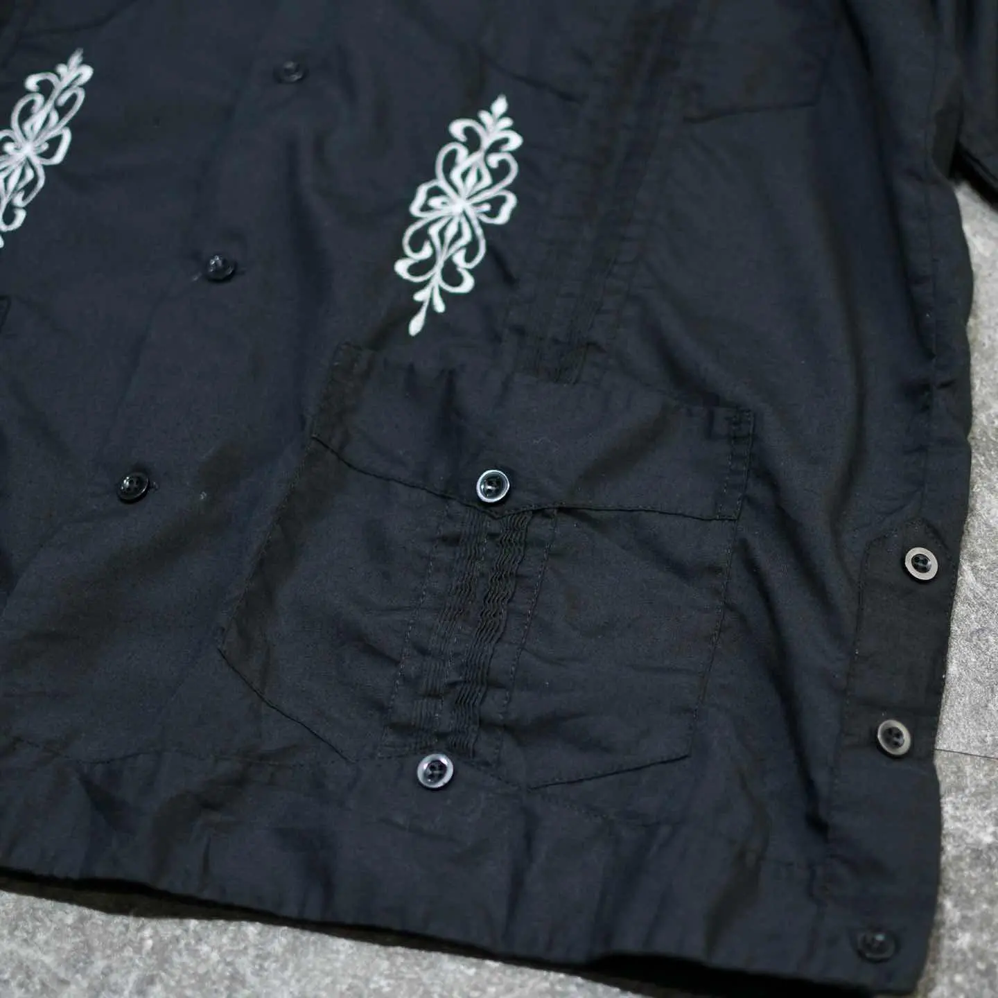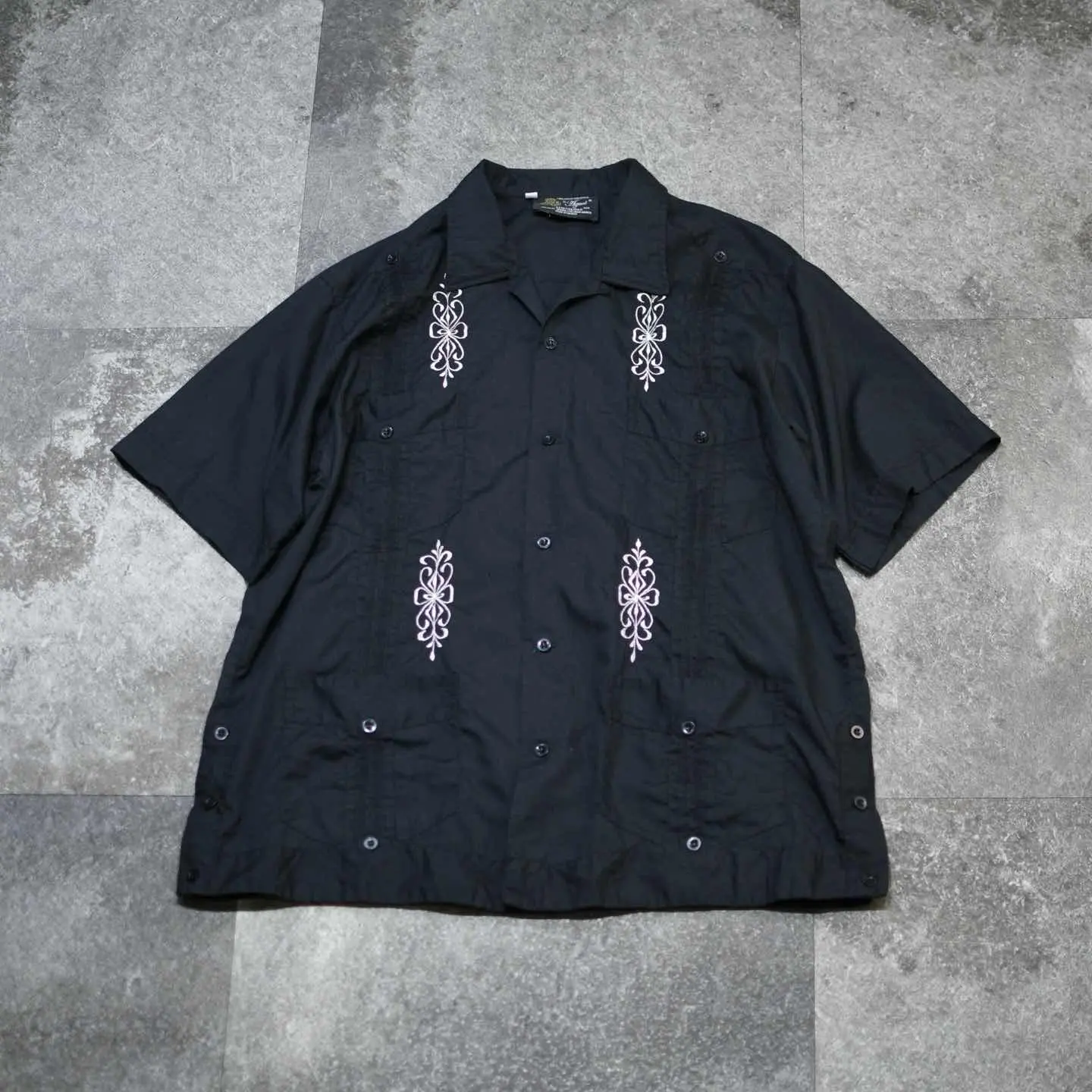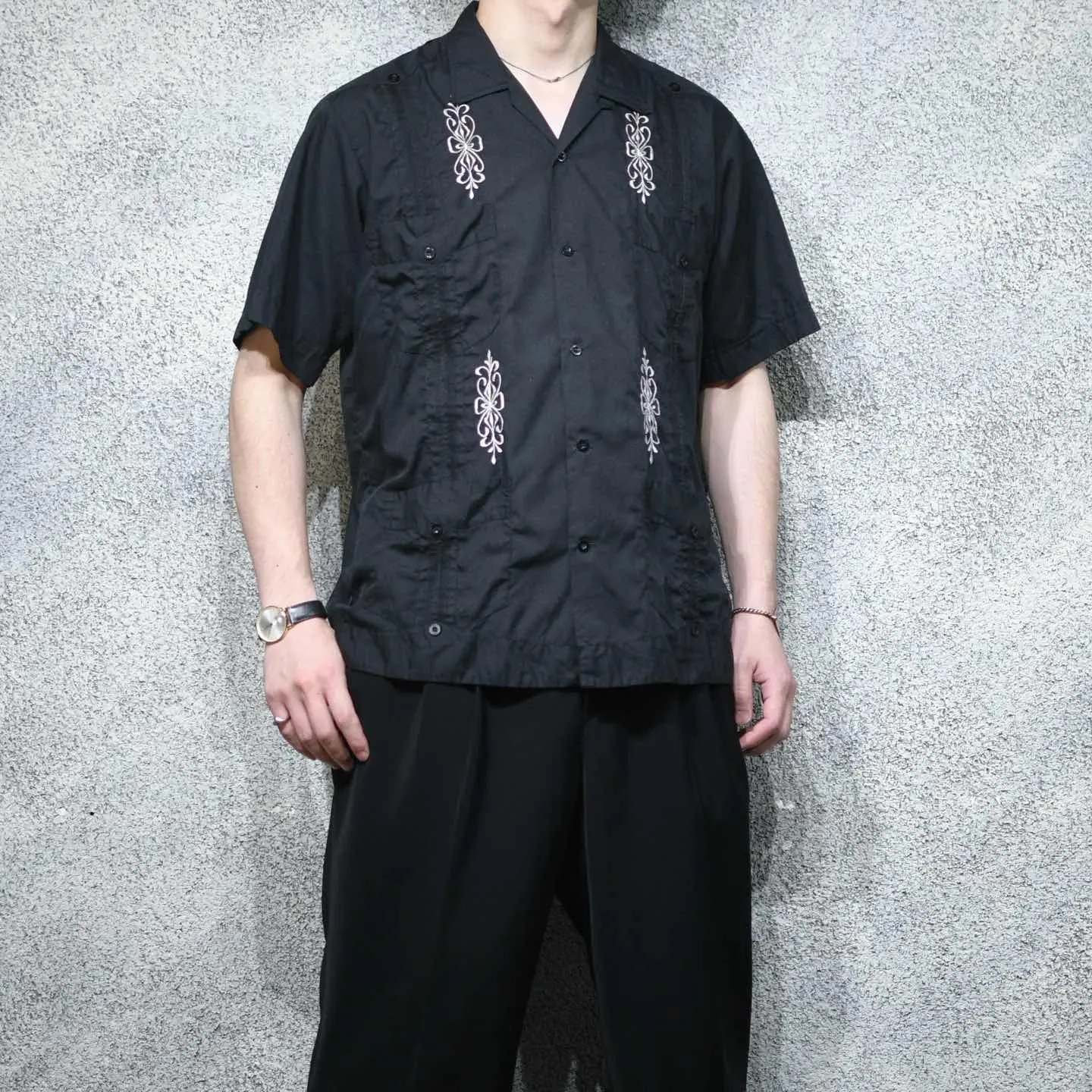 着丈73cm 肩幅47cm 身幅58cm 袖丈25cm fabric/coton・poly made in Mexico 着用画像 177cm/64kg 同色の刺繍ではなく、対色の刺繍が入る より品のあるキューバシャツ。 元々温暖な気候で着られている アイテムだからこそ、柔らかい色味の個体が多く 黒はぐっと球数が減る印象です。 現地では正装としても着られている キューバシャツ、カジュアルにデニムと合わせても スラックスと合わせても、塩梅良く纏まる逸品。 一癖ある半袖シャツとして、今年も活躍するのでは ないでしょうか。 ※フロントにピンホールあり。 ※撮影状況により、実物と多少色が異なる場合が ございます。 ※古着を取り扱っているため、気づかない汚れや ほつれ等がある場合がございます。 予めご了承ください。 ※サイズは着用感で選んでおり、表記サイズではございません。 古着 オーバーサイズ old vintage ヴィンテージ used 80's 90's アメリカ古着 ユーロ古着 メンズ レディース POLO RALPH LAUREN Eddie Bauer OLD GAP Eddie Bauer LANDS' END ランズエンド LLBean エルエルビーン オールドギャップ エディーバウアー ラルフローレン ブルックスブラザーズ Brooks Brothers 黒 オープンカラーシャツ グアテマラシャツ などがお好きな方 #vintage #オーバーサイズ #old #used #90s #80s #古着 #ヴィンテージ #アメリカ古着 #ユーロ古着 #古着男子 #古着女子 #LLBean #エルエルビーン #EddieBauer #エディーバウアー #oldgap #オールドギャップ #LANDSEND #ランズエンド #NAUTICA #ノーティカ #ラルフローレン #POLORALPHLAUREN #ブルックスブラザーズ #BrooksBrothers #半袖シャツ #キューバシャツ #グアテマラシャツ #デザインシャツ #刺繍 #オープンカラーシャツ #開襟シャツ