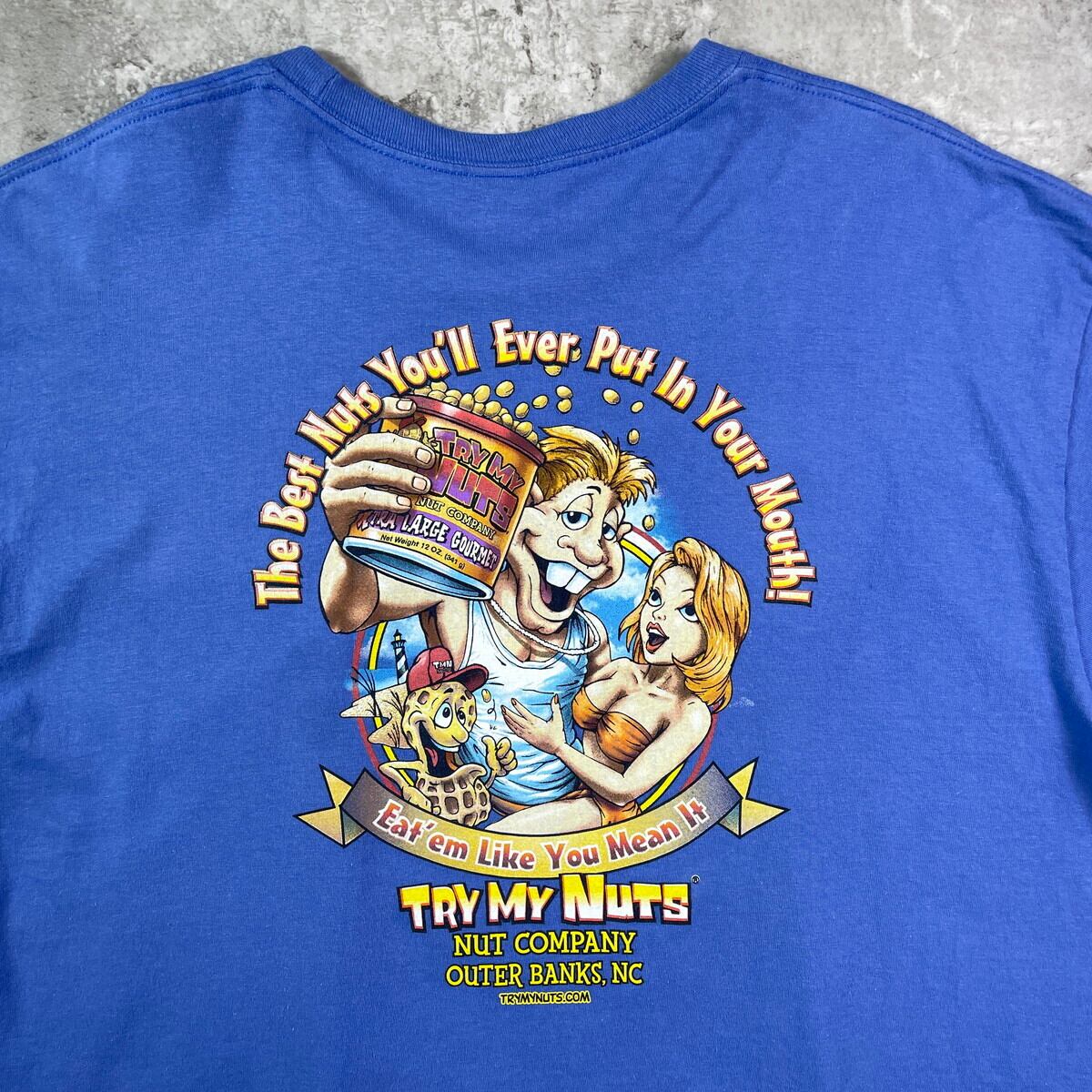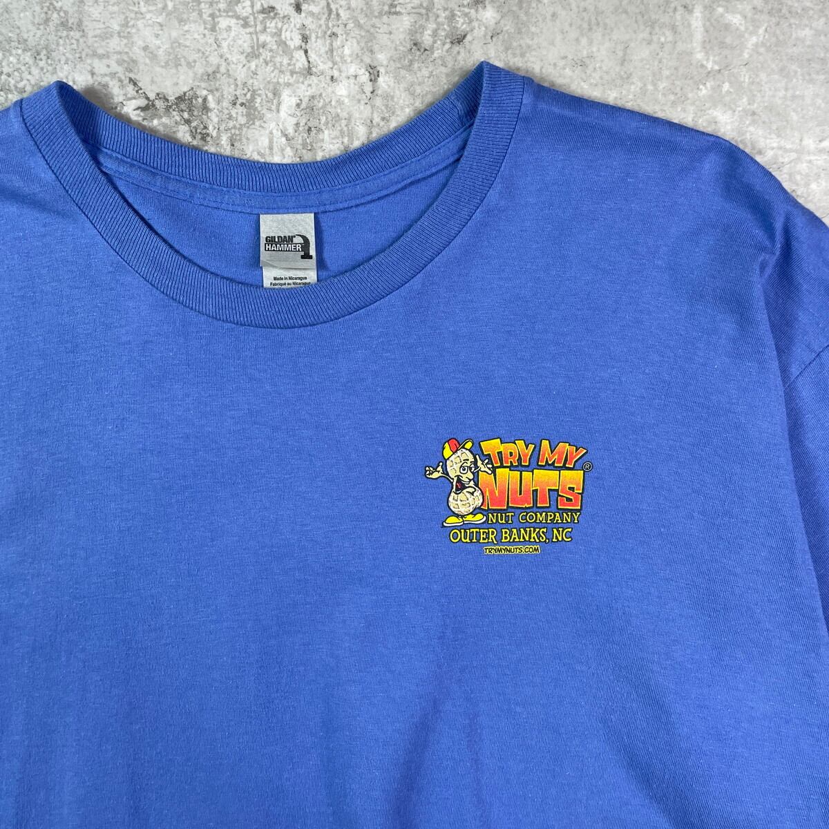 ■NUT COMPANY OUTER BANKS 企業ロゴ プリントTシャツ メンズXL 古着 TRY MY NUTS ピーナッツ バックプリント ブルーパープル【Tシャツ】/ブルー 【ブランド】GILDAN 【サイズ】表記XL ※計測値をご確認ください。 着丈…72.5 身幅…60 肩幅…57 袖丈…22 【生産国】ニカラグア製 【素材】コットン100% 【状態】全体的に使用感による色褪せがございます。 バックサイド下部に若干のシミ汚れがあります。 画像にてご確認ください。 【c250715102】 ※古着は洗濯、検品などのケアを行っております。(新品・デッドストックは洗濯していません。) ※モニターの発色により実物と異なる場合がございます。予めご了承ください。 ※ 海外直輸入USED品になります。