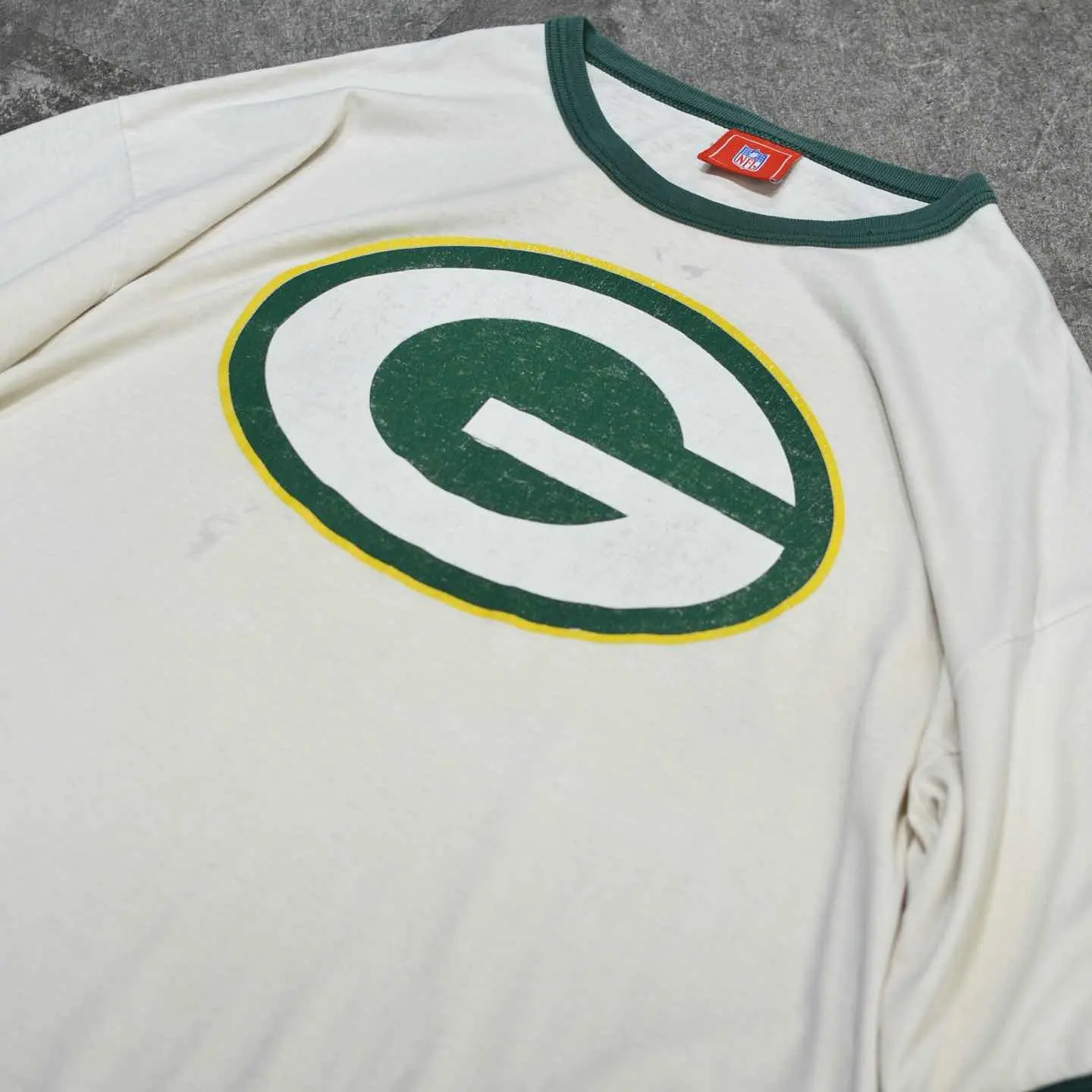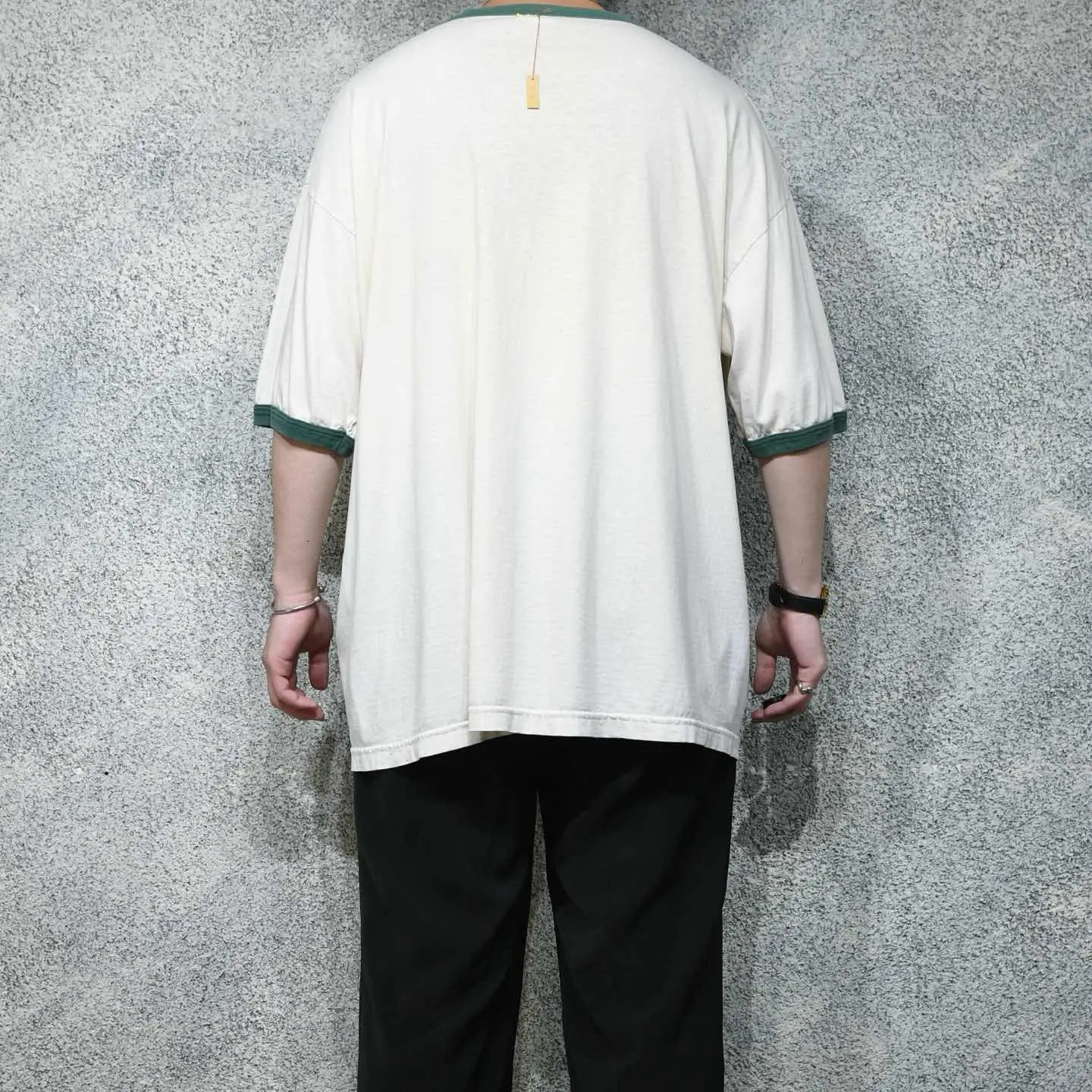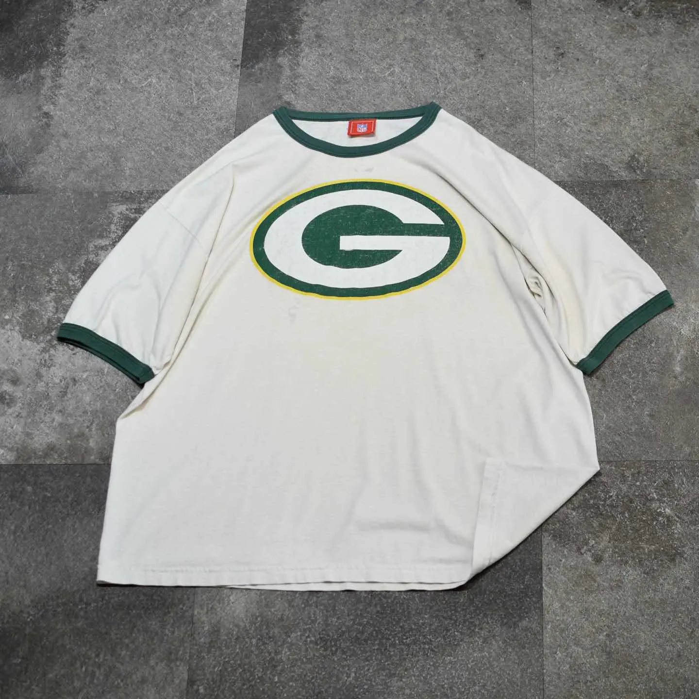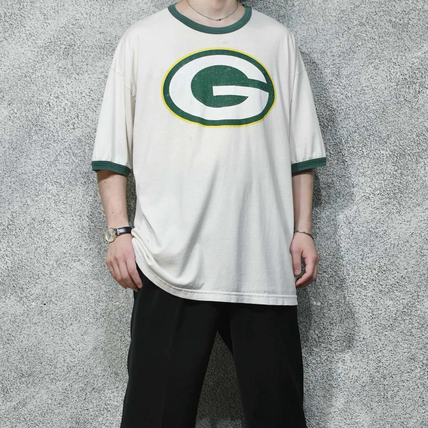 着丈75cm(ダブルステッチ) 肩幅68cm 身幅70cm 袖丈27cm fabric/cotton 着用画像 177cm/64kg アメリカンプロフットボールチームの "green bay packers "のロゴがプリントされた、 リンガーTシャツ。 個人的に何か縁があったわけではなく、 単純にヤレたボディと程よいダメージ、 そんな風合いに惹かれました。 スラックスと合わせてバランスを取っても、 デニムやチノなどのカジュアルなパンツで 合わせても◎ ※フロントにペンキの飛び、ダメージあり。 ※撮影状況により、実物と多少色が異なる場合が ございます。 ※古着を取り扱っているため、気づかない汚れや ほつれ等がある場合がございます。 予めご了承ください。 ※サイズは着用感で選んでおり、表記サイズではございません。 古着 オーバーサイズ old vintage ヴィンテージ used 80's 90's アメリカ古着 ユーロ古着 メンズ レディース POLO RALPH LAUREN Eddie Bauer OLD GAP Eddie Bauer LANDS' END ランズエンド LLBean エルエルビーン オールドギャップ エディーバウアー ラルフローレン ブルックスブラザーズ Brooks Brothers 半袖Tシャツ 緑 グリーン フットボール などがお好きな方 #vintage #オーバーサイズ #old #used #90s #80s #古着 #ヴィンテージ #アメリカ古着 #ユーロ古着 #古着男子 #古着女子 #LLBean #エルエルビーン #EddieBauer #エディーバウアー #oldgap #オールドギャップ #LANDSEND #ランズエンド #NAUTICA #ノーティカ #ラルフローレン #POLORALPHLAUREN #ブルックスブラザーズ #BrooksBrothers #プリントTシャツ #Tシャツ #リンガーTシャツ #ダメージTシャツ #半袖Tシャツ