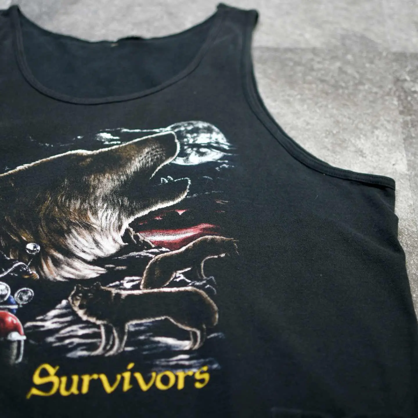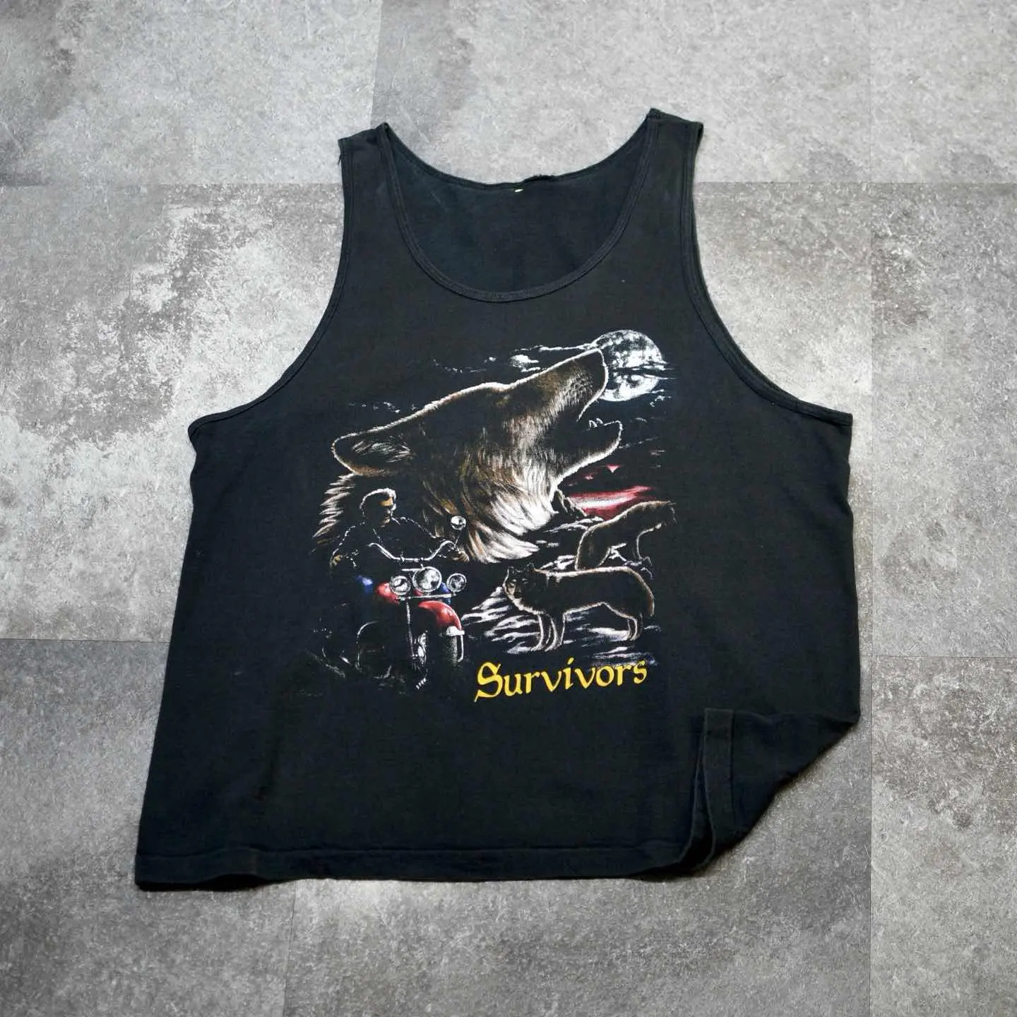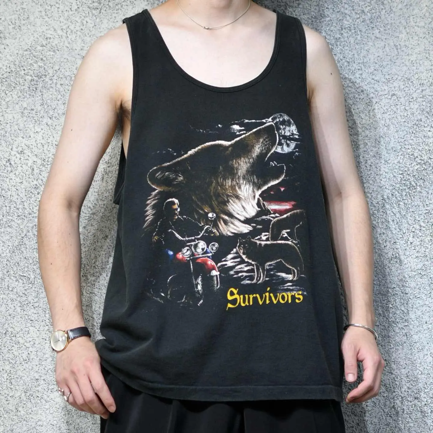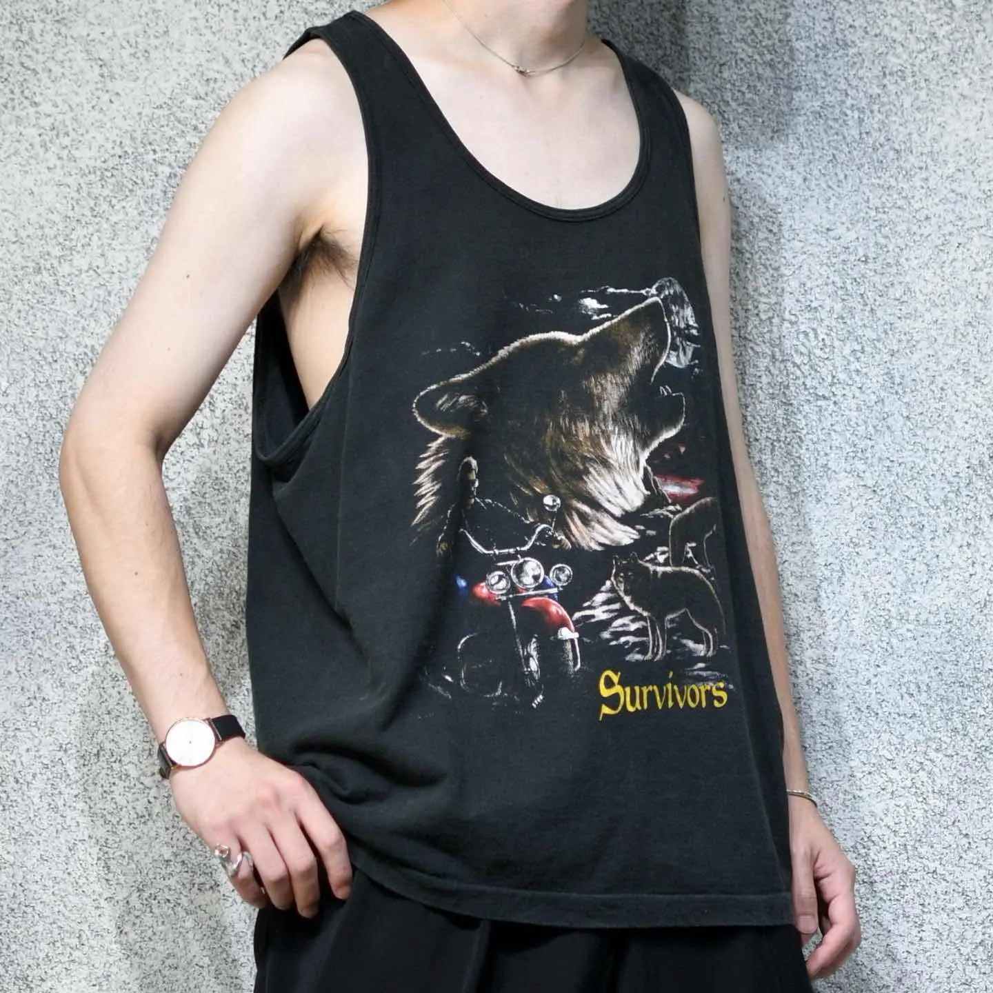着丈65cm(シングルステッチ) 肩幅36cm 身幅63cm fabric/質感よりcotton 着用画像 177cm/64kg 古着の中でも、なかなか惹かれる個体に 出会う確率が低い、タンクトップ。 その中でもこちらは、どこかハーレーみを感じた 1着でした。 シャツの上から羽織っても、しっかり存在感のある プリントで、ややラフにそしてちょっぴりダサく。 その塩梅が最高なタンクトップです。 タンクトップというカテゴリーでさらに シングルステッチという点も、加えて嬉しい。 ※着用画像撮影後、洗濯済み ※撮影状況により、実物と多少色が異なる場合が ございます。 ※古着を取り扱っているため、気づかない汚れや ほつれ等がある場合がございます。 予めご了承ください。 ※サイズは着用感で選んでおり、表記サイズではございません。 古着 オーバーサイズ old vintage ヴィンテージ used 80's 90's アメリカ古着 ユーロ古着 メンズ レディース POLO RALPH LAUREN Eddie Bauer OLD GAP Eddie Bauer LANDS' END ランズエンド LLBean エルエルビーン オールドギャップ エディーバウアー ラルフローレン ブルックスブラザーズ Brooks Brothers ブラック 黒 アニマルプリント などがお好きな方 #vintage #オーバーサイズ #old #used #90s #80s #古着 #ヴィンテージ #アメリカ古着 #ユーロ古着 #古着男子 #古着女子 #LLBean #エルエルビーン #EddieBauer #エディーバウアー #oldgap #オールドギャップ #LANDSEND #ランズエンド #NAUTICA #ノーティカ #ラルフローレン #POLORALPHLAUREN #ブルックスブラザーズ #BrooksBrothers #シングルステッチ #タンクトップ #ノースリーブ #アニマルプリント
