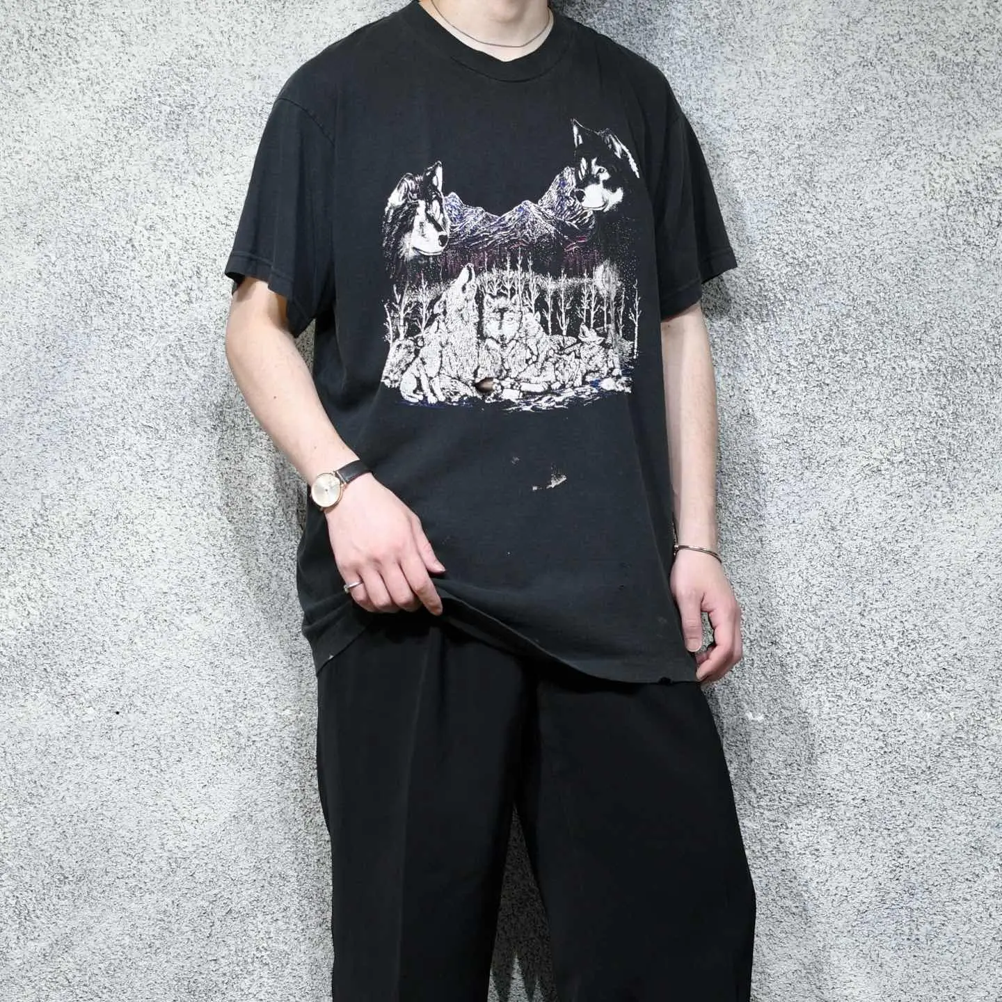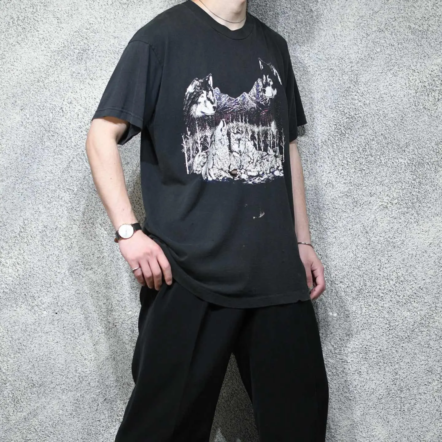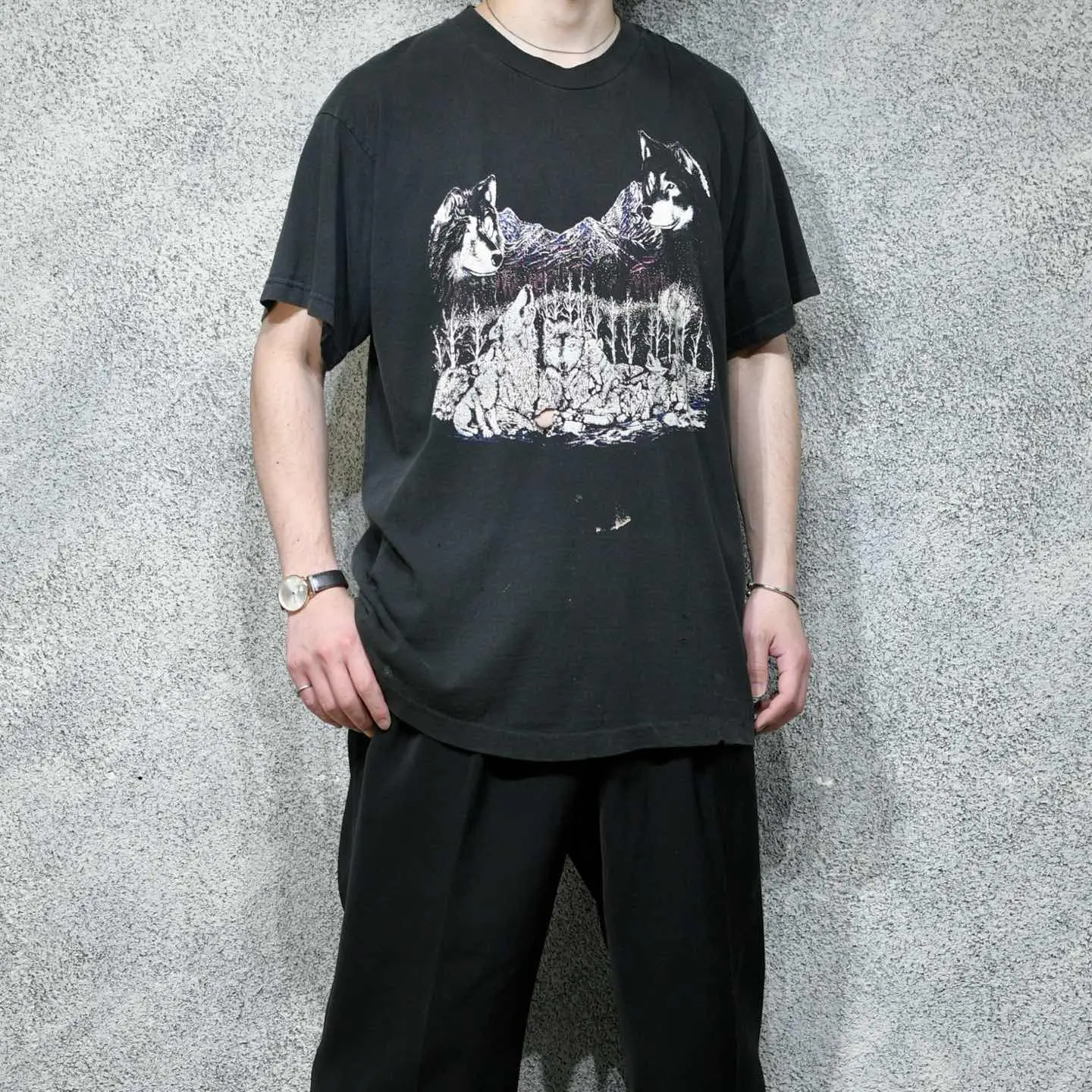 着丈75cm 肩幅57cm 身幅62cm 袖丈21cm(シングルステッチ) fabric/cotton 着用画像 177cm/64kg モノトーンのプリントをベースに、 所々にピンクや青などカラーのプリントも 施されたアニマルTシャツ。 程良いダメージや、くたびれたボディなど アニマルプリントと相性の良い状態で、 尚且つ色の入るプリントで、より雰囲気を昇華。 チノやデニム、軍パンなどと合わせたい1着です。 ※フロントにダメージあり。 ※撮影状況により、実物と多少色が異なる場合が ございます。 ※古着を取り扱っているため、気づかない汚れや ほつれ等がある場合がございます。 予めご了承ください。 ※サイズは着用感で選んでおり、表記サイズではございません。 古着 オーバーサイズ old vintage ヴィンテージ used 80's 90's アメリカ古着 ユーロ古着 メンズ レディース POLO RALPH LAUREN Eddie Bauer OLD GAP Eddie Bauer LANDS' END ランズエンド LLBean エルエルビーン オールドギャップ エディーバウアー ラルフローレン ブルックスブラザーズ Brooks Brothers ブラック 黒 オオカミ 狼 アニマルプリント 半袖Tシャツ Tシャツ ダメージTシャツ などがお好きな方 #vintage #オーバーサイズ #old #used #90s #80s #古着 #ヴィンテージ #アメリカ古着 #ユーロ古着 #古着男子 #古着女子 #LLBean #エルエルビーン #EddieBauer #エディーバウアー #oldgap #オールドギャップ #LANDSEND #ランズエンド #NAUTICA #ノーティカ #ラルフローレン #POLORALPHLAUREN #ブルックスブラザーズ #BrooksBrothers #半袖Tシャツ #Tシャツ #プリントTシャツ #アニマルTシャツ #アニマルプリント #シングルステッチ #ダメージTシャツ