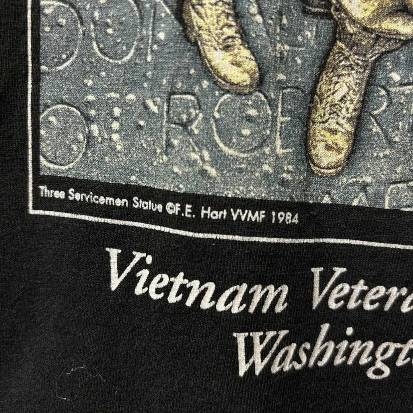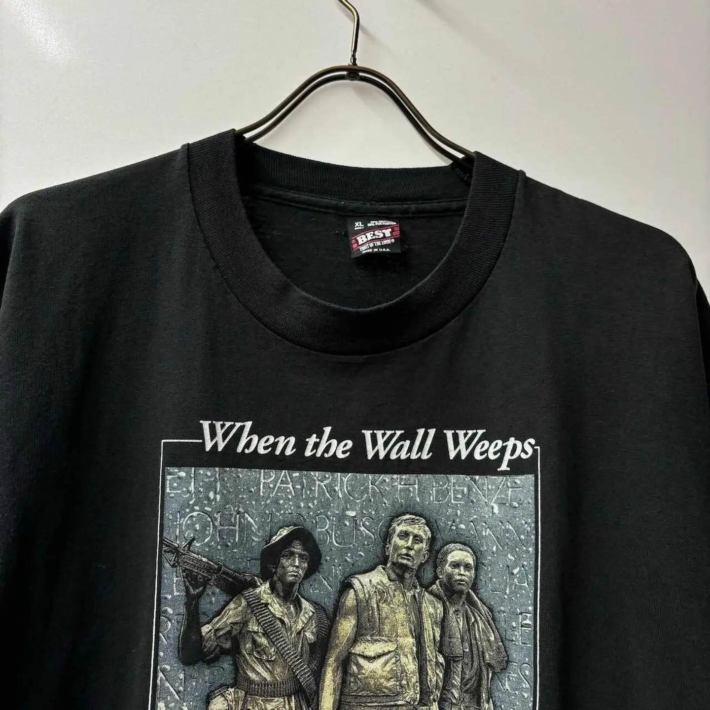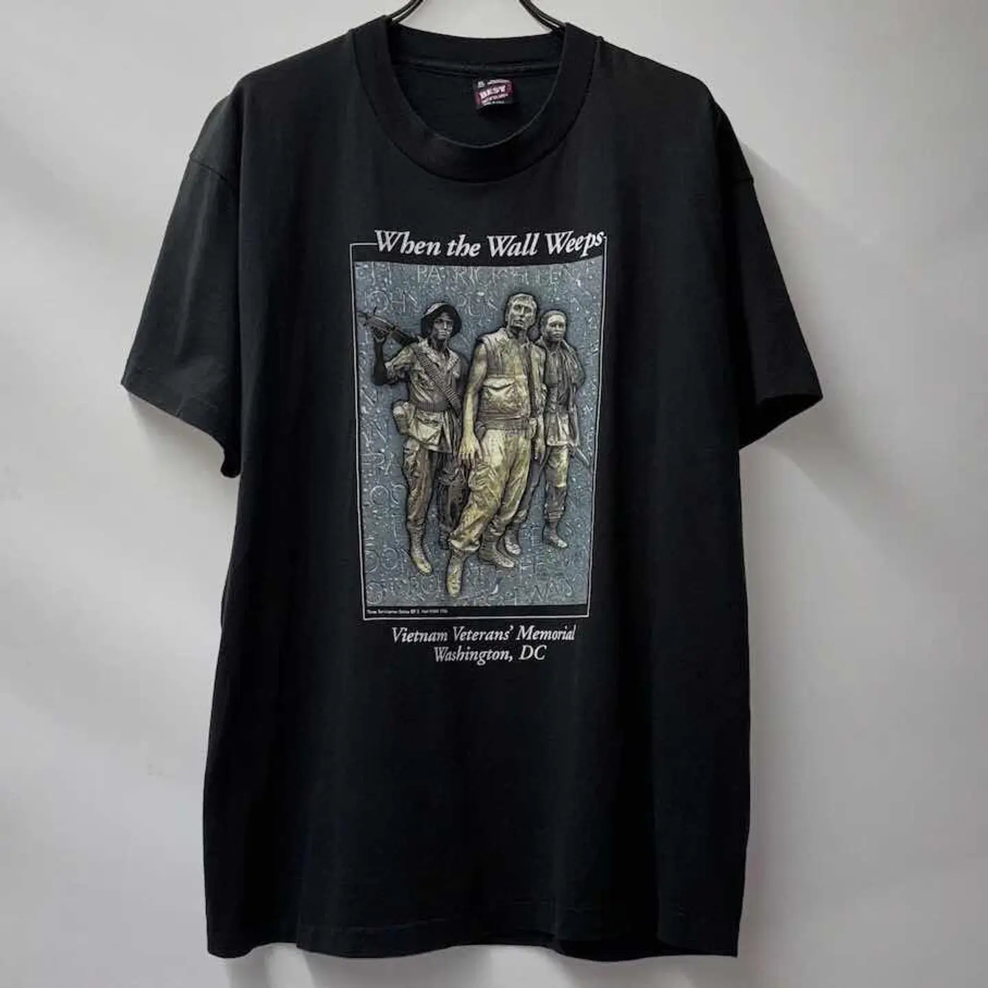 アメリカの首都ワシントンD.C.にあるベトナム戦争戦没者慰霊碑「Vietnam Veterans Memorial」のモニュメント「Three Servicemen Statue」をモチーフにしたプリントTシャツ。 タイトルの「When the Wall Weeps(壁が涙を流すとき)」は、 戦没者の名前が刻まれた壁に映る自分の姿を見つめるベトナム帰還兵の気持ちを象徴した詩的なフレーズです。 時代背景や社会的なメッセージ性を感じさせる1着で、ストリートスタイルやモードな着こなしにも映えるアイテムです。 USA製、Fruit of the Loomの「BEST」タグ付きで素材はコットン×ポリエステル。 洗いざらしのような風合いと、程よいフェード感が古着らしい雰囲気を引き立てます。 ボトムスは軍パンやブラックデニムとの相性が抜群で、年代感あるスニーカーやブーツでまとめても◎ サイズ(表記:XL) 肩幅:55cm 袖丈:18cm 身幅:59cm 着丈:70cm ▶︎ 目安:170〜180cm前後の方におすすめ。 ゆったり着たい160cm台の方にも◎ 【素材・カラー・生産国】 素材:50%コットン、50%ポリエステル(プリシュランク) カラー:ブラック 生産国:アメリカ製 ブランド:Fruit of the Loom(BESTタグ) コンディション【B】 【コンディションランク】 S:新品・デッドストック A:使用感少なめでキレイ B:使用感あり(軽微な汚れ・シミあり) C:ややダメージあり D:大きなダメージあり スタイリング提案 ・軍パンやブラックデニムと合わせて、無骨なアメカジスタイルに ・インナーに白ロングスリーブを差して、90sレイヤードを楽しむのも◎ ・ジャケットのインナーにも存在感のあるプリントが映えます ご注意 ・古着商品のため、細かなキズや汚れがある場合があります ・一点物となりますので、気になる方はお早めにご購入ください ・ご利用のモニター環境により、色味が異なる場合があります #vintage #古着 #90s #used #古着男子 #80s #古着女子 #アメリカ古着