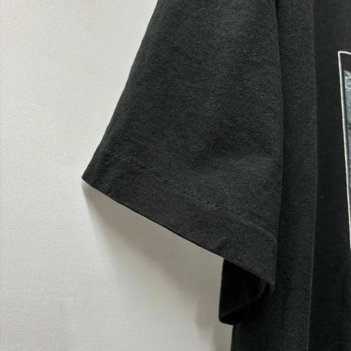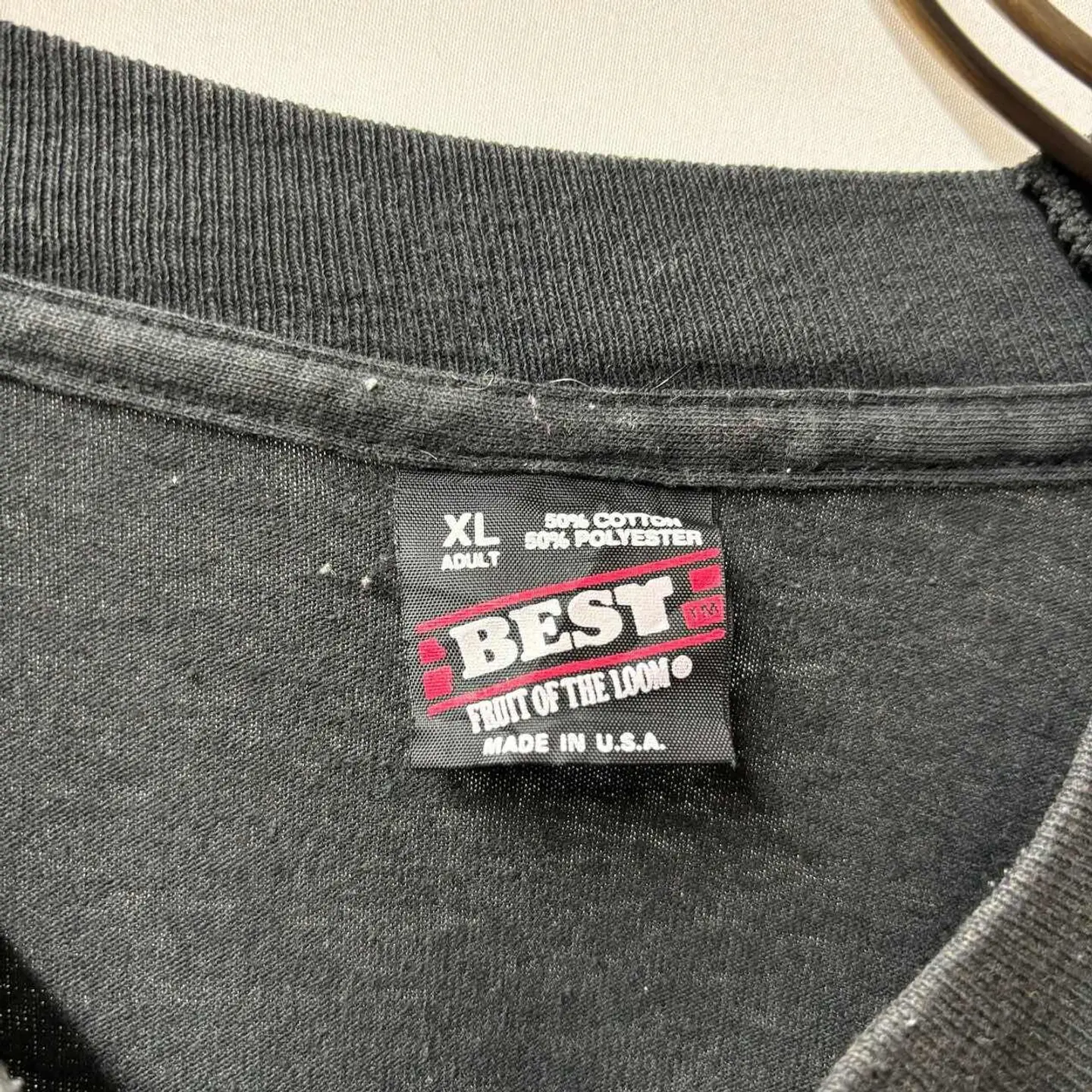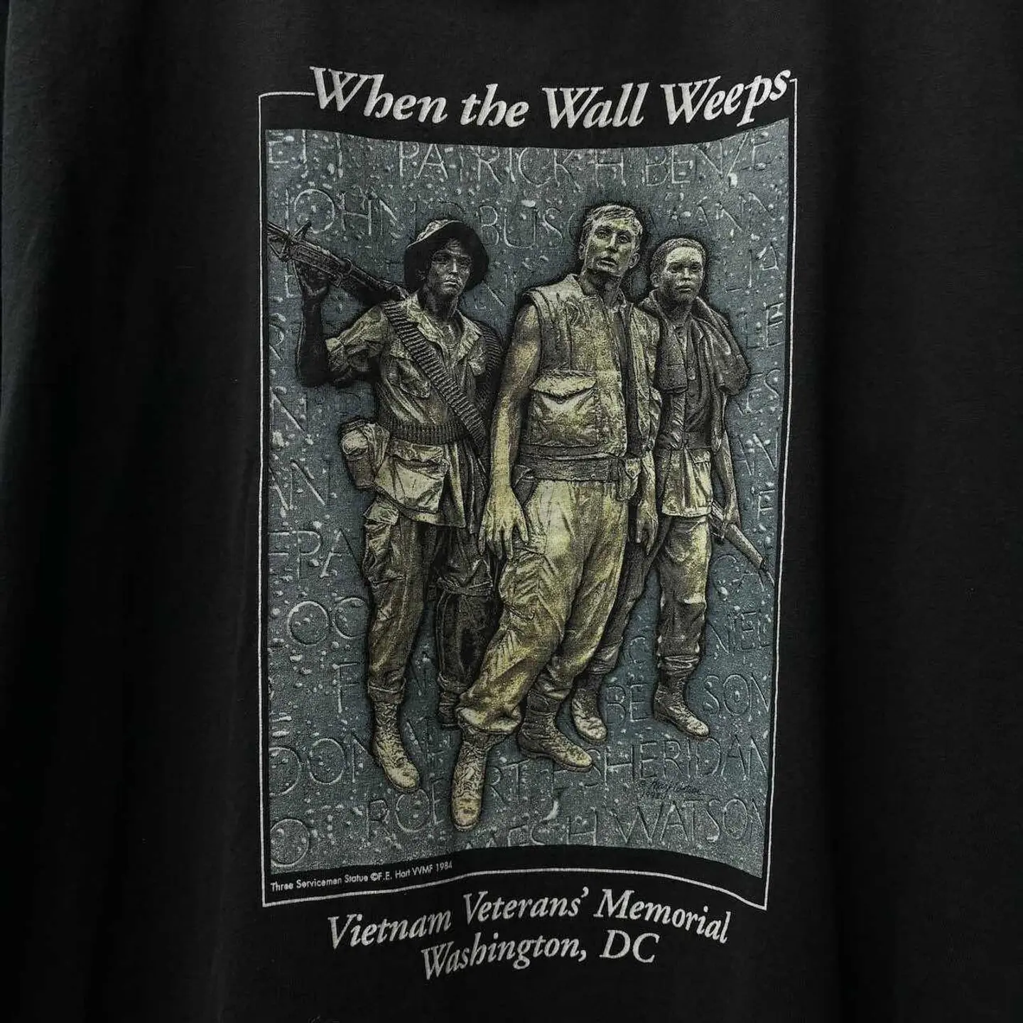アメリカの首都ワシントンD.C.にあるベトナム戦争戦没者慰霊碑「Vietnam Veterans Memorial」のモニュメント「Three Servicemen Statue」をモチーフにしたプリントTシャツ。 タイトルの「When the Wall Weeps(壁が涙を流すとき)」は、 戦没者の名前が刻まれた壁に映る自分の姿を見つめるベトナム帰還兵の気持ちを象徴した詩的なフレーズです。 時代背景や社会的なメッセージ性を感じさせる1着で、ストリートスタイルやモードな着こなしにも映えるアイテムです。 USA製、Fruit of the Loomの「BEST」タグ付きで素材はコットン×ポリエステル。 洗いざらしのような風合いと、程よいフェード感が古着らしい雰囲気を引き立てます。 ボトムスは軍パンやブラックデニムとの相性が抜群で、年代感あるスニーカーやブーツでまとめても◎ サイズ(表記:XL) 肩幅:55cm 袖丈:18cm 身幅:59cm 着丈:70cm ▶︎ 目安:170〜180cm前後の方におすすめ。 ゆったり着たい160cm台の方にも◎ 【素材・カラー・生産国】 素材:50%コットン、50%ポリエステル(プリシュランク) カラー:ブラック 生産国:アメリカ製 ブランド:Fruit of the Loom(BESTタグ) コンディション【B】 【コンディションランク】 S:新品・デッドストック A:使用感少なめでキレイ B:使用感あり(軽微な汚れ・シミあり) C:ややダメージあり D:大きなダメージあり スタイリング提案 ・軍パンやブラックデニムと合わせて、無骨なアメカジスタイルに ・インナーに白ロングスリーブを差して、90sレイヤードを楽しむのも◎ ・ジャケットのインナーにも存在感のあるプリントが映えます ご注意 ・古着商品のため、細かなキズや汚れがある場合があります ・一点物となりますので、気になる方はお早めにご購入ください ・ご利用のモニター環境により、色味が異なる場合があります #vintage #古着 #90s #used #古着男子 #80s #古着女子 #アメリカ古着