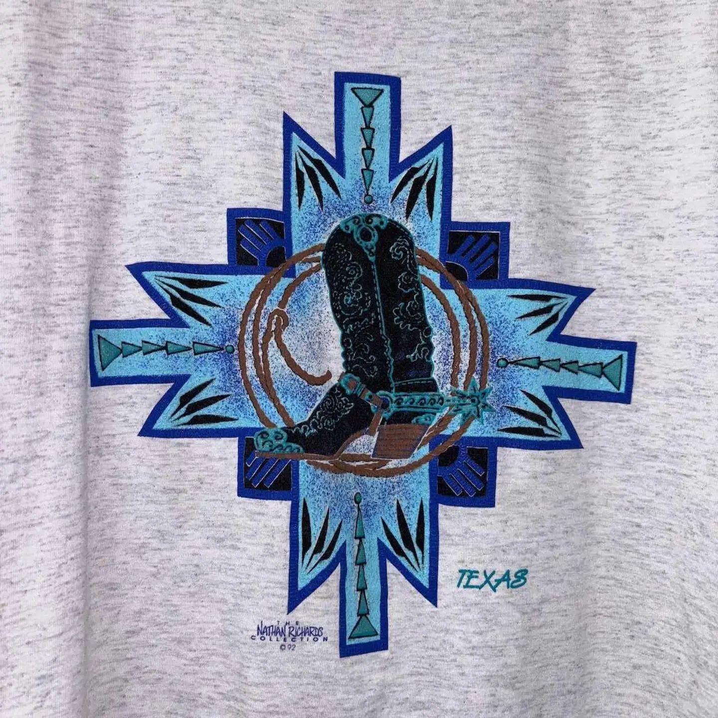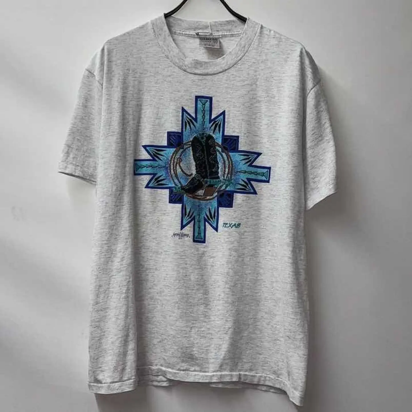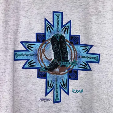 テキサス州を象徴するような、ウエスタンブーツとロープのグラフィックが印象的な90年代のTシャツ。 ブルー系のカラーリングでまとめられたプリントは、どこかネイティブアメリカンのモチーフも感じさせるデザインで、アートピースとしての存在感も◎ ボディはONEITA製のPOWER/50。霜降りグレーの杢調ボディは、ナチュラルでこなれた雰囲気。 USA製で、コットン×ポリのドライタッチな生地感が夏場にもちょうどいい1枚です。 ラフにデニムと合わせてカジュアルにも、スラックスで柄を引き立たせても◎ 男女問わずユニセックスでおすすめ。 サイズ(表記:XL) 肩幅:52cm 袖丈:22.5cm 身幅:52cm 着丈:70cm ▶︎ 目安:170〜180cm前後の方におすすめ。 ゆったり着たい160cm台の方にも◎ 【素材・カラー・生産国】 素材:コットン60%、ポリエステル40% カラー:霜降りグレー 生産国:アメリカ製 ブランド:ONEITA(POWER/50) コンディション【A】 【コンディションランク】 S:新品・デッドストック A:使用感少なめでキレイ B:使用感あり(軽微な汚れ・シミあり) C:ややダメージあり D:大きなダメージあり スタイリング提案 ・デニムに合わせてラフなアメカジスタイルに ・黒スラックスと合わせてグラフィックを際立たせたモードなコーデもおすすめ ご注意 ・古着商品のため、細かなキズや汚れがある場合があります ・一点物となりますので、気になる方はお早めにご購入ください ・ご利用のモニター環境により、色味が異なる場合があります #vintage #古着 #90s #used #古着男子 #80s #古着女子 #アメリカ古着