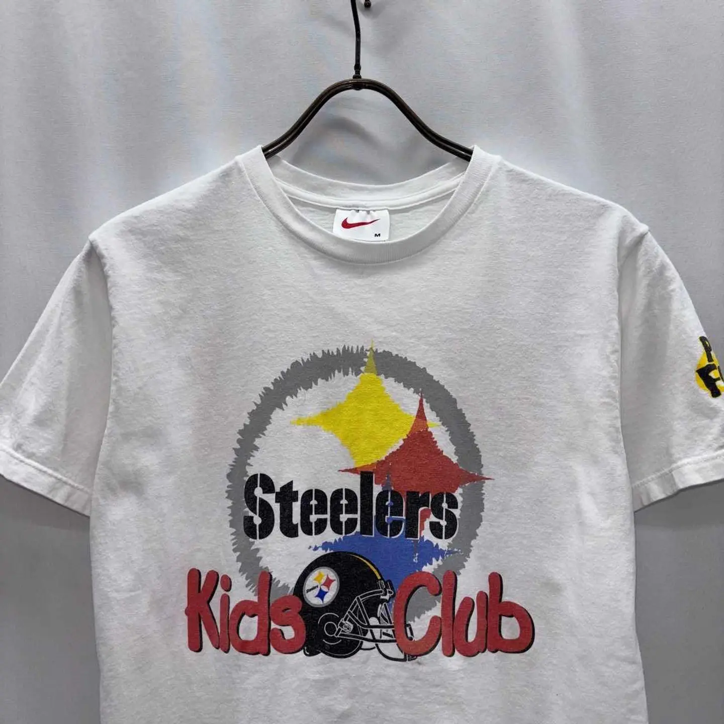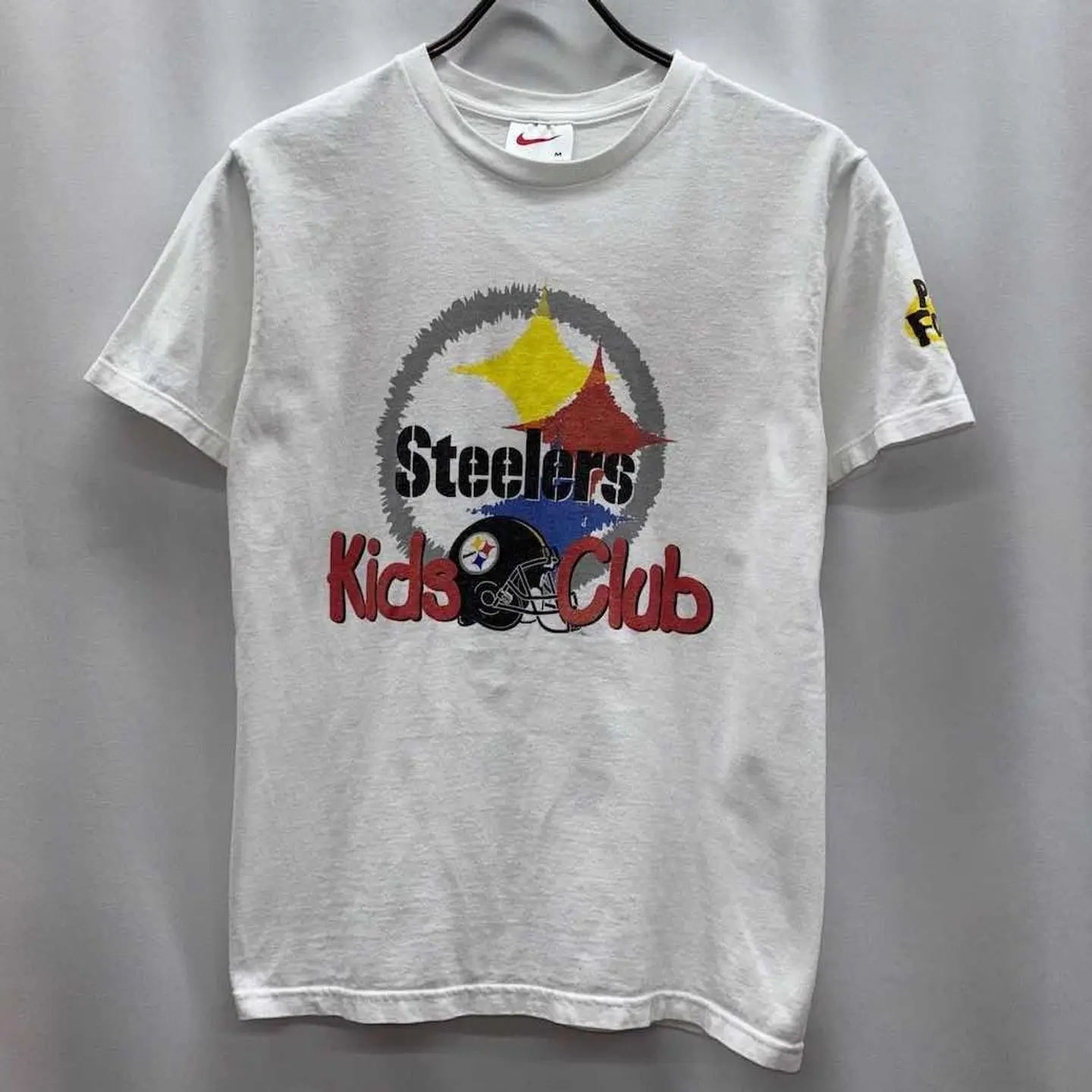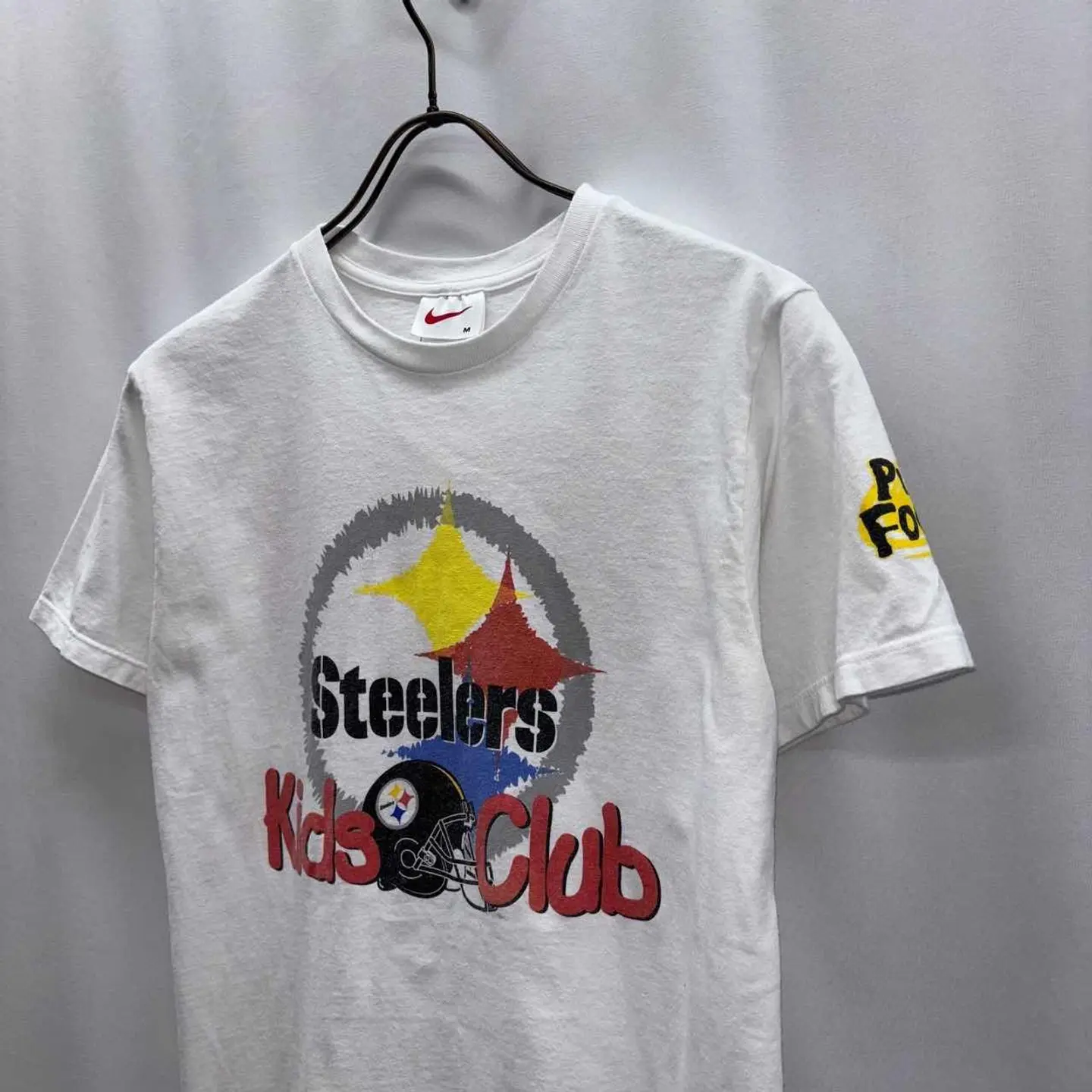 アメリカンフットボールチーム「Pittsburgh Steelers」のジュニアファン向け企画「Kids Club」のTシャツ。 フロントにはスティーラーズの象徴であるスリースターのロゴと、キッズ向けらしいポップなフォントでデザインされた“Kids Club”の文字。 サイドにはNFLロゴ入りの「Play Football」プリントが入り、さらにバックにはNikeとNFLが主導した青少年支援プロジェクト「P.L.A.Y.(Participate in the Lives of America's Youth)」のメッセージロゴを大胆に配置。 ホワイトボディに3か所のプリントが施される贅沢な仕様で、スポーツ・カルチャー・教育支援の文脈が交差したレアな1着。 90年代Nike × NFLの貴重なアーカイブで、コレクターズピースとしても人気が高いです。 サイズ(表記:M) 肩幅:42cm 袖丈:17cm 身幅:44cm 着丈:58cm ▶︎ 目安:160〜170cm前後の方におすすめ。 ジャストで着たい150cm台の方にも◎ 【素材・カラー・生産国】 素材:100% Cotton カラー:ホワイト 生産国:USA製 ブランド:NIKE コンディション【B】(小さな汚れあり) 【コンディションランク】 S:新品・デッドストック A:使用感少なめでキレイ B:使用感あり(軽微な汚れ・シミあり) C:ややダメージあり D:大きなダメージあり スタイリング提案 ・バギーデニムやカーゴパンツでアメリカンスポーツMIX ・インナーにロンTを合わせてストリートライクに ご注意 ・古着商品のため、細かなキズや汚れがある場合があります ・一点物となりますので、気になる方はお早めにご購入ください ・ご利用のモニター環境により、色味が異なる場合があります #vintage #古着 #90s #used #古着男子 #80s #古着女子 #アメリカ古着