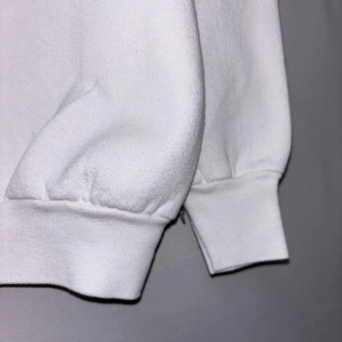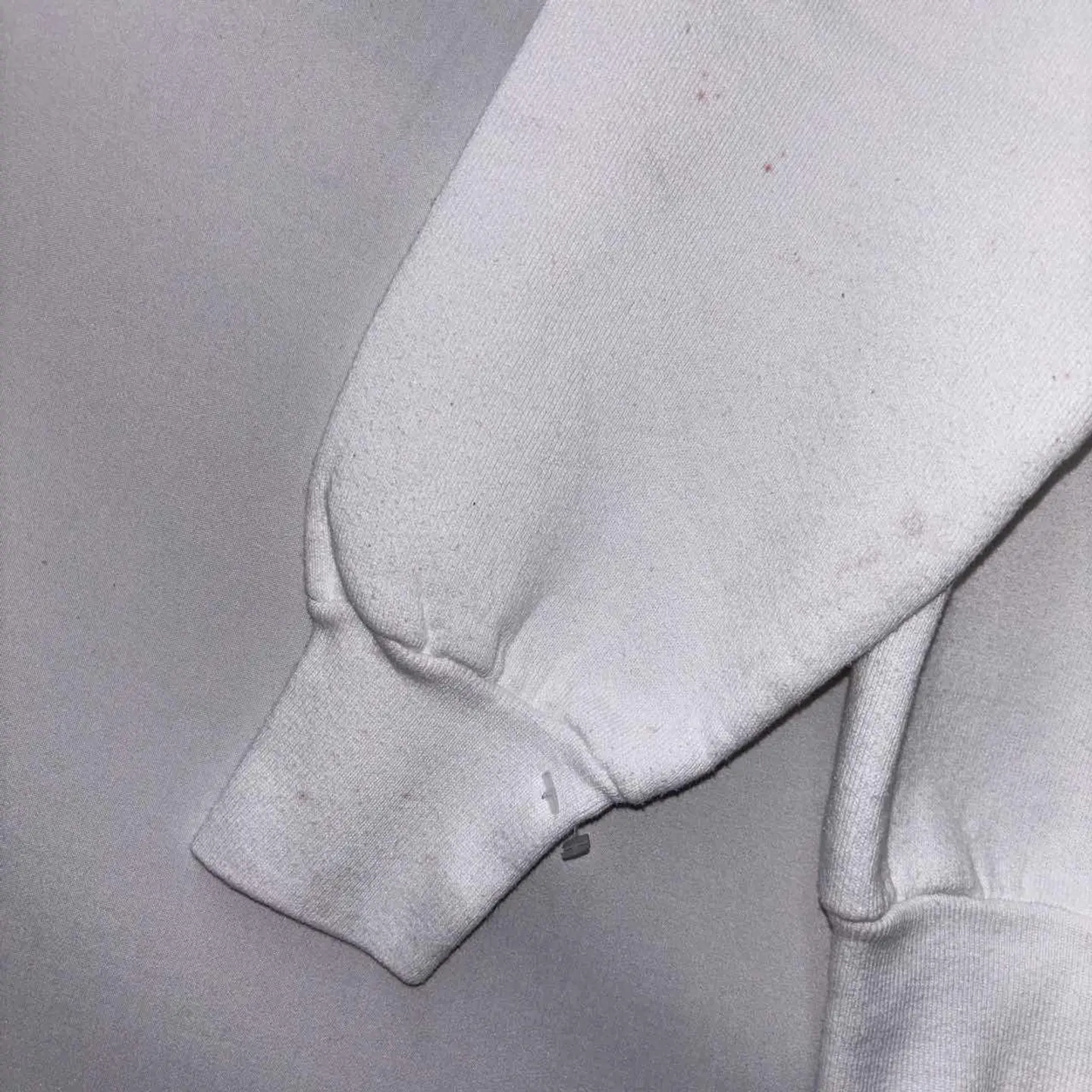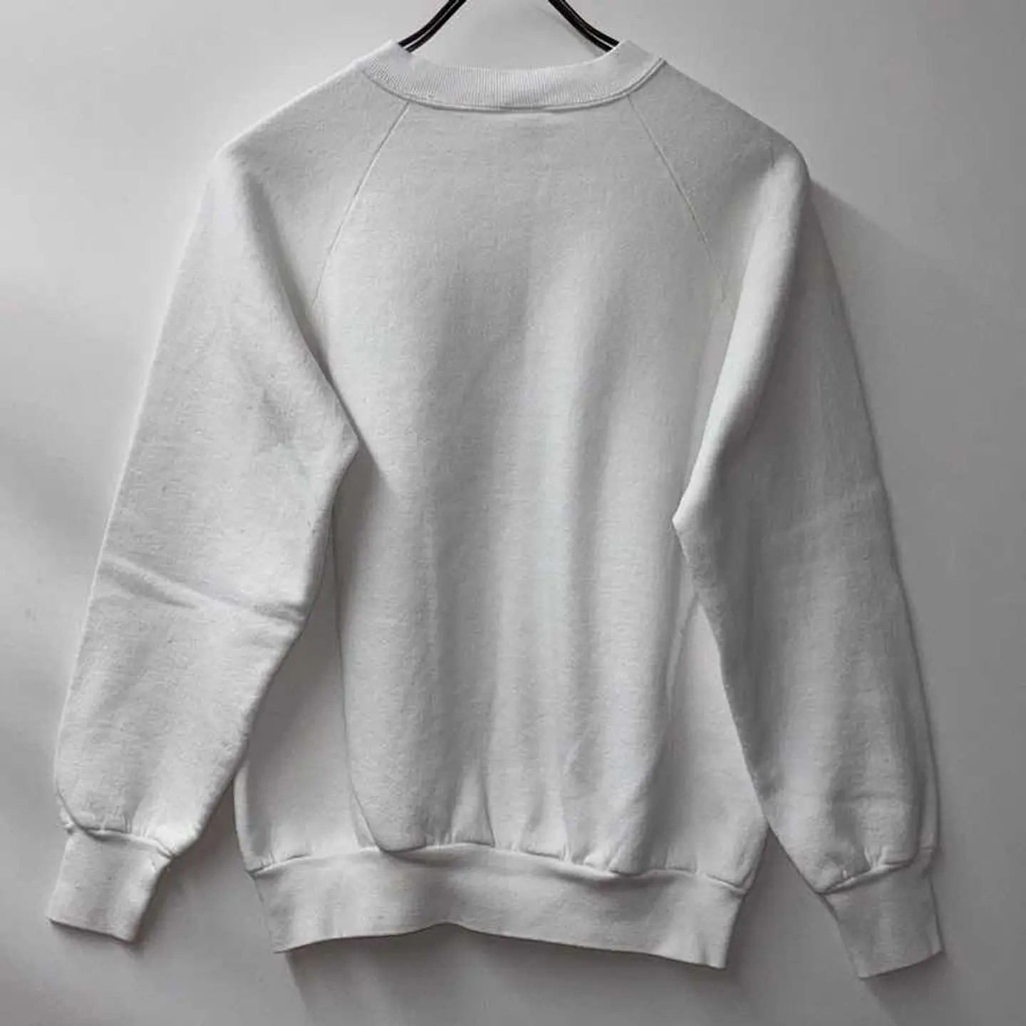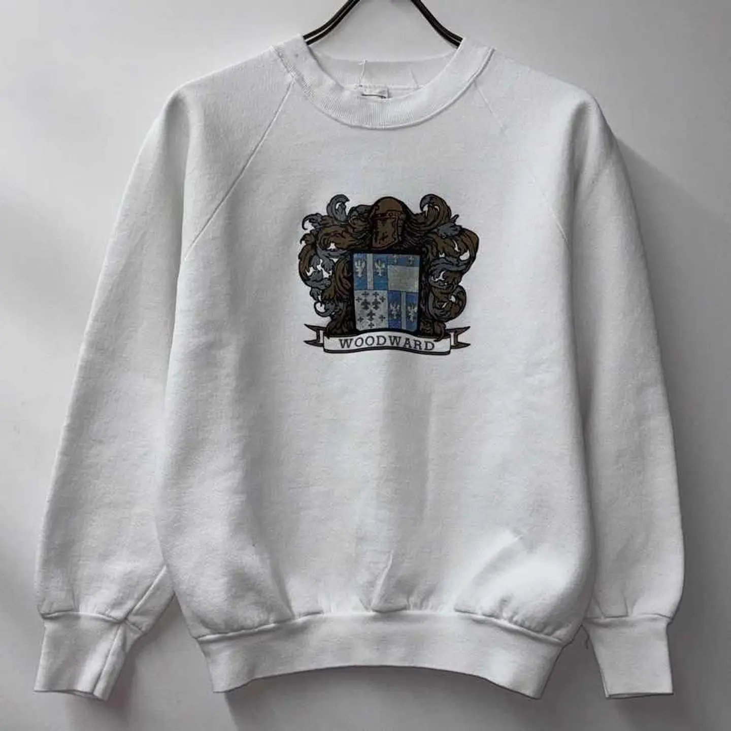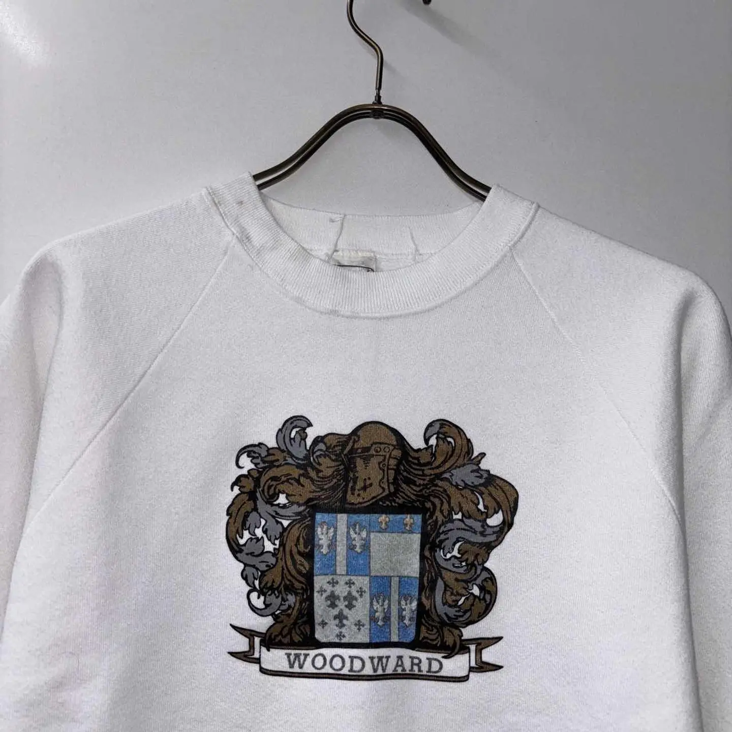 フロントに大きく配されたのは、「WOODWARD(ウッドワード)」姓に由来する紋章(クレスト)のプリント。 クラシックな兜と盾を中央に、アカンサス風の装飾がフレームのように左右に広がるデザイン。紋章にはユリ(フルール・ド・リス)や十字モチーフが組み合わされ、中世の騎士的な雰囲気を感じさせます。 ホワイトボディに繊細なカラーリングのプリントが映え、ストリートにもトラッドにも合わせやすい1枚です。 サイズ(表記:M) 肩幅:-(ラグランスリーブ) 裄丈:70cm 着丈:54cm 身幅:48cm ▶︎ 目安:160〜170cm前後の方におすすめ。 ゆったり着たい150cm台の方にも◎ 【素材・カラー・生産国】 素材:コットン(推定) カラー:ホワイト 生産国:USA製 ブランド:FRUIT OF THE LOOM(フルーツオブザルーム) コンディション【B】 【コンディションランク】 S:新品・デッドストック A:使用感少なめでキレイ B:使用感あり(軽微な汚れ・シミあり) C:ややダメージあり D:大きなダメージあり スタイリング提案 ・リーバイス501と合わせて王道アメカジに ・スラックスやローファーと合わせてプレッピーにも ご注意 ・古着商品のため、細かなキズや汚れがある場合があります ・一点物となりますので、気になる方はお早めにご購入ください ・ご利用のモニター環境により、色味が異なる場合があります #vintage #古着 #90s #used #古着男子 #80s #古着女子 #アメリカ古着