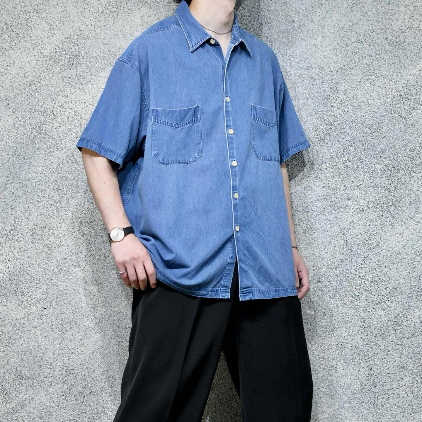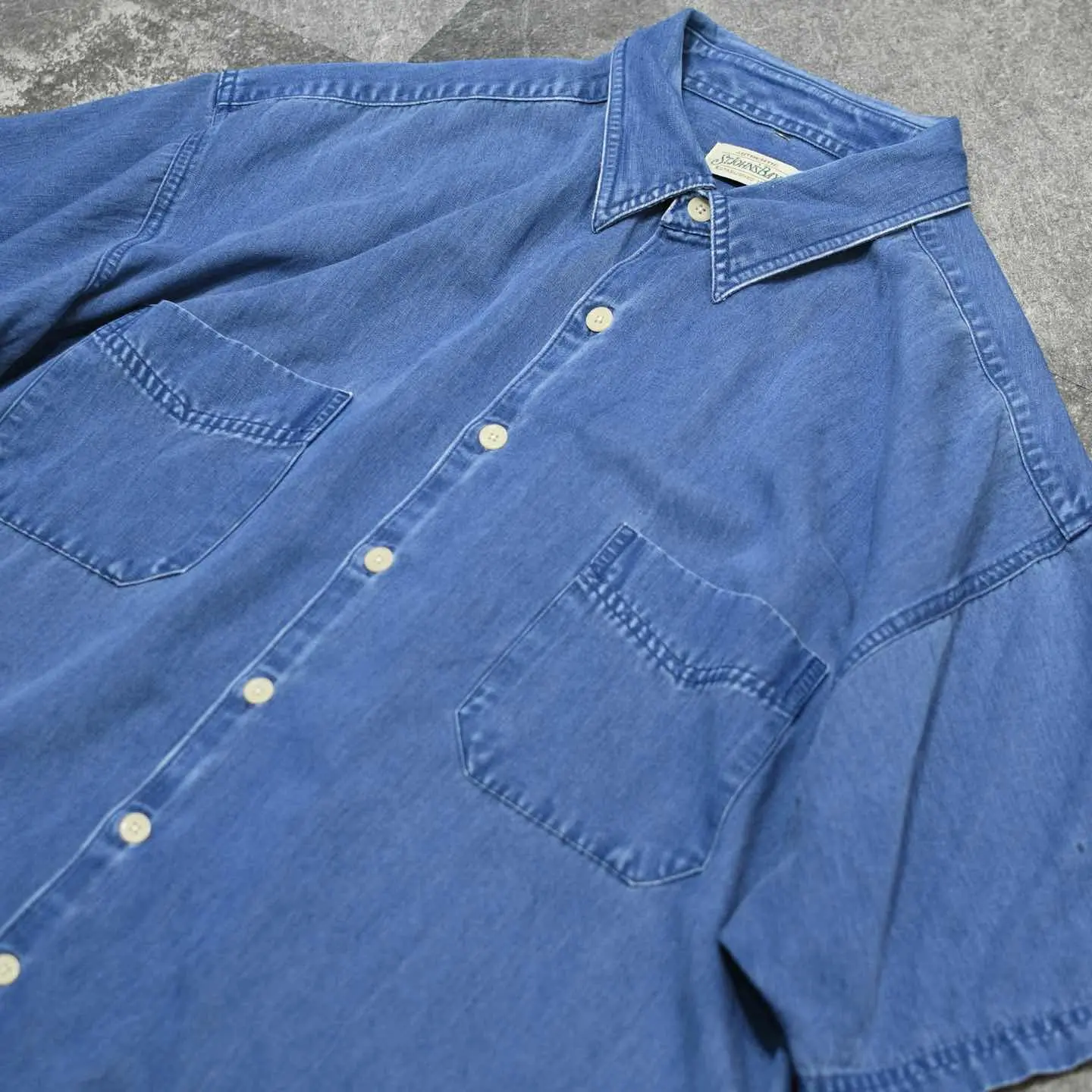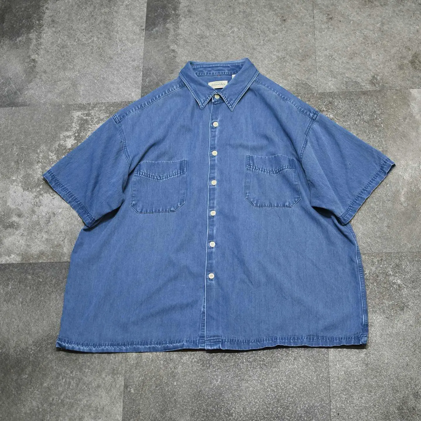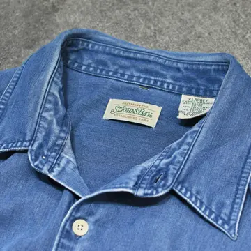 着丈78cm 肩幅61cm 身幅72cm 袖丈26cm fabric/rayon・poly・cotton 着用画像 177cm/64kg アメリカの老舗デパートであり、 3大ストアブランド"JC Penny"ですが そのプライベートブランドとして始まった "St.John's Bay" アメカジの印象があったブランドでしたが、 中でもこちらは異端な1着。 綾織り、そしてインディゴ染め。 一見デニムシャツのように見えますが、 レーヨンを主とした生地をインディゴ染め、 コットンを主としたデニムでは味わえない 落ち感のある抜群のシルエットを兼ね備えた 逸品です。 見た目に反した肌触りの良さ、そして意外性。 個人的に唸ったアイテムです。 ※袖に軽度の汚れあり。 ※撮影状況により、実物と多少色が異なる場合が ございます。 ※古着を取り扱っているため、気づかない汚れや ほつれ等がある場合がございます。 予めご了承ください。 ※サイズは着用感で選んでおり、表記サイズではございません。 古着 オーバーサイズ old vintage ヴィンテージ used 80's 90's アメリカ古着 ユーロ古着 メンズ レディース POLO RALPH LAUREN Eddie Bauer OLD GAP Eddie Bauer LANDS' END ランズエンド LLBean エルエルビーン オールドギャップ エディーバウアー ラルフローレン ブルックスブラザーズ Brooks Brothers ネイビー 紺色 ブルー 青 半袖シャツ デザインシャツ セントジョンズベイ デニムシャツ などがお好きな方 #vintage #オーバーサイズ #old #used #90s #80s #古着 #ヴィンテージ #アメリカ古着 #ユーロ古着 #古着男子 #古着女子 #LLBean #エルエルビーン #EddieBauer #エディーバウアー #oldgap #オールドギャップ #LANDSEND #ランズエンド #NAUTICA #ノーティカ #ラルフローレン #POLORALPHLAUREN #ブルックスブラザーズ #BrooksBrothers #デニムシャツ #半袖シャツ #レーヨンシャツ #インディゴ染め #デザインシャツ #セントジョンズベイ