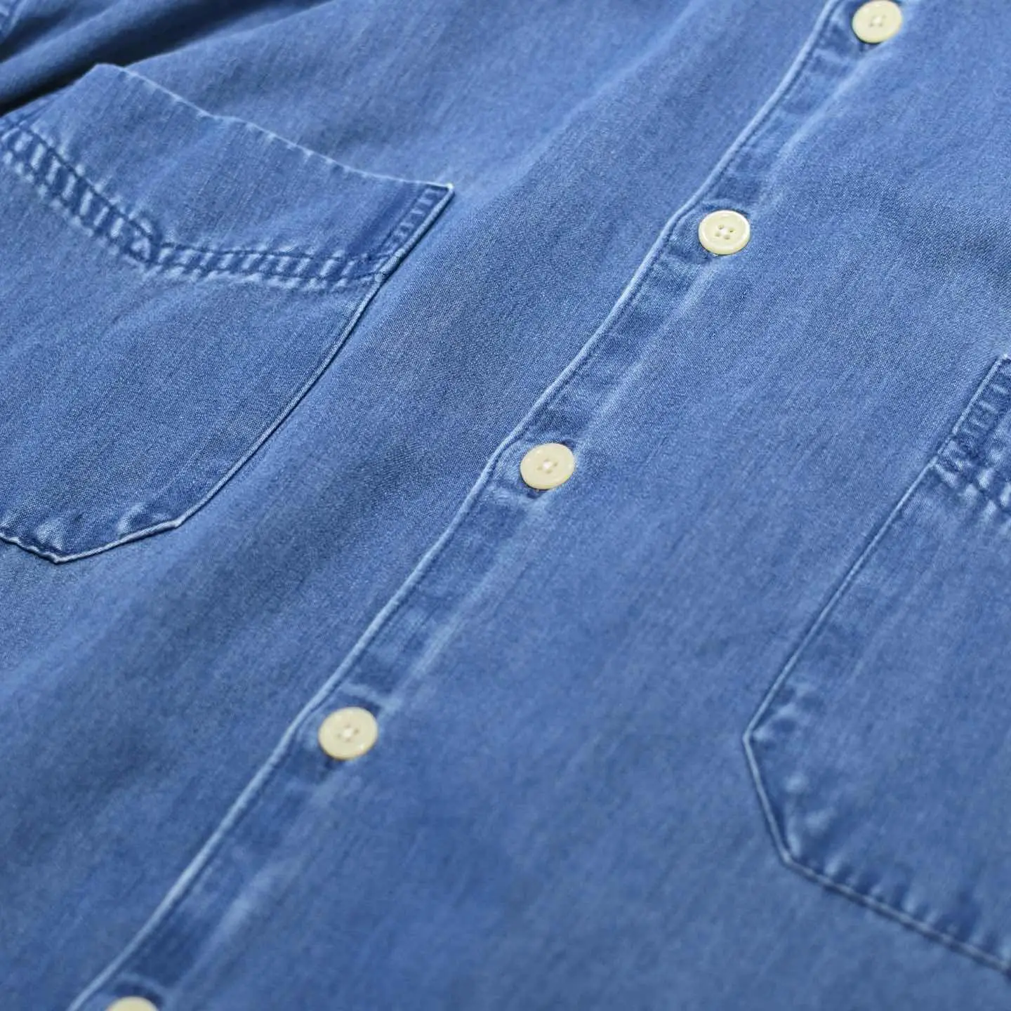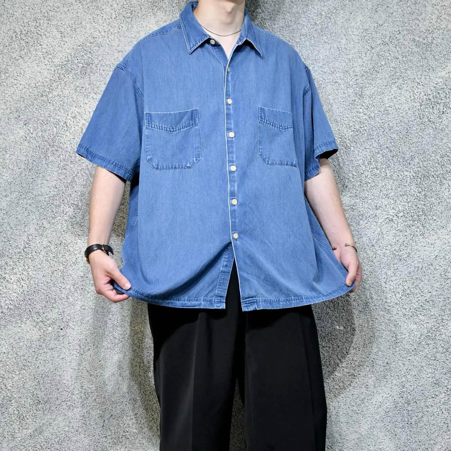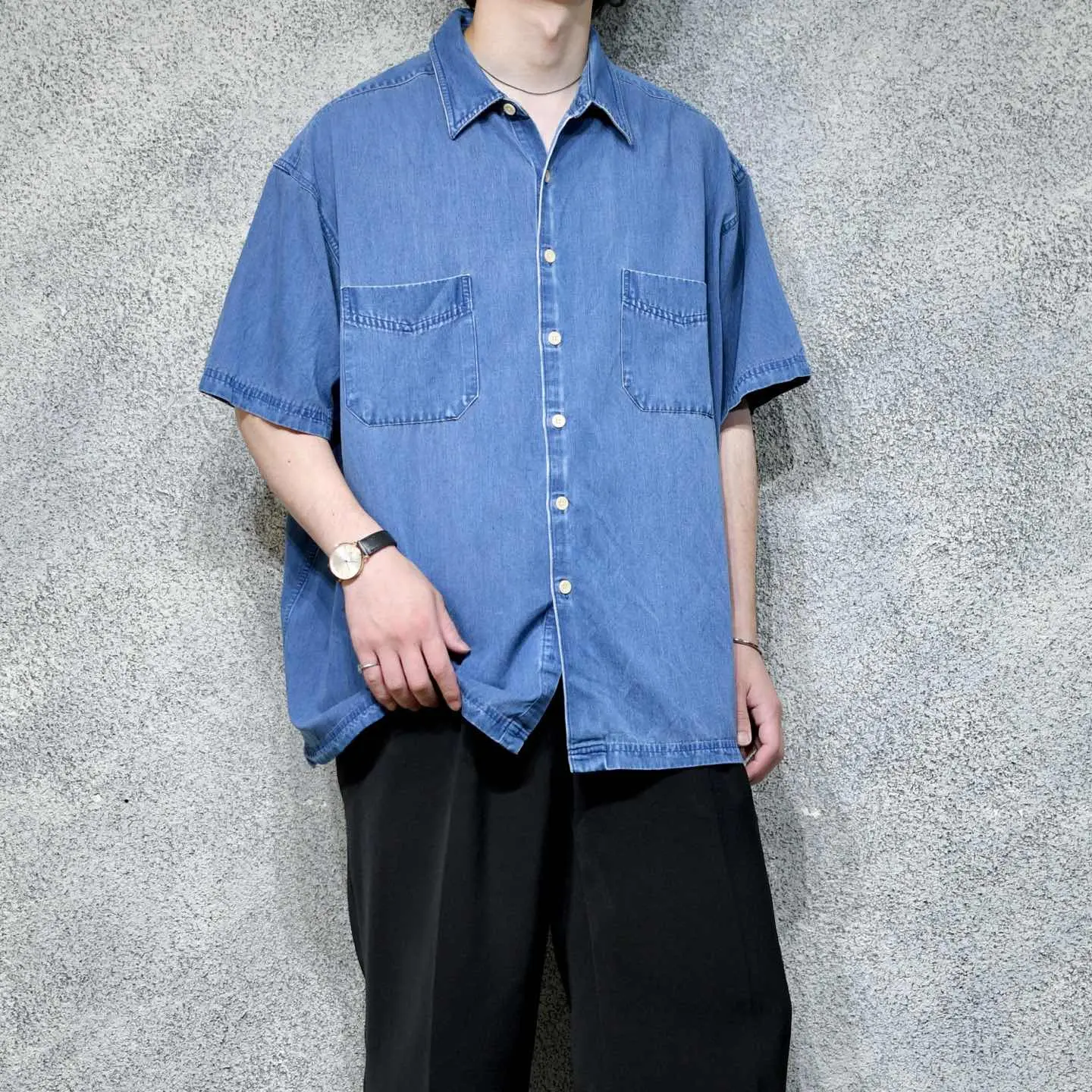 着丈78cm 肩幅61cm 身幅72cm 袖丈26cm fabric/rayon・poly・cotton 着用画像 177cm/64kg アメリカの老舗デパートであり、 3大ストアブランド"JC Penny"ですが そのプライベートブランドとして始まった "St.John's Bay" アメカジの印象があったブランドでしたが、 中でもこちらは異端な1着。 綾織り、そしてインディゴ染め。 一見デニムシャツのように見えますが、 レーヨンを主とした生地をインディゴ染め、 コットンを主としたデニムでは味わえない 落ち感のある抜群のシルエットを兼ね備えた 逸品です。 見た目に反した肌触りの良さ、そして意外性。 個人的に唸ったアイテムです。 ※袖に軽度の汚れあり。 ※撮影状況により、実物と多少色が異なる場合が ございます。 ※古着を取り扱っているため、気づかない汚れや ほつれ等がある場合がございます。 予めご了承ください。 ※サイズは着用感で選んでおり、表記サイズではございません。 古着 オーバーサイズ old vintage ヴィンテージ used 80's 90's アメリカ古着 ユーロ古着 メンズ レディース POLO RALPH LAUREN Eddie Bauer OLD GAP Eddie Bauer LANDS' END ランズエンド LLBean エルエルビーン オールドギャップ エディーバウアー ラルフローレン ブルックスブラザーズ Brooks Brothers ネイビー 紺色 ブルー 青 半袖シャツ デザインシャツ セントジョンズベイ デニムシャツ などがお好きな方 #vintage #オーバーサイズ #old #used #90s #80s #古着 #ヴィンテージ #アメリカ古着 #ユーロ古着 #古着男子 #古着女子 #LLBean #エルエルビーン #EddieBauer #エディーバウアー #oldgap #オールドギャップ #LANDSEND #ランズエンド #NAUTICA #ノーティカ #ラルフローレン #POLORALPHLAUREN #ブルックスブラザーズ #BrooksBrothers #デニムシャツ #半袖シャツ #レーヨンシャツ #インディゴ染め #デザインシャツ #セントジョンズベイ