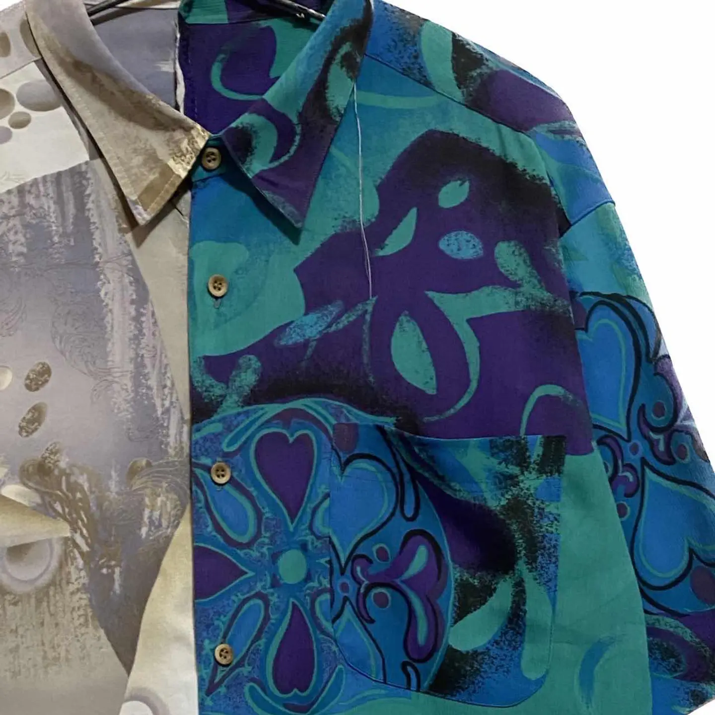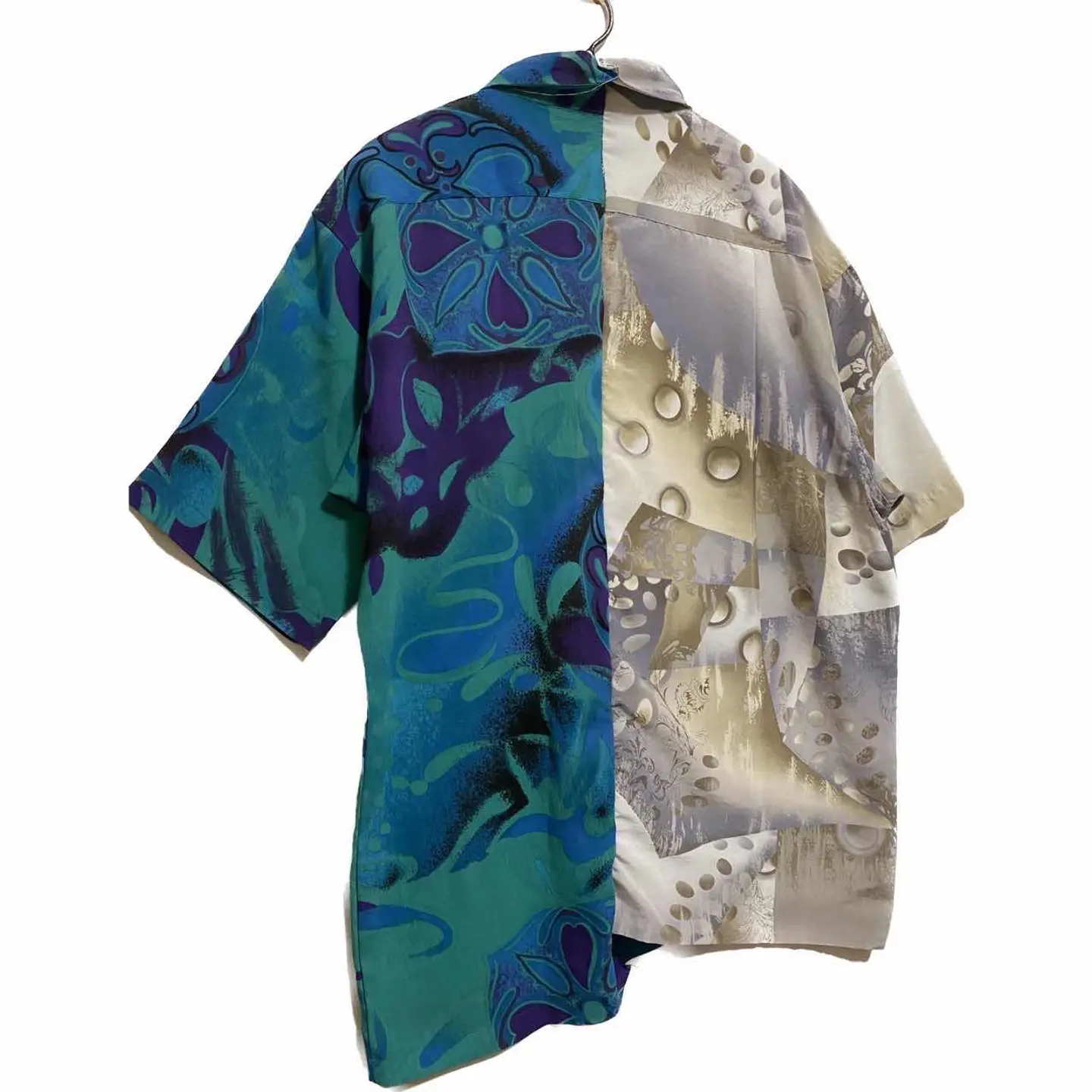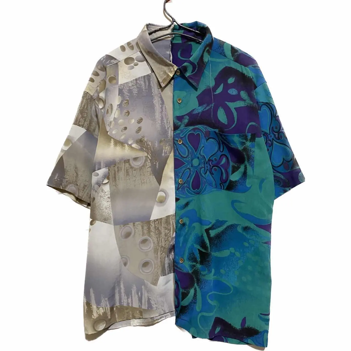 リメイク vintage center switch docking S/S シャツ 70年代のシャツは、サイケデリック柄、幾何学模様、花柄、アブストラクト柄などが多く、視覚的インパクトが非常に強いのが特徴です。 また、シルエットにも特徴があって、スタイリッシュに決まるのも魅力ですね。 そんなヴィンテージを2着使用して、世界に1つのシャツをリメイクでつくりました。センタースイッチドッキングと言う真ん中から切り替える技法を使い個性をプラスしました。癖が強く見えがちな柄シャツですが、意外とフォーマルに決まったりするのも魅力です。 今回は少し60年代テイストを取り入れたコーディネートにして大人のモダンミックスカジュアルです、 独特の色気が出るコーディネートですので、ぜひ参考になりましたらご購入ください 【カラー】 写真通り サイズL XLもいけそう 着丈73/76左右チョイ非対処 身幅58 肩幅54DS 袖丈38↓ DSは。袖は、ハンガー肩落ちから採寸 【素材】 70sポリと、テクスチャー 【状態】 良い