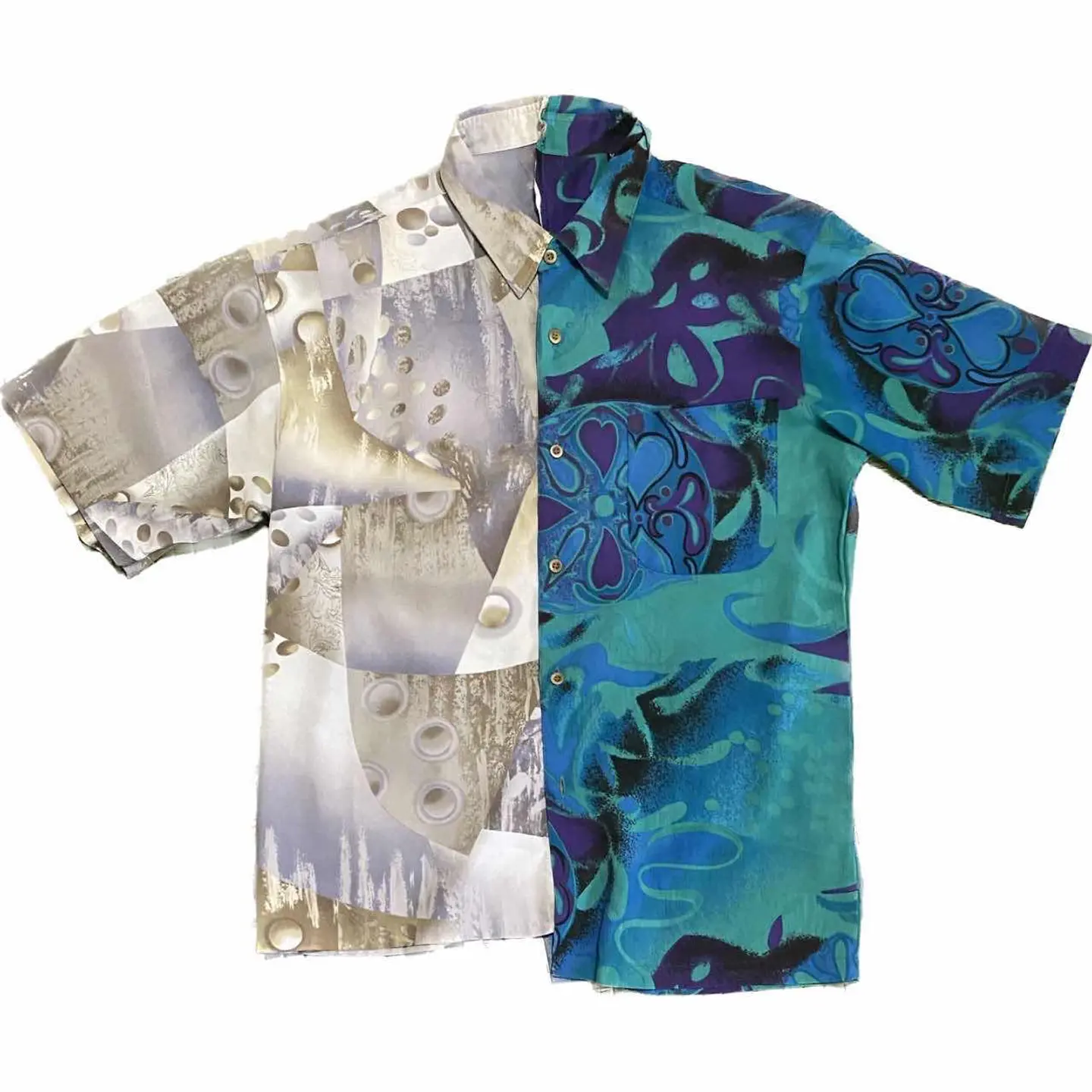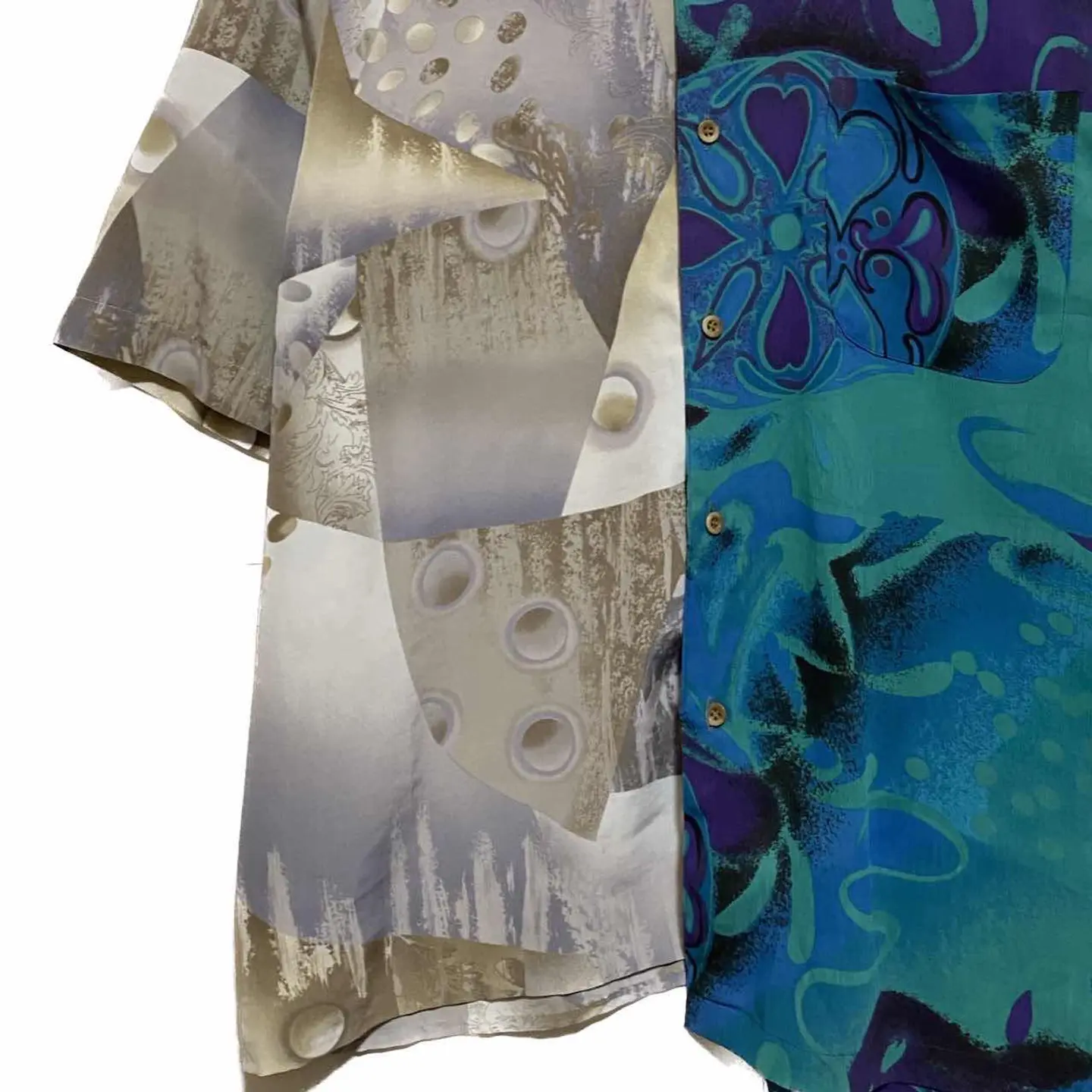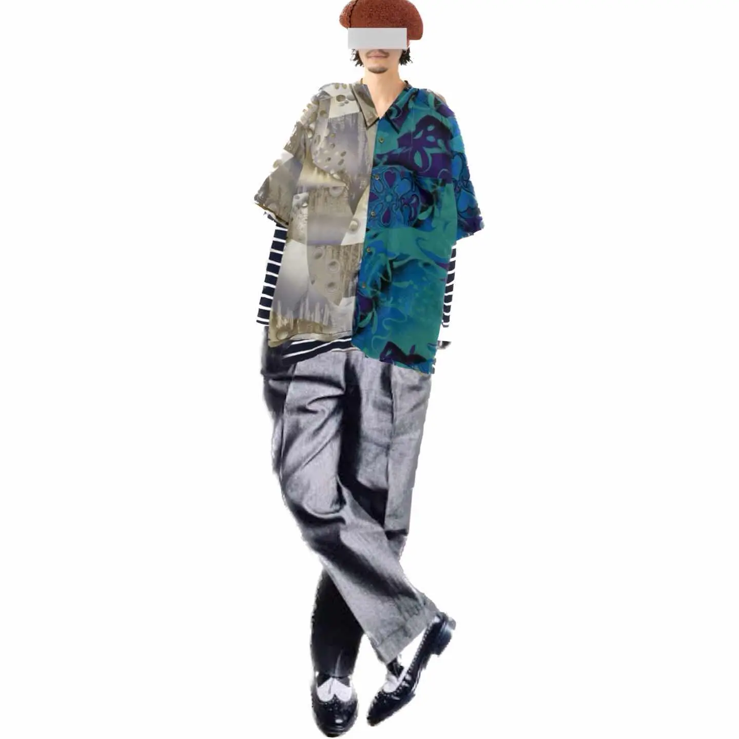 リメイク vintage center switch docking S/S シャツ 70年代のシャツは、サイケデリック柄、幾何学模様、花柄、アブストラクト柄などが多く、視覚的インパクトが非常に強いのが特徴です。 また、シルエットにも特徴があって、スタイリッシュに決まるのも魅力ですね。 そんなヴィンテージを2着使用して、世界に1つのシャツをリメイクでつくりました。センタースイッチドッキングと言う真ん中から切り替える技法を使い個性をプラスしました。癖が強く見えがちな柄シャツですが、意外とフォーマルに決まったりするのも魅力です。 今回は少し60年代テイストを取り入れたコーディネートにして大人のモダンミックスカジュアルです、 独特の色気が出るコーディネートですので、ぜひ参考になりましたらご購入ください 【カラー】 写真通り サイズL XLもいけそう 着丈73/76左右チョイ非対処 身幅58 肩幅54DS 袖丈38↓ DSは。袖は、ハンガー肩落ちから採寸 【素材】 70sポリと、テクスチャー 【状態】 良い